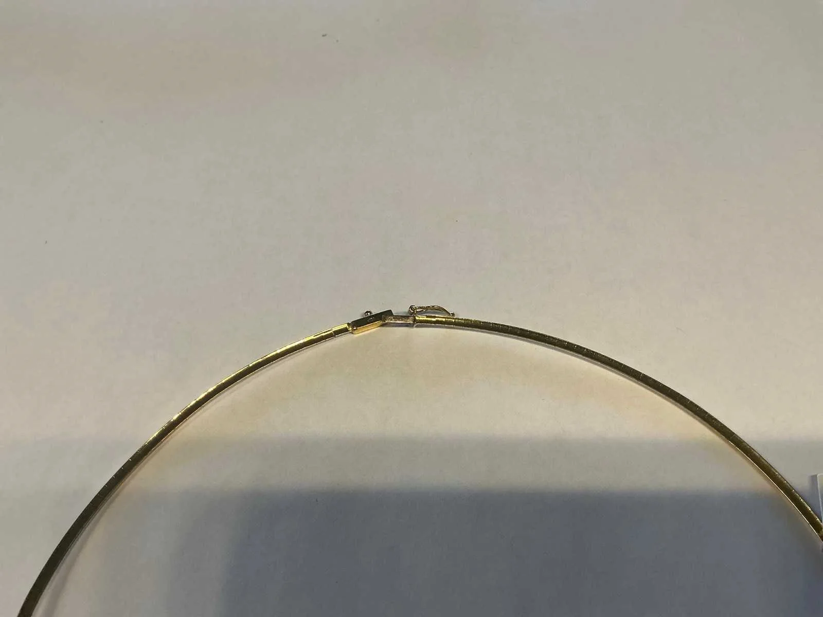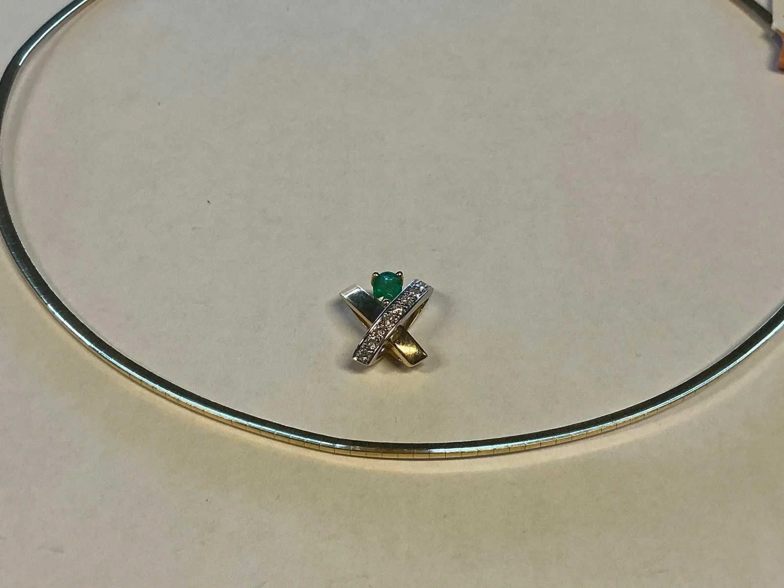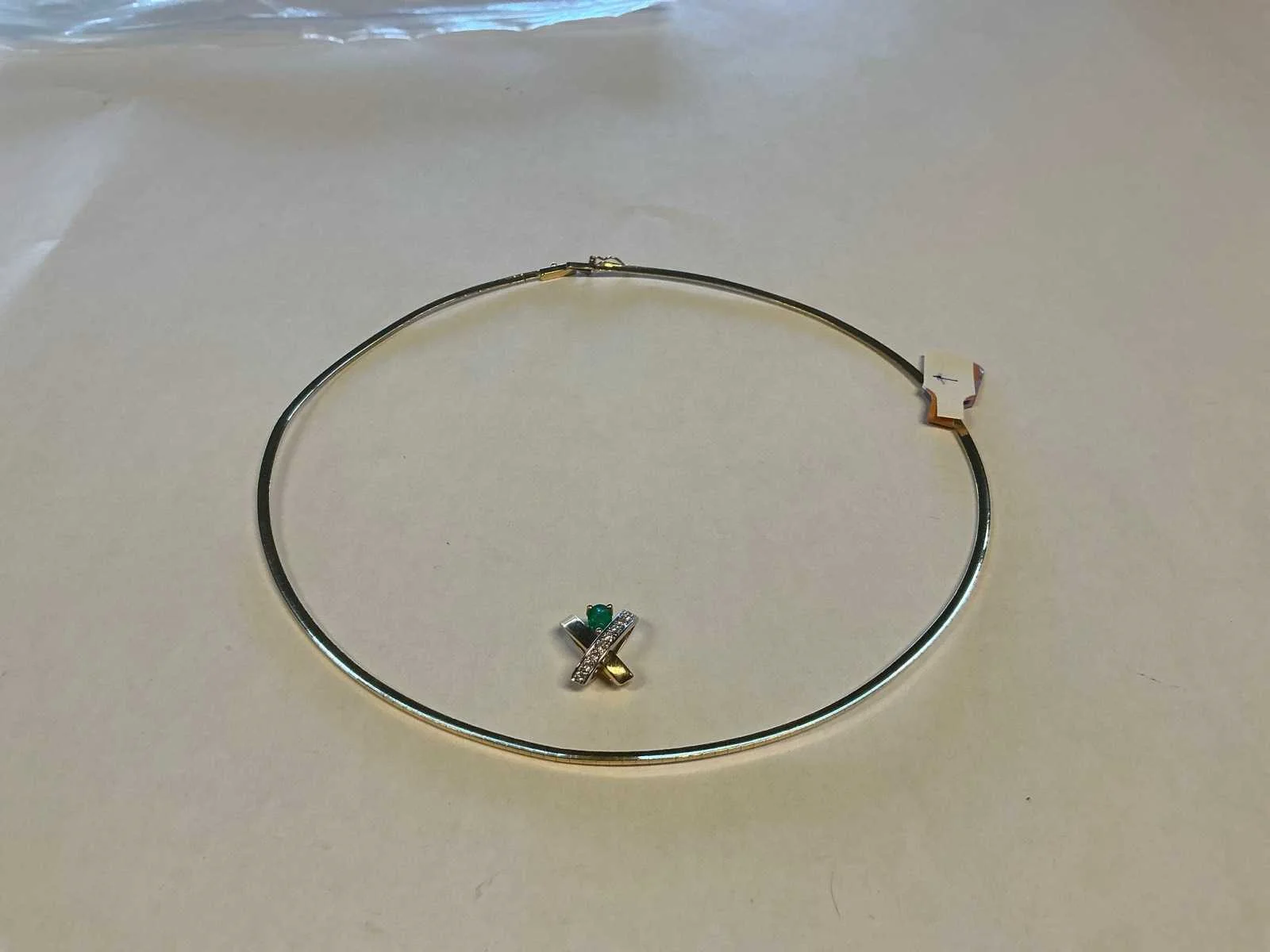 Een 18 karaats (750/000) geelgouden choker, waaraan een 18 karaats (750/000) geelgouden hanger. Hanger in de vorm van een X, één zijde pavé bezet met briljant geslepen diamanten, centraal een ovale gefacetteerde smaragd. Bruto gewicht: 12,6 gram. Model: 18 krt geelgouden