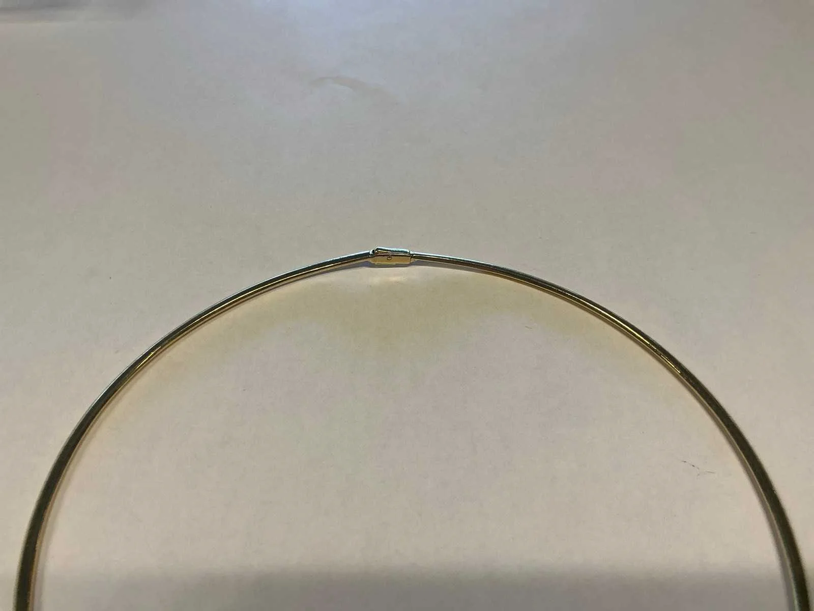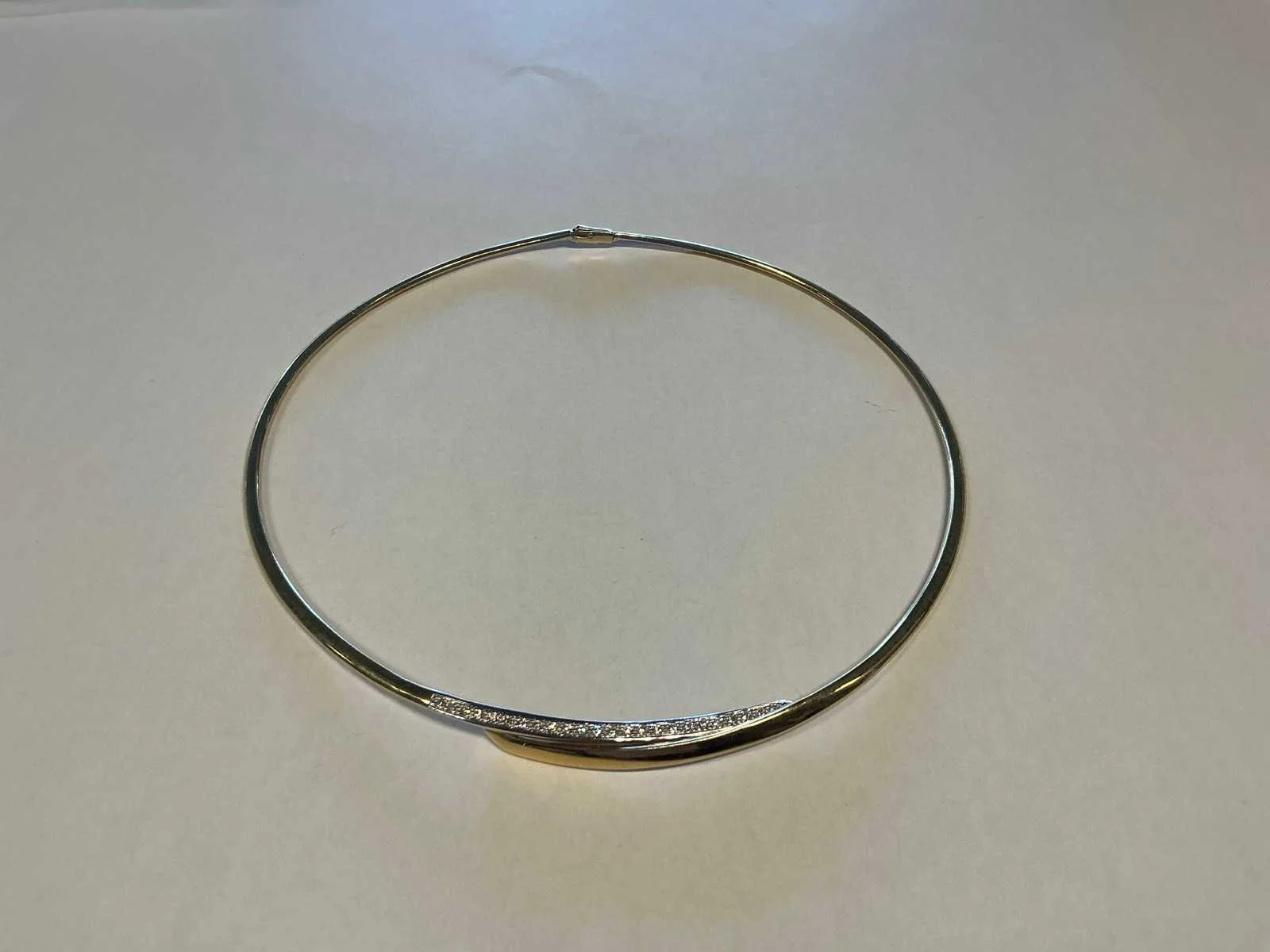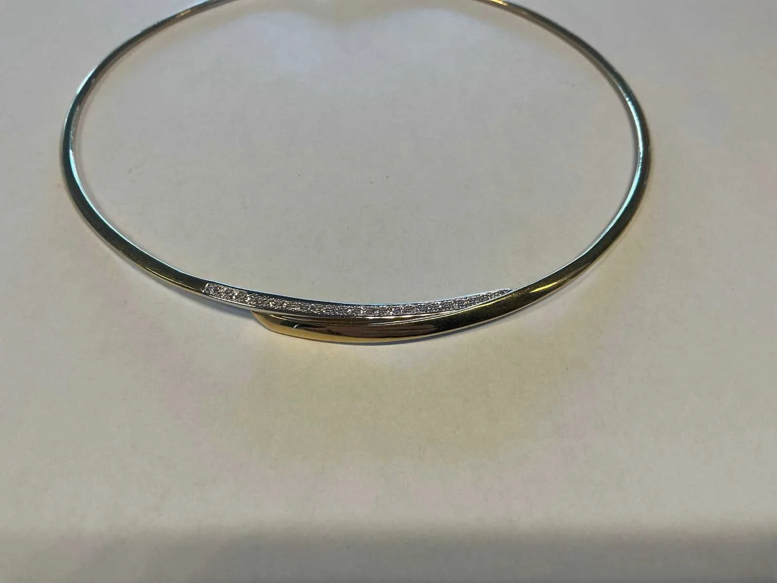 Een 18 karaats (750/000) wit- en geelgouden choker. In het midden pavé bezet met briljant geslepen diamanten, totaal ca. 0,50ct., kleur ca. H, zuiverheid ca. VSI. Bruto gewicht: 24,1 gram. Model: 18 krt wit- en geelgouden