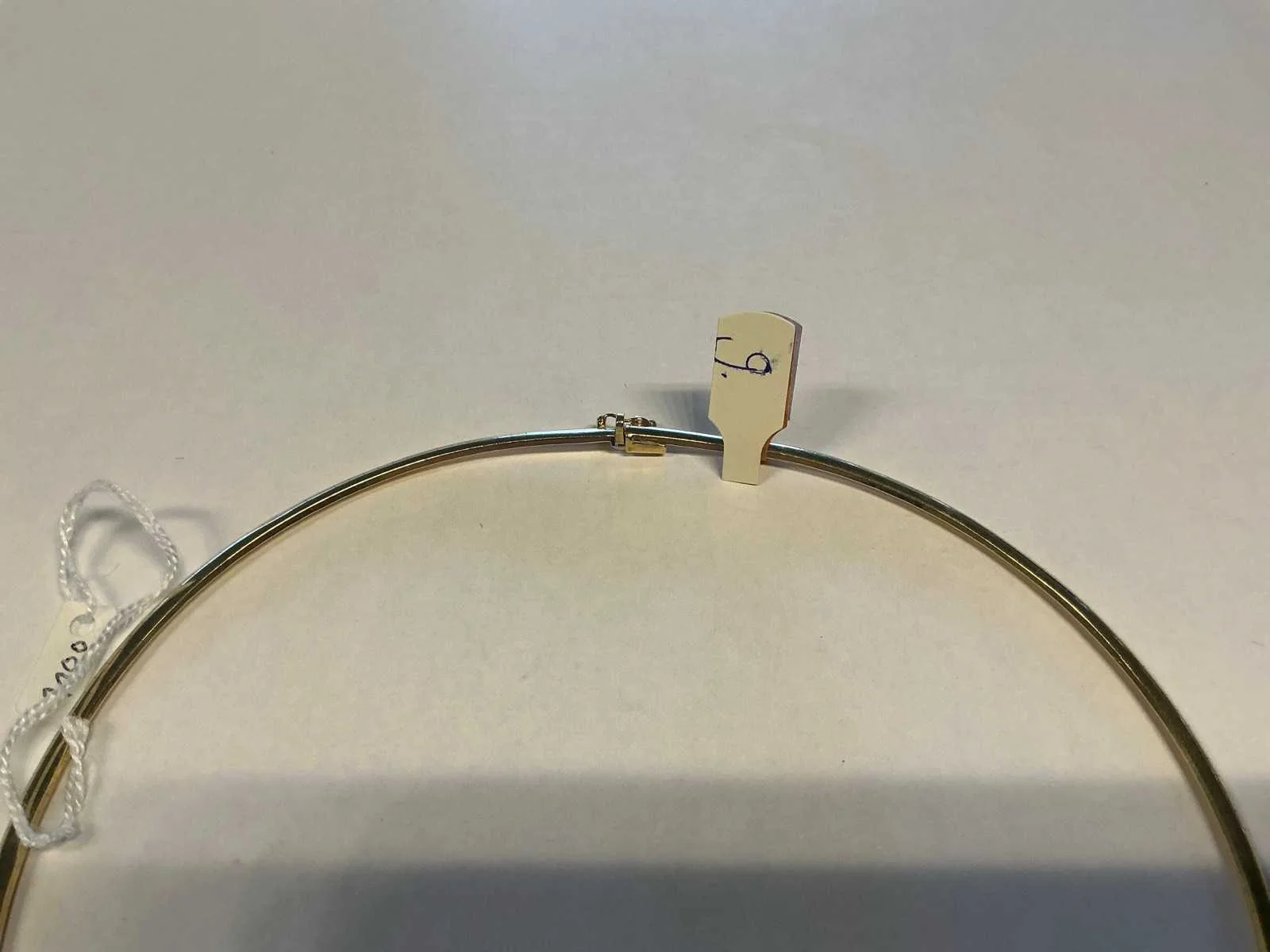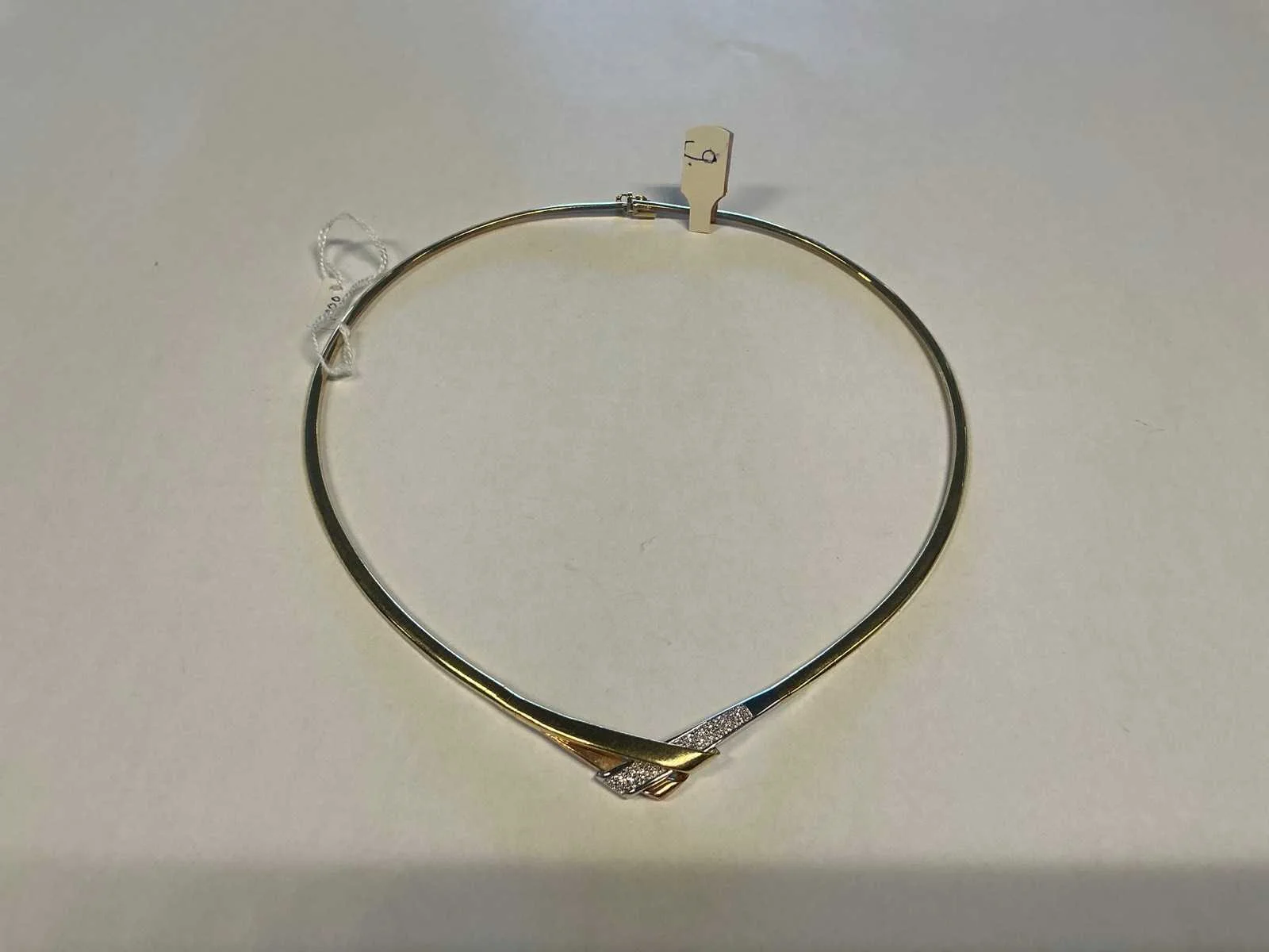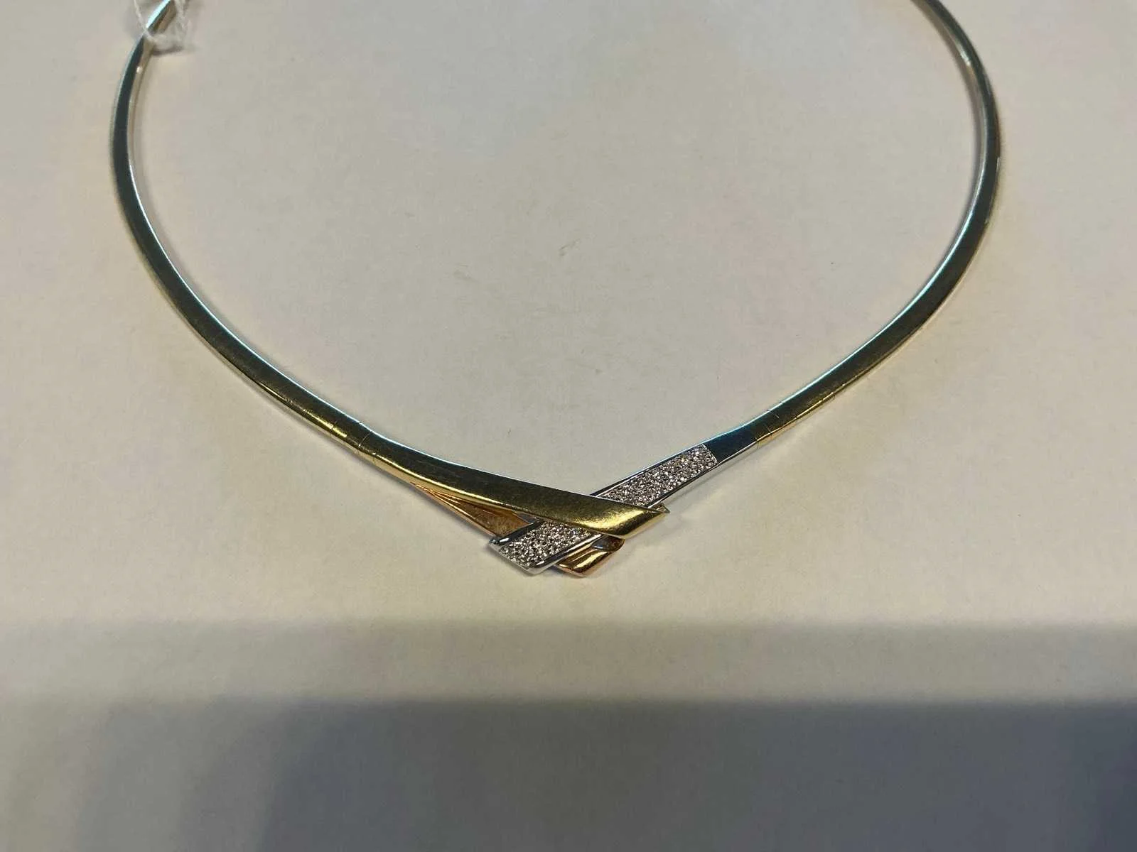 Een 18 karaats (750/000) geelgouden choker. In het midden een V-vorm, één zijde witgoud en pavé bezet met briljant geslepen diamanten. Bruto gewicht: 23,4 gram. Model: 18 krt geelgouden