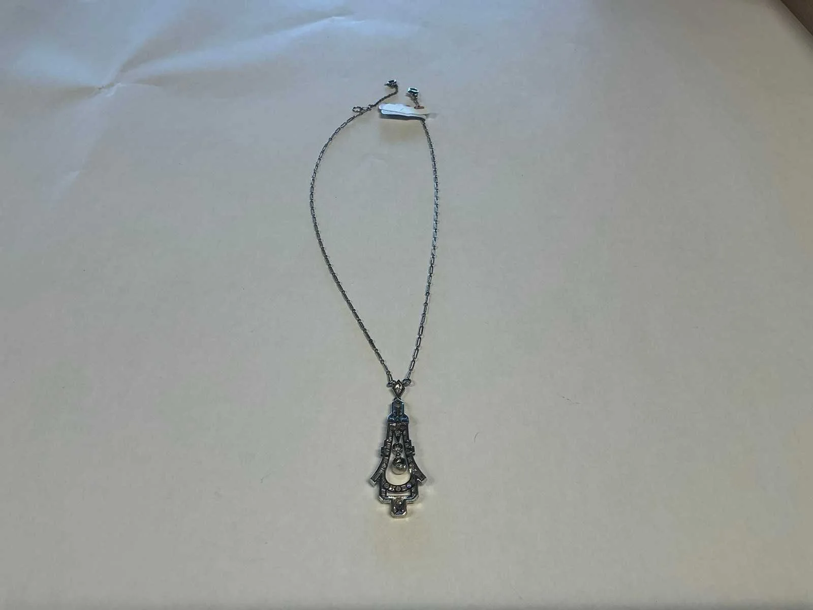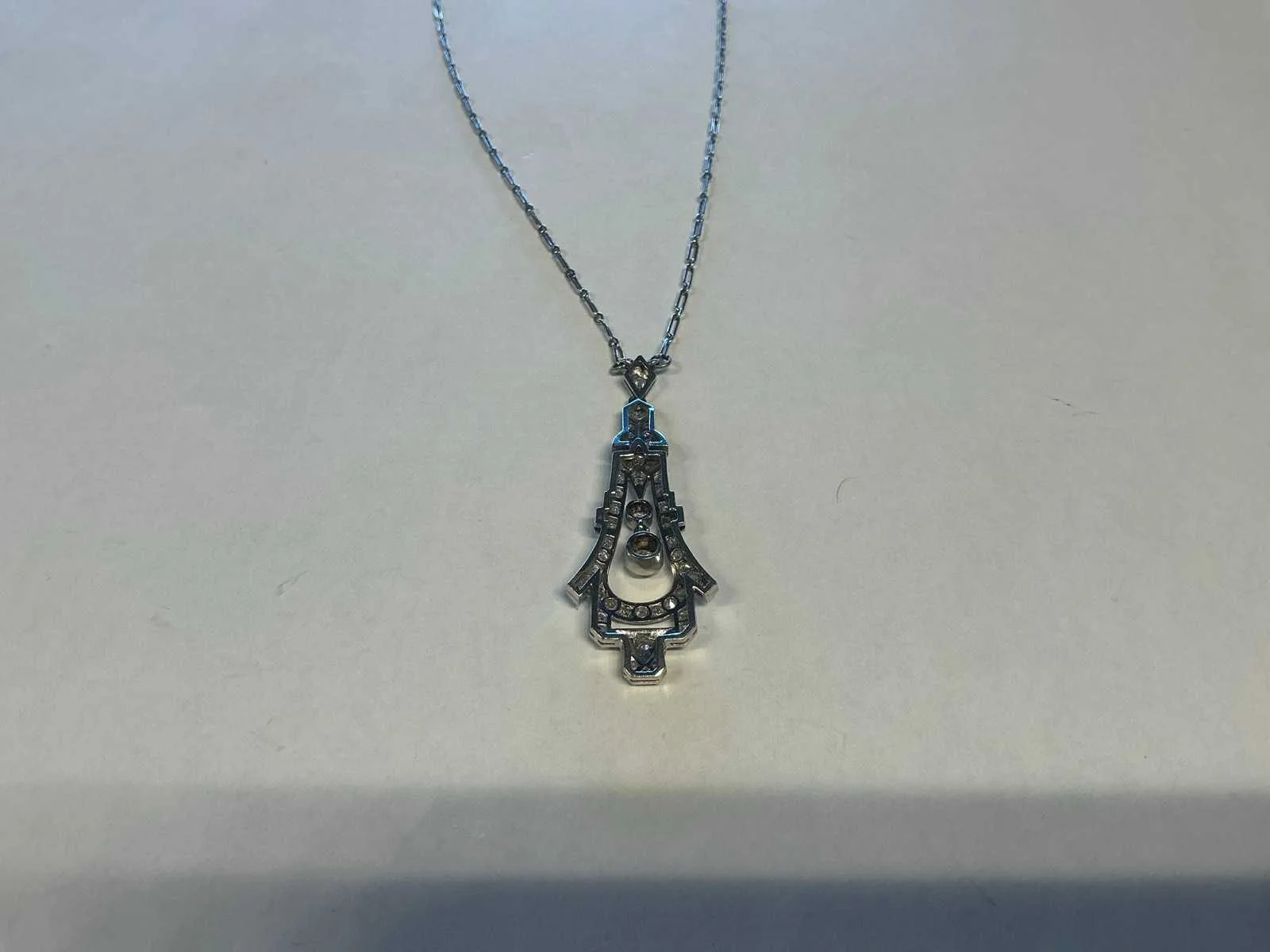 Een platina (900/000) hanger, in Art-Deco stijl, aan platina (900/000) collier. Hanger opengewerkt met geomerishe vormen en bezet met oud slijpsel briljant en achtkant geslepen diamanten, totaal ca. 0,50ct, kleur ca. H/I, zuiverheid ca. SI/Pique. Hanger verbonden aan collier met onedele draadogen. Voorzien van 18 karaats witgouden karabijnsluiting en eindoog. Onedele veiligheidsketting. Bruto gewicht: 10,5 gram. Product type: Platina