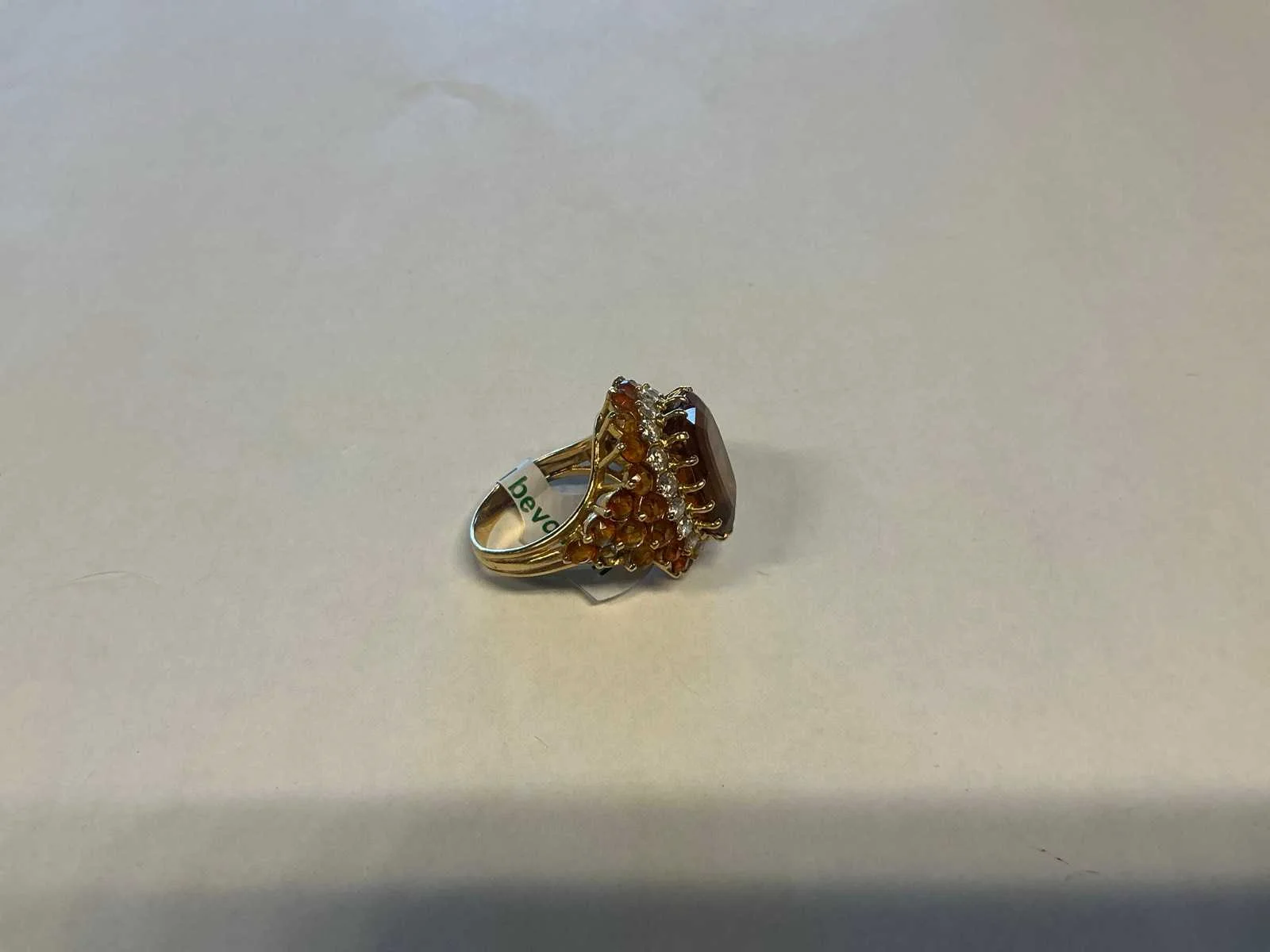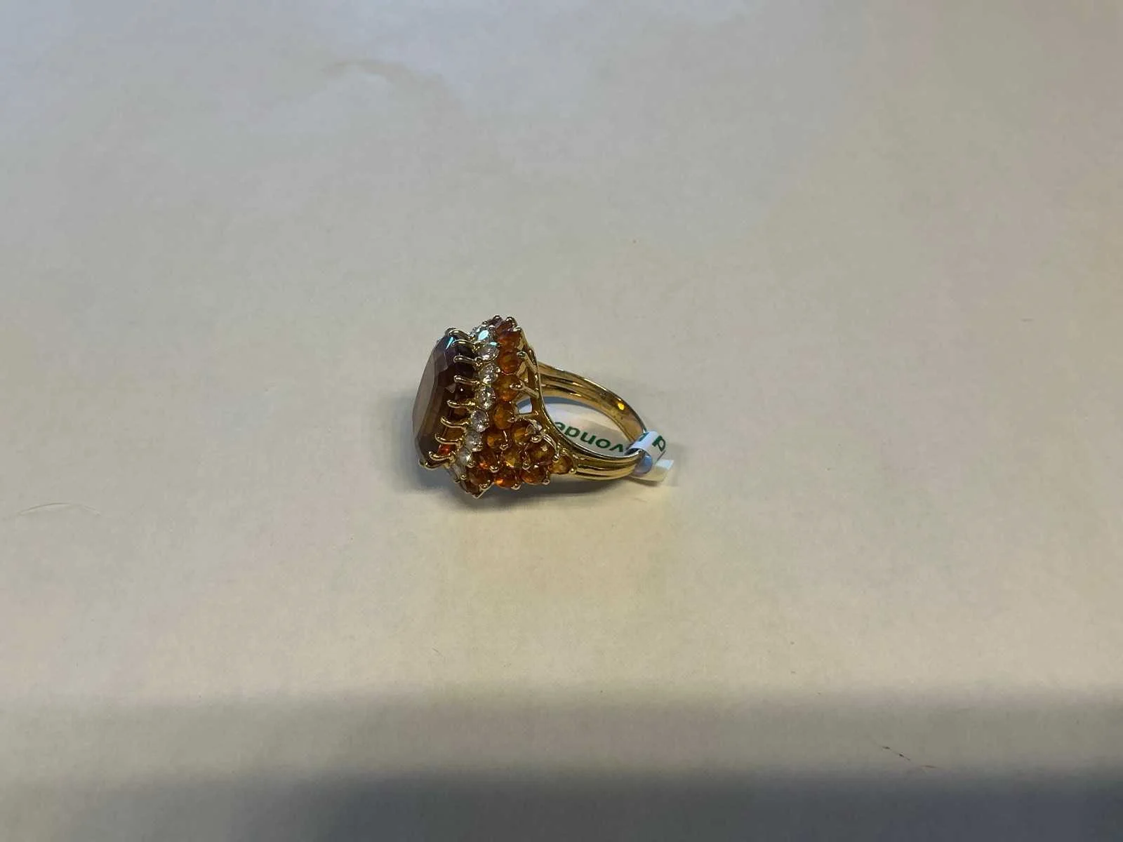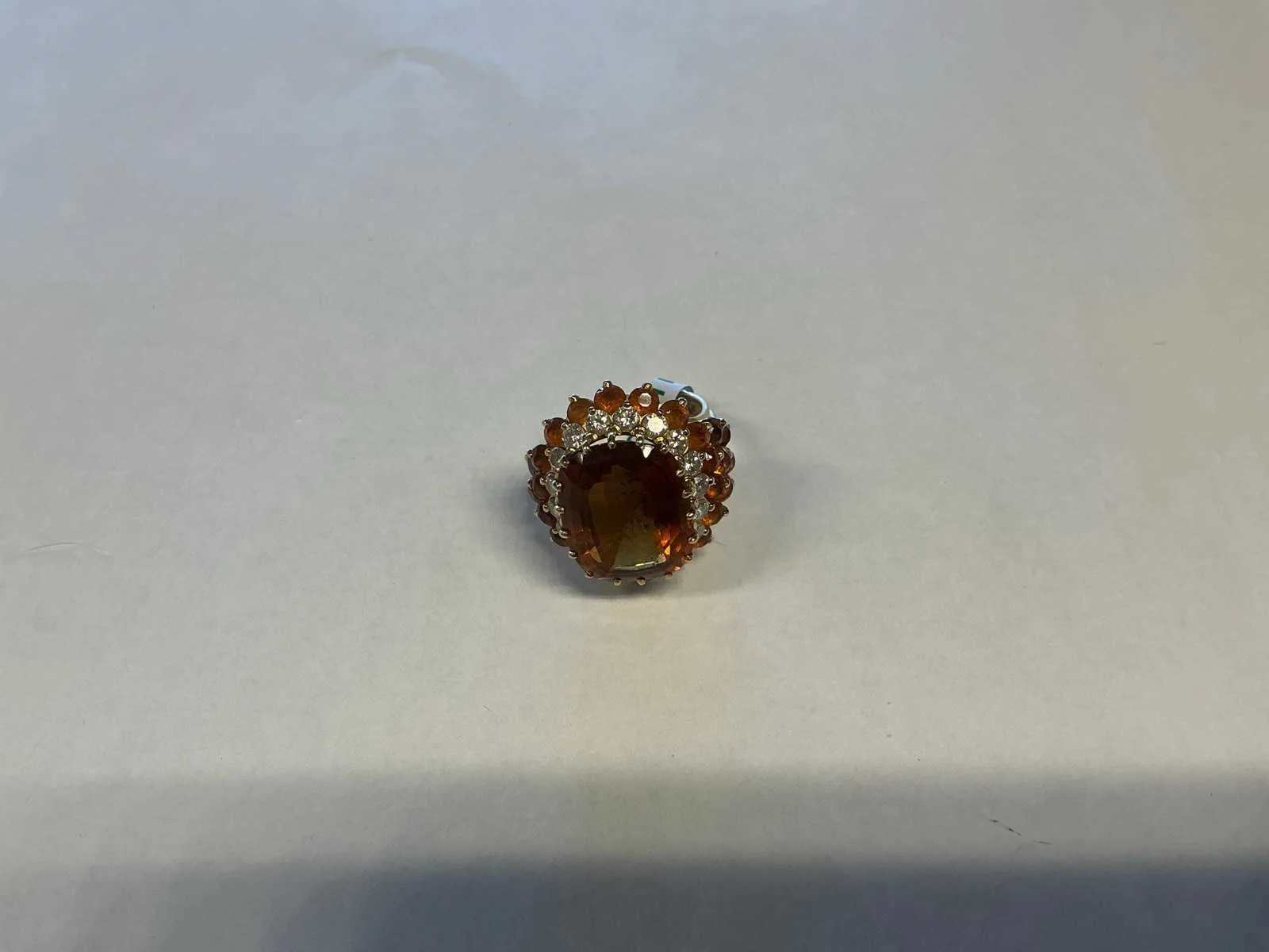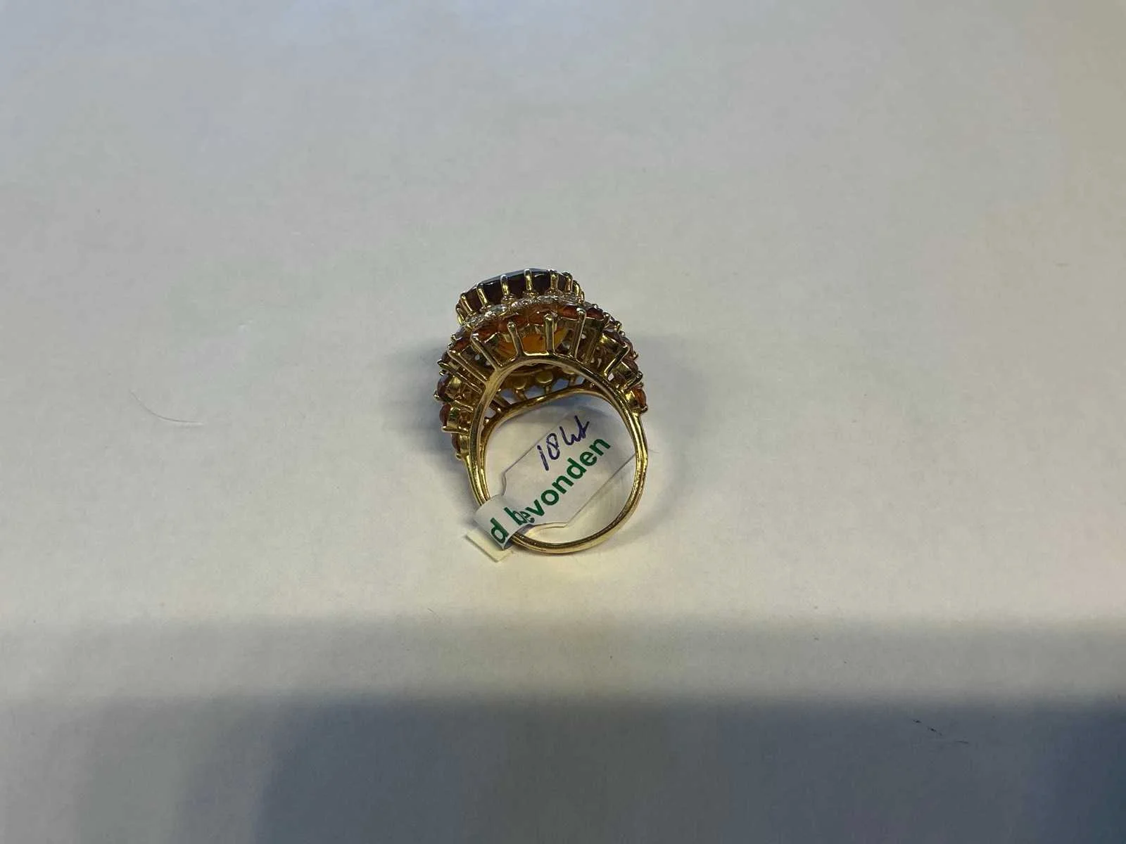 Een 18 karaats (750/000) geelgouden entouragering. Centraal bezet met een kussen geslepen gefacetteerde citrien, 16,5 x 13,8 mm. In een entourage van achttien briljant geslepen diamanten, totaal ca. 0,80ct., kleur ca. H/I, zuiverheid ca. VSI /SI en gefacetteerde ronde citrienen. Bruto gewicht: 13,8 gram. Product type: 18 krt wit- en geelgouden