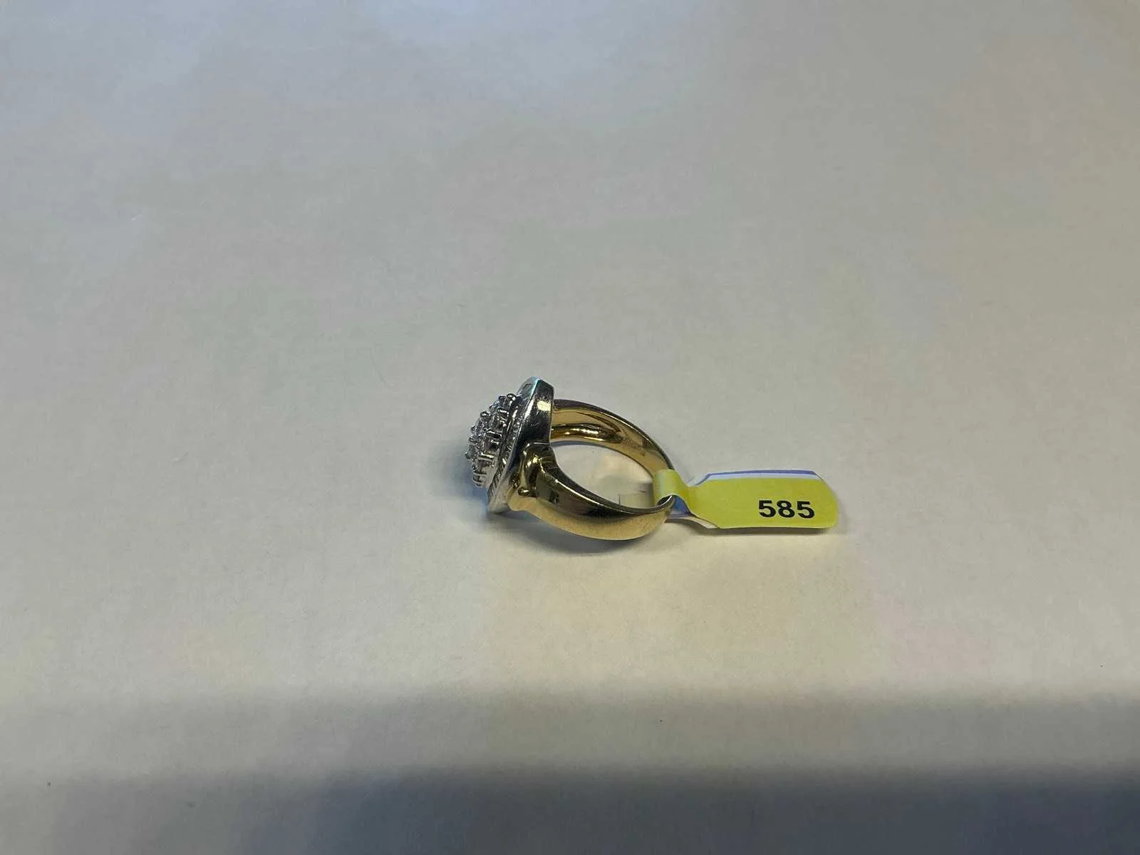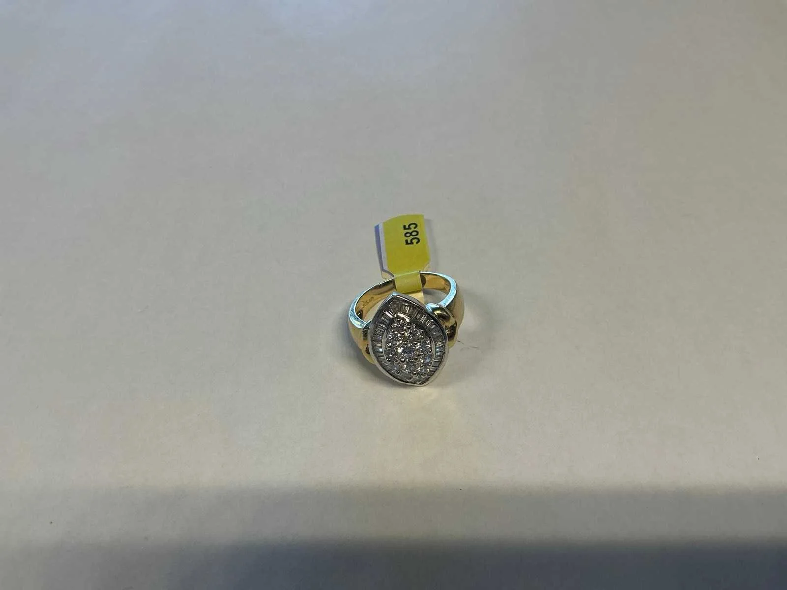 Een 14 karaats (585/000) wit- en geelgouden ring. Markiesvormige kop bezet met baguette en briljant geslepen diamanten, totaal ca. 1,2ct., kleur ca. H/I, zuiverheid ca. VSI/SI. Bruto gewicht: 8,6 gram. Product type: 14 krt wit- en geelgouden