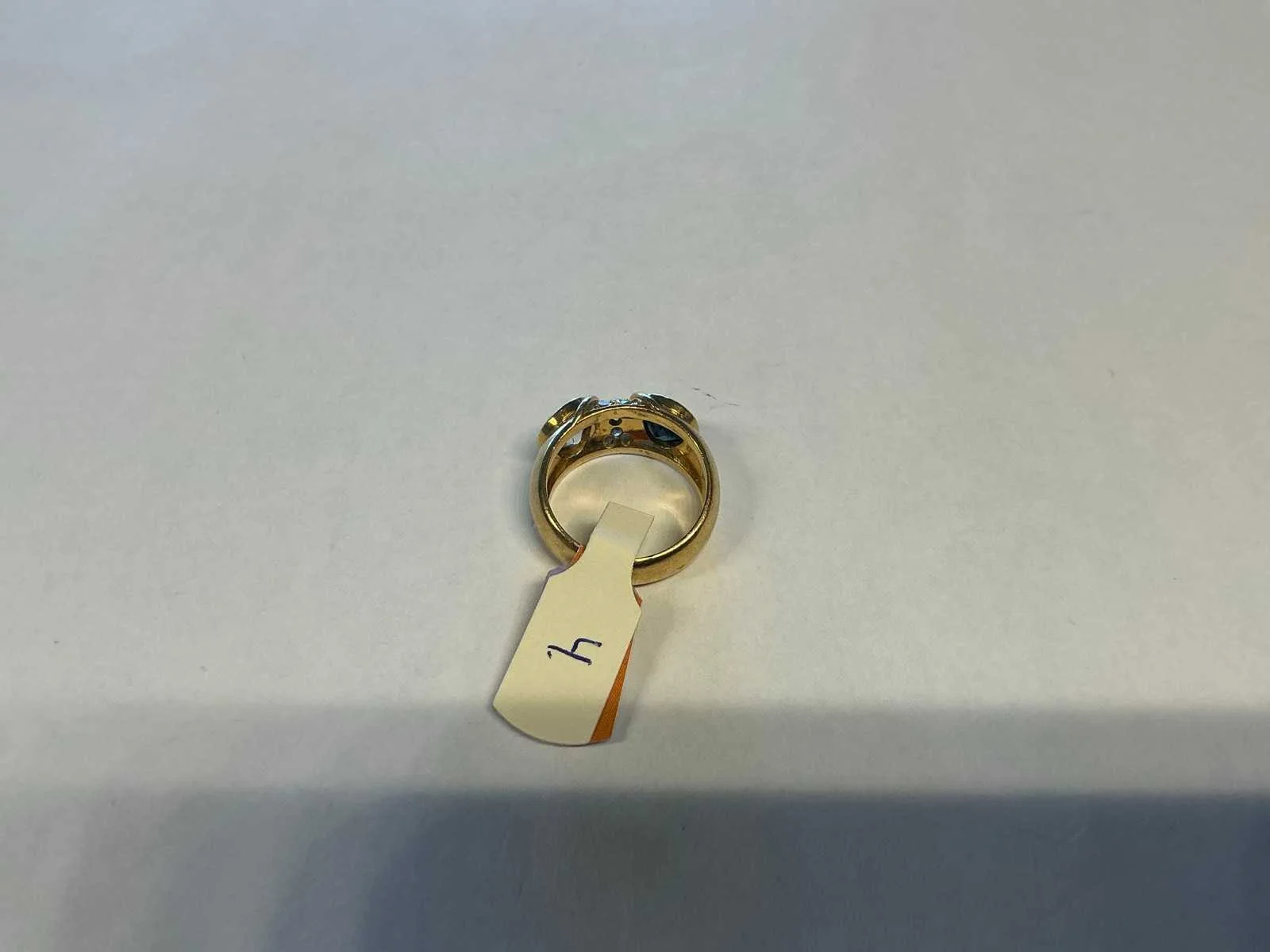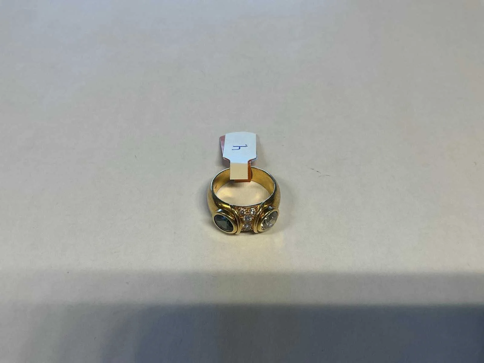Een 18 karaats (750/000) geelgouden ring, bezet met een ronde gefacetteerde donker blauwe saffier en een oud slijpsel briljant geslepen diamant, ca. 1,2ct, kleur ca. J, zuiverheid ca. Pique. In het midden zes briljant geslepen diamanten. Bruto gewicht: 8,9 gram Product type: 18 krt geelgouden