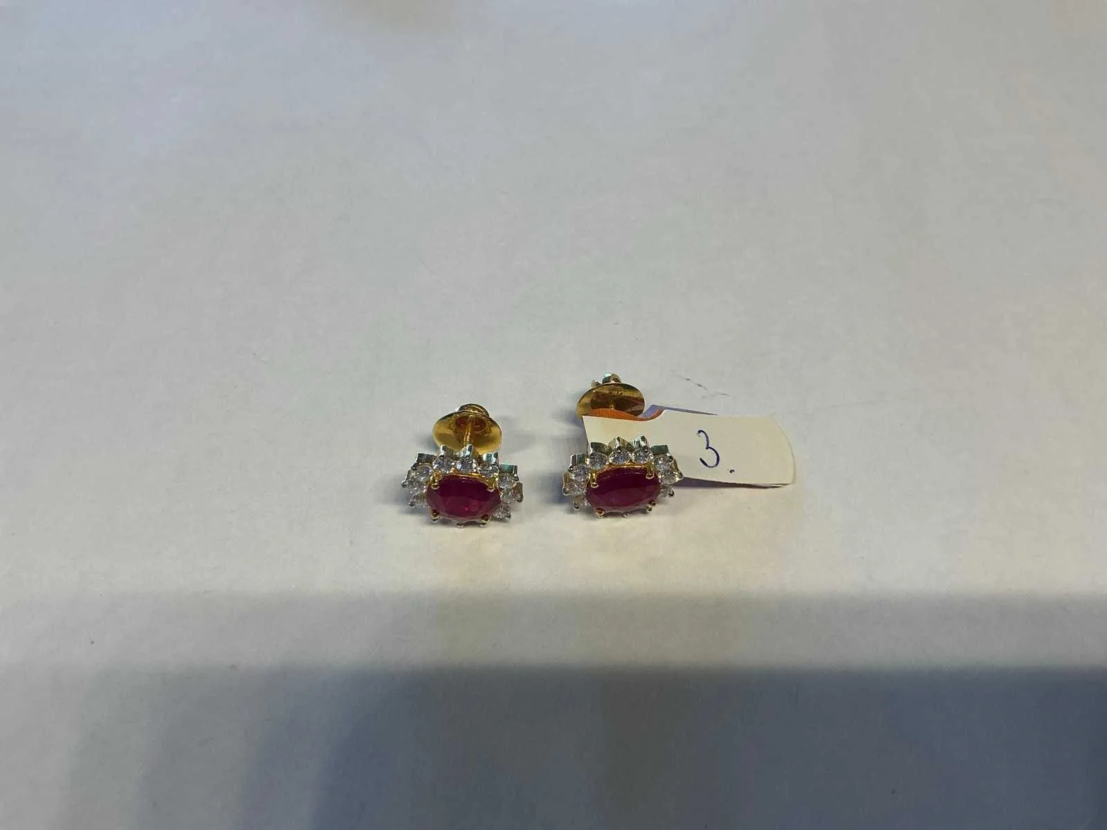 Een paar 18 karaats (750/000) geelgouden entourage oorstekers, ieder centraal bezet met een ovale gefacetteerde robijn in een entrourage van twaalf briljant geslepen diamanten, totaal ca. 0,60ct., kleur ca. H, zuiverheid ca. VSI/SI. Bruto gewicht: 4,8 gram. Oorstekers Product type: 18 krt geelgouden