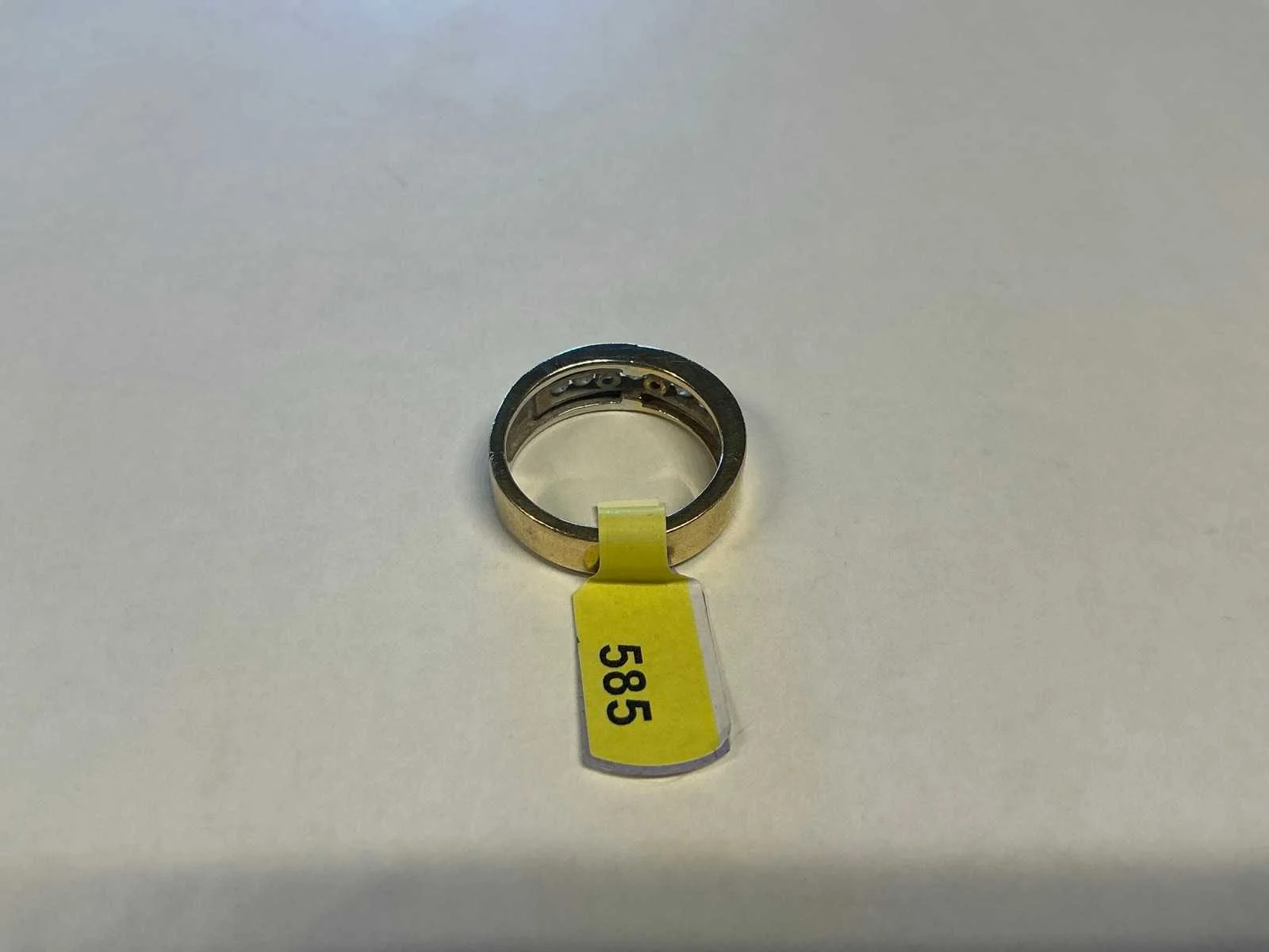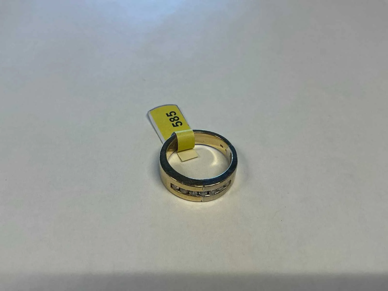 Een 14 karaats (585/000) wit- en geelgouden rijring, bezet met zeven briljant geslepen diamanten, totaal ca. 0,25ct. Bruto gewicht: 6,1 gram. Product type: 14 krt wit- en geelgouden