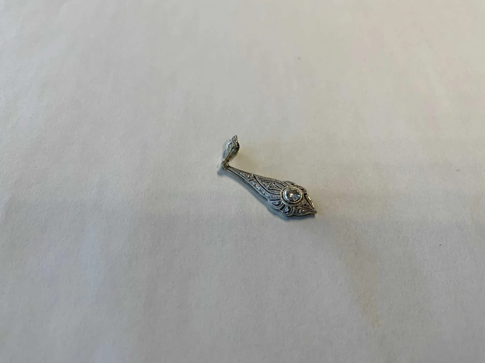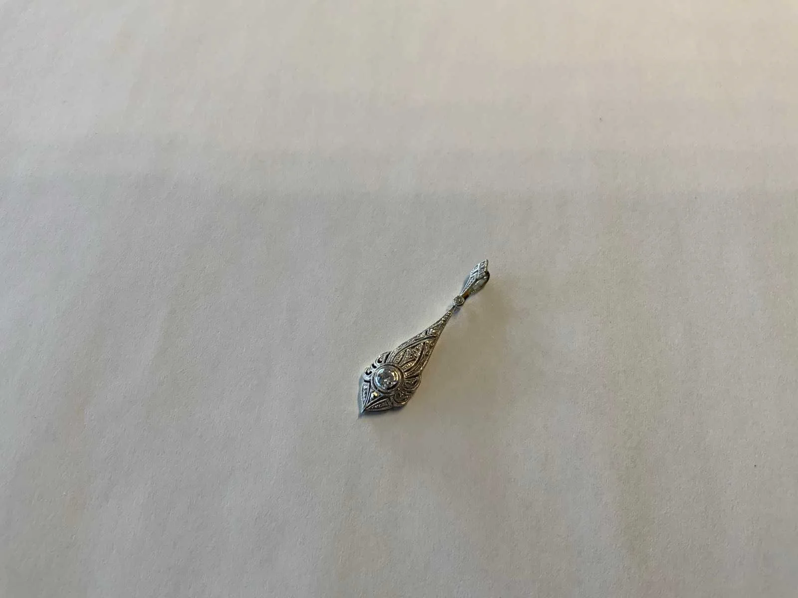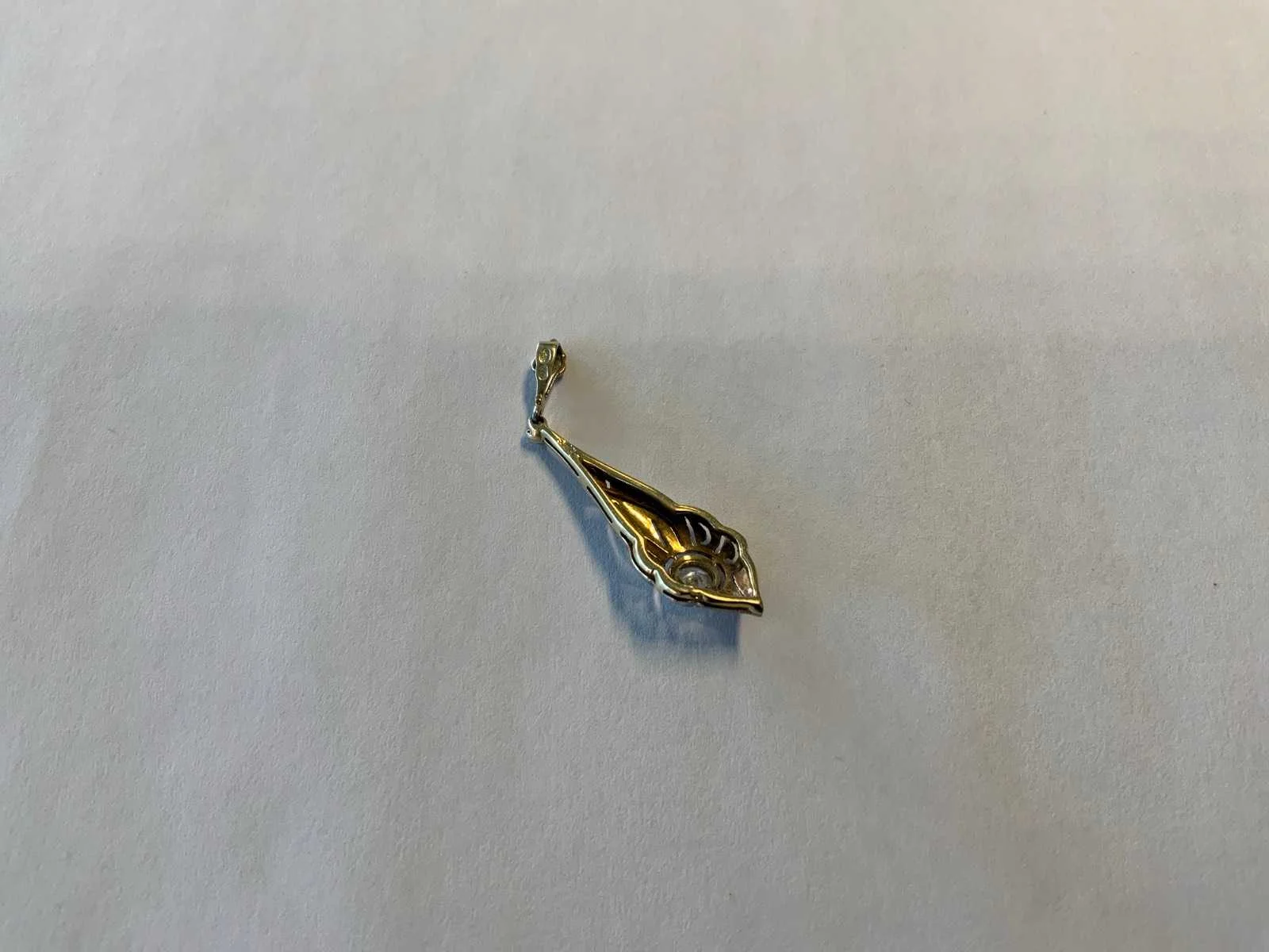 (585/000) opengewerkt en bezet met een briljant geslepen diamant, ca. 0,15ct., kleur ca. I, zuiverheid ca. Pique. Bruto gewicht: 1,2