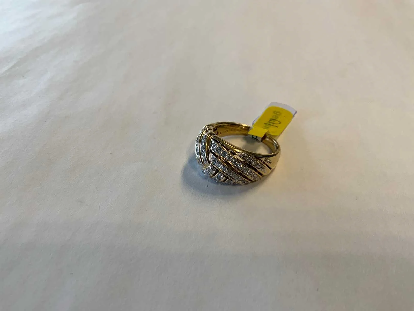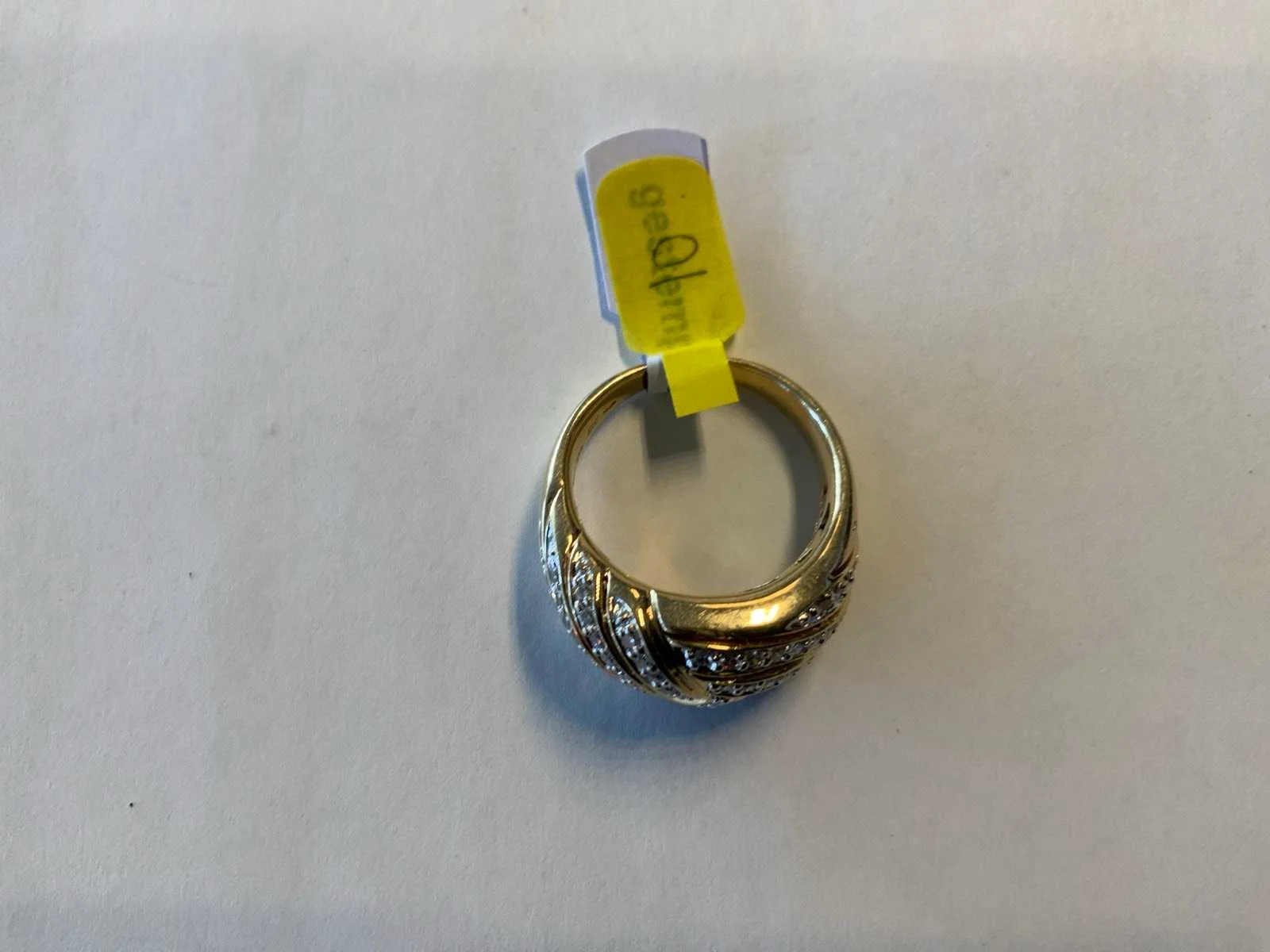 Een 14 karaats (585/000) geelgouden bolle ring. Bovenzijde opengewerkt en bezet met briljant geslepen diamanten, totaal ca. 0,90ct., kleur ca. H, zuiverheid ca. VSI. Bruto gewicht: 9,5 gram