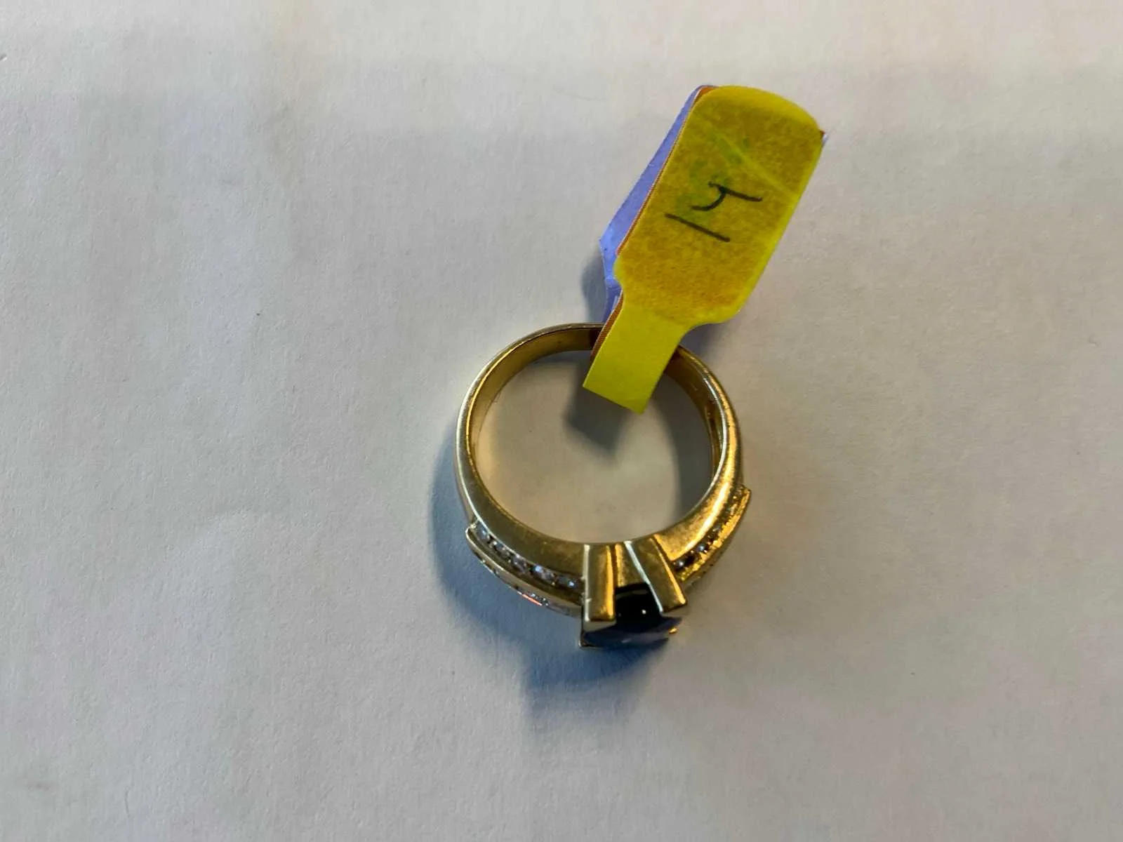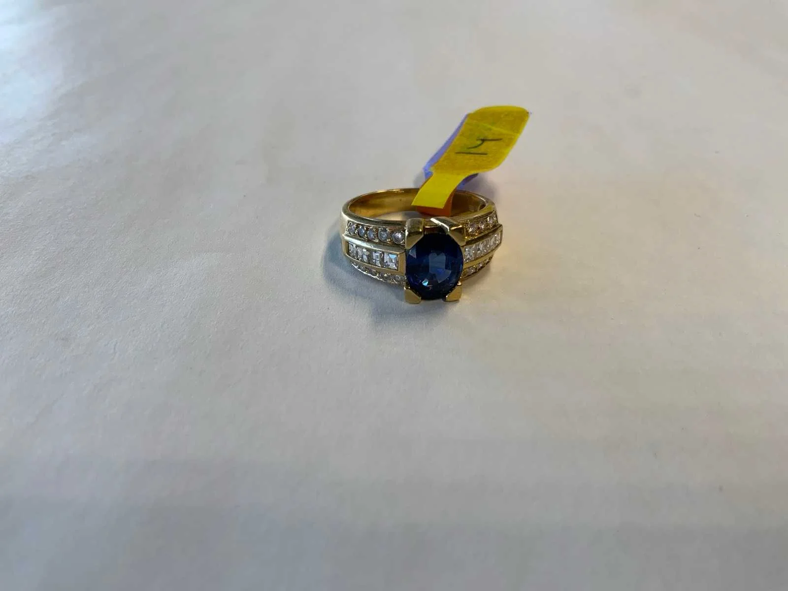 Een 18 karaats (750/000) geelgouden ring. Centraal bezet met een ovale gefactteerde blauwe saffier (waarschijnlijk behandeld), slijtage. Op de schouders bezet met carré en briljant geslepen diamanten, totaal ca. 0,75ct., kleur ca. H, zuiverheid ca. VSI. Bruto gewicht: 6,1 gram.