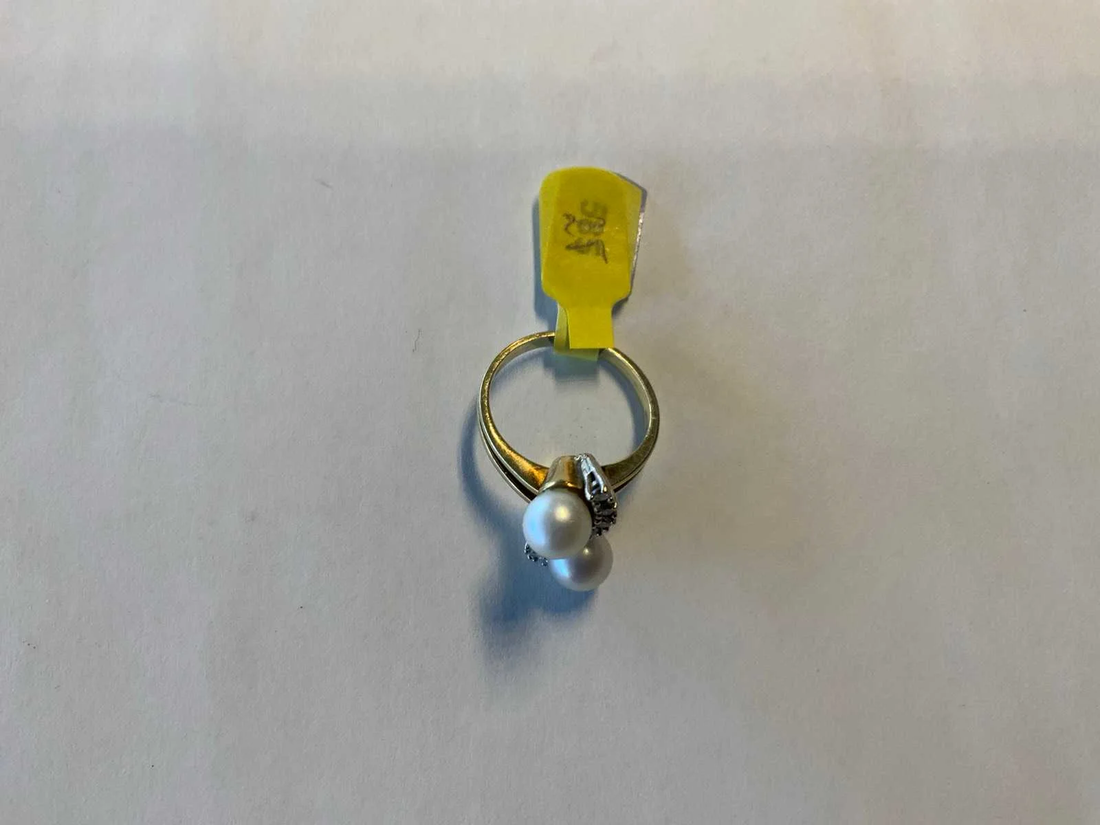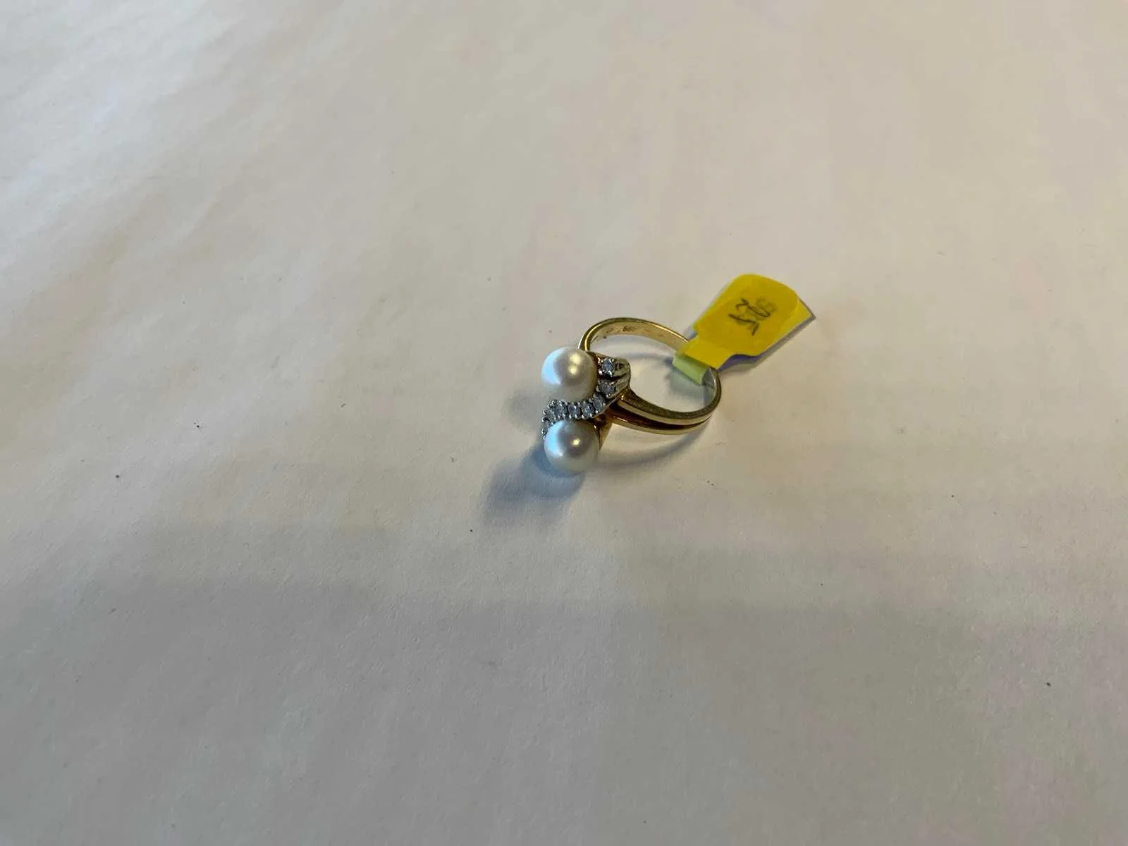 Een 14 karaats (585/000) geelgouden ring. Kop in de vorm van een S, bezet met twee cultivé parels en negen briljant geslepen diamanten in witgouden zettingen, totaal ca. 0,20ct., kleur ca. H, zuiverheid ca. VSI. Bruto gewicht: 6,8 gram.
