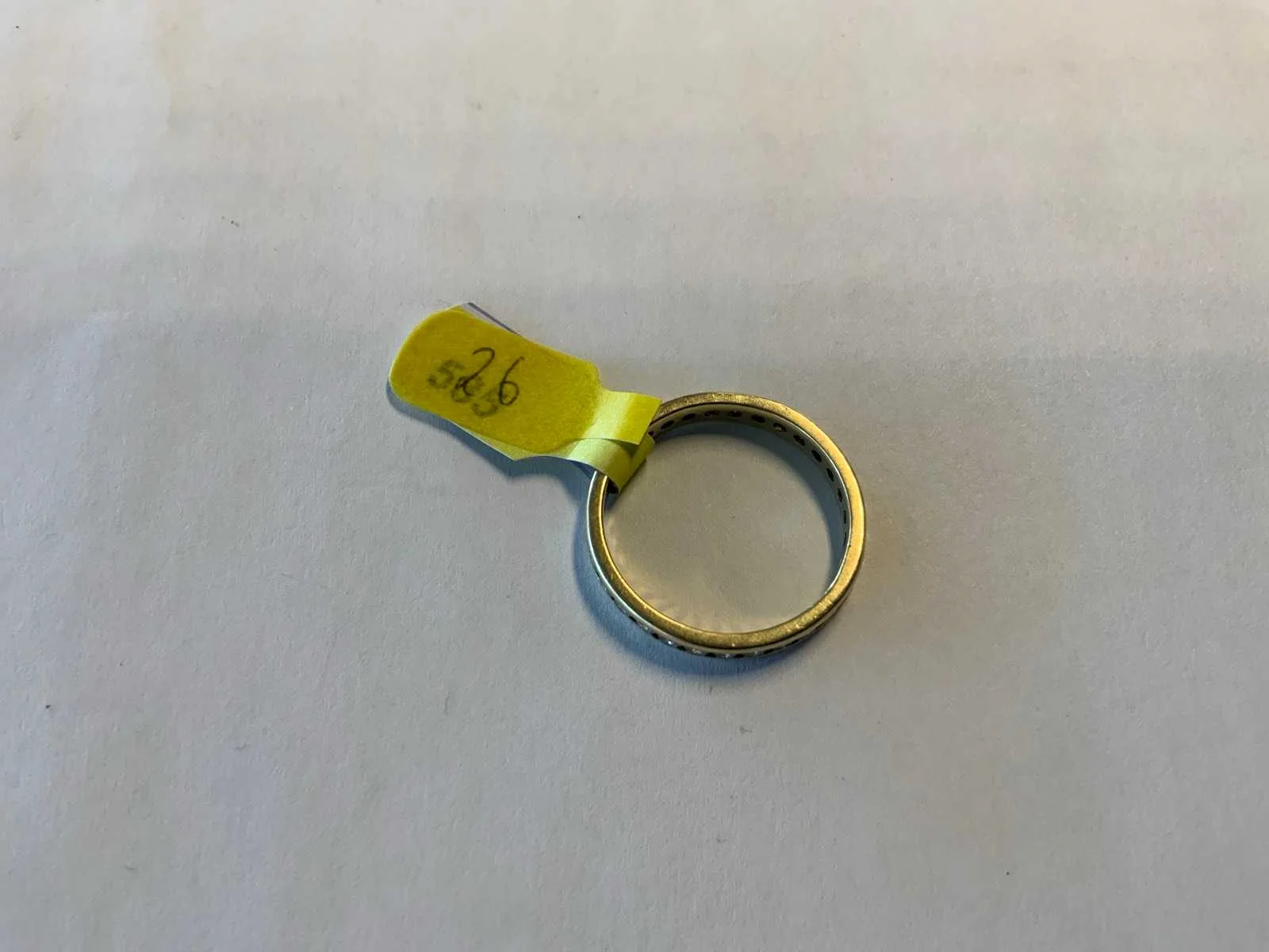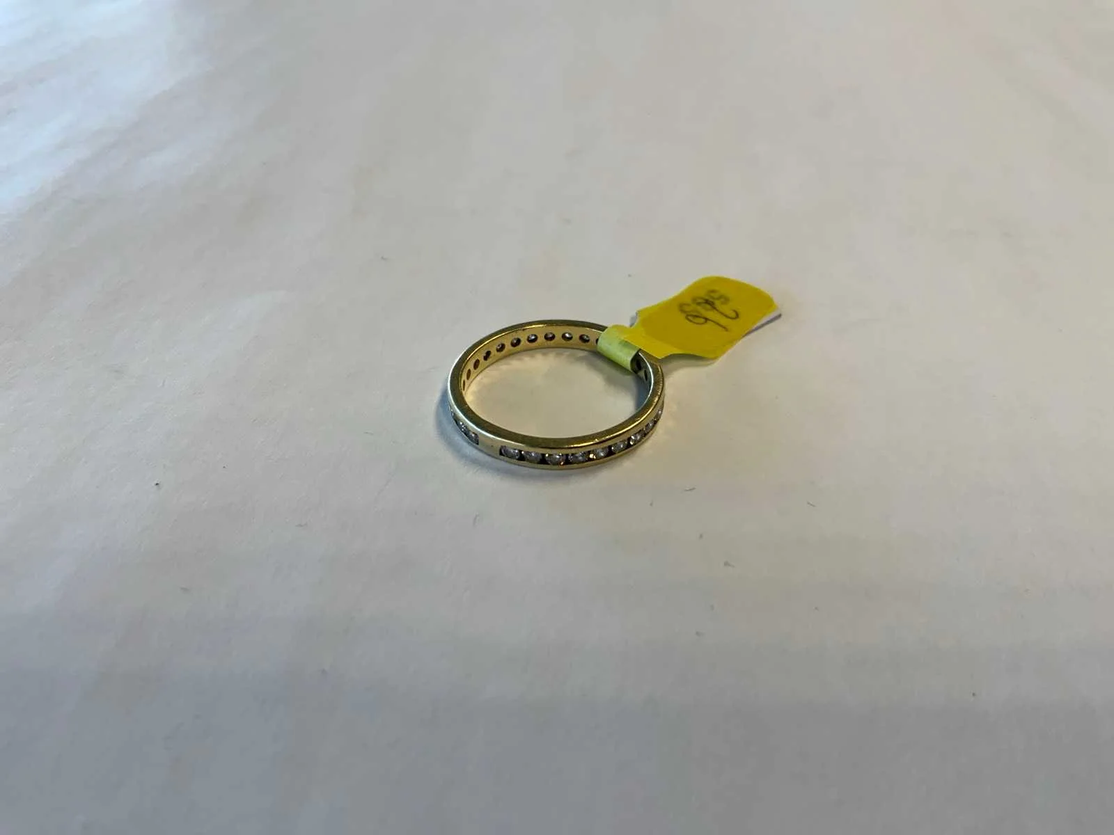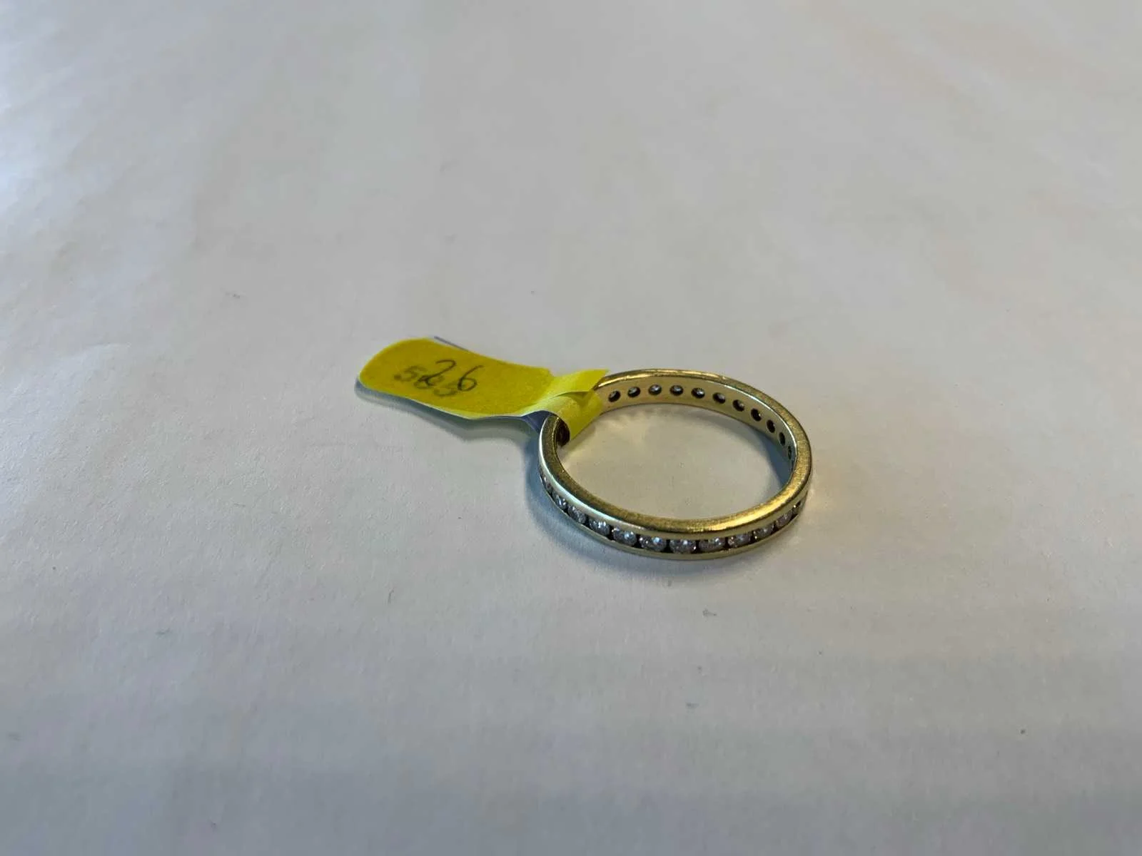 Een 14 karaats (585/000) geelgouden alliancering, bezet met briljant geslepen diamanten, totaal ca. 0,30 ct., kleur ca. I, zuiverheid ca. VSI-SI. Bruto gewicht: 2,6 gram.