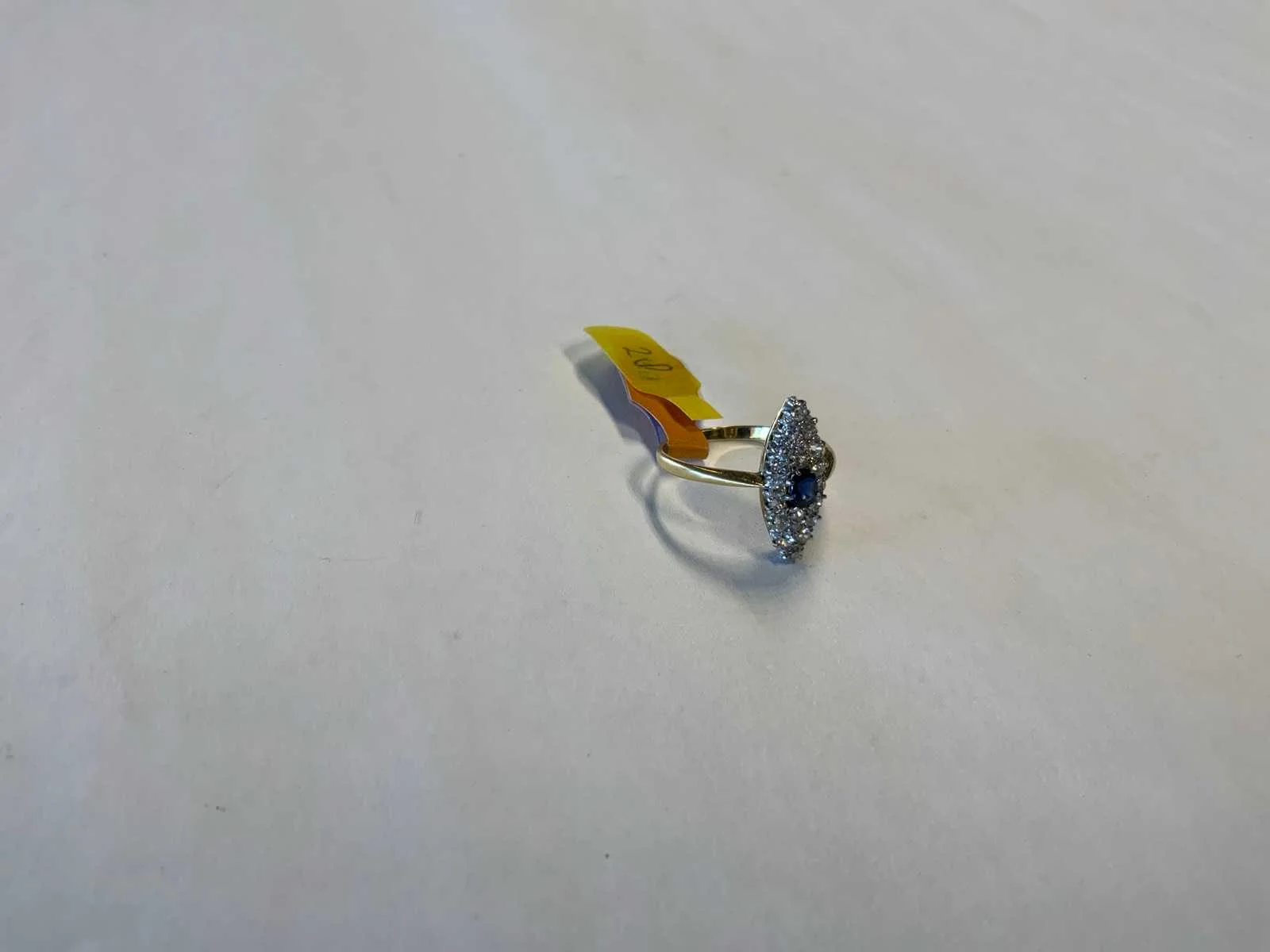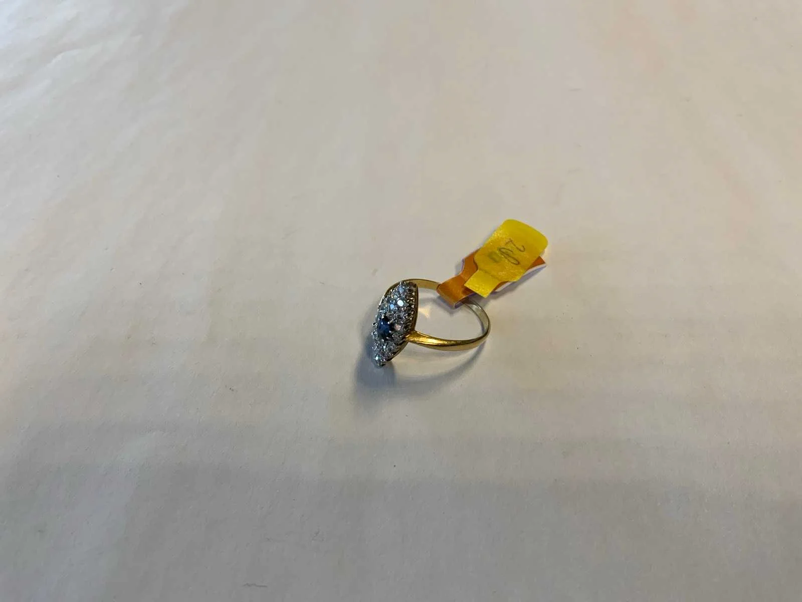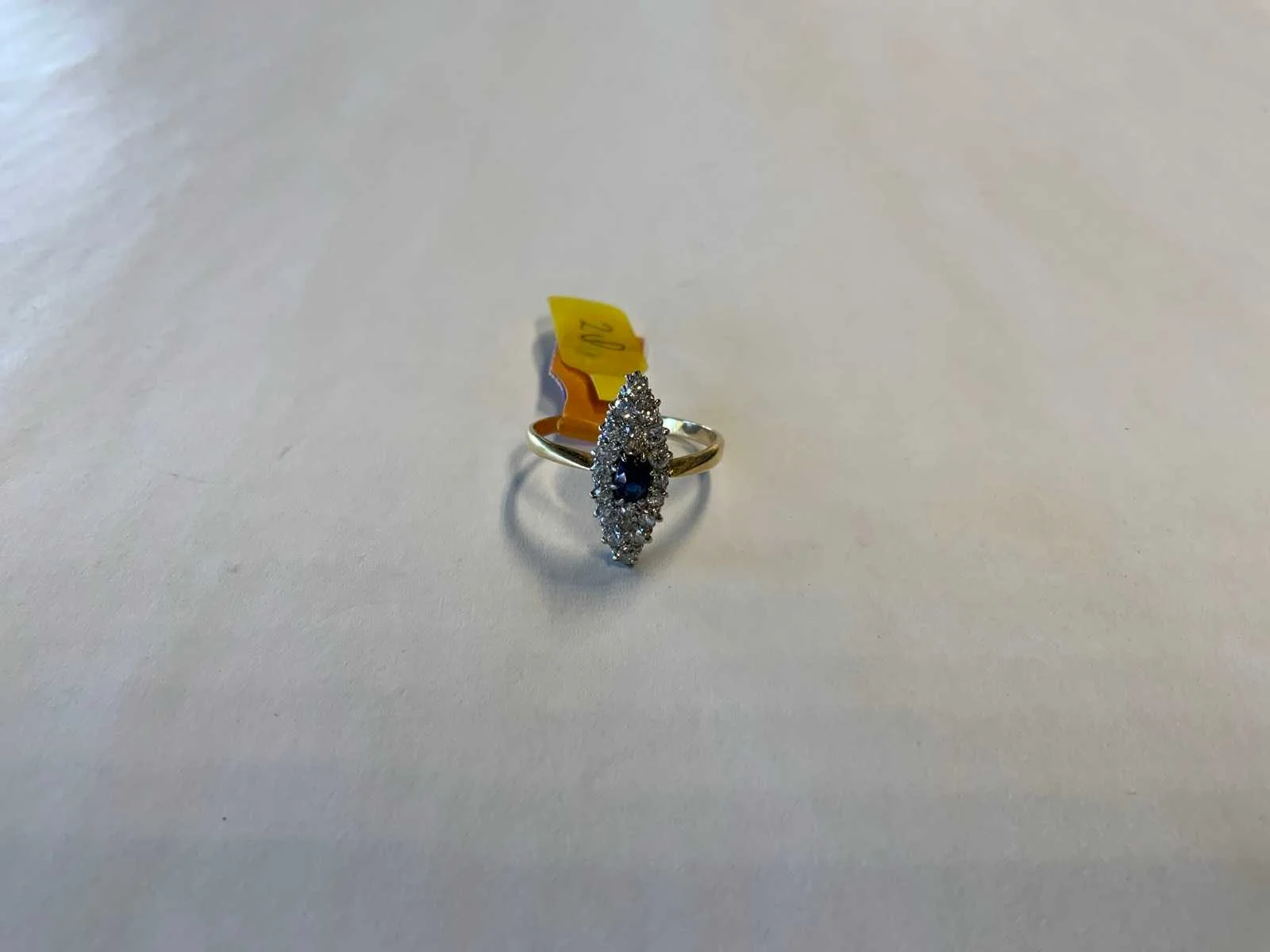 Een 18 karaats (750/000) geelgouden ring. Markiesvormige kop, centraal bezet met een ovale gefacetteerde blauwe saffier, geheel bezet met oud slijpsel geslepen diamanten, Pique3. Bruto gewicht: 2,7 gram.