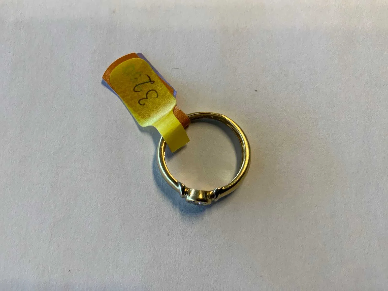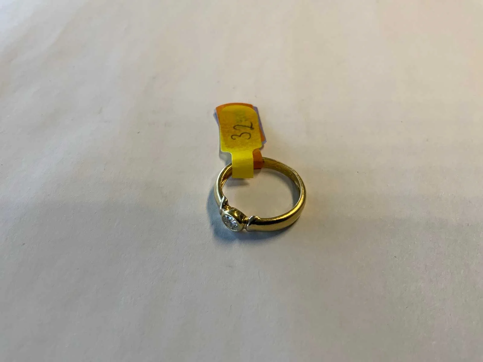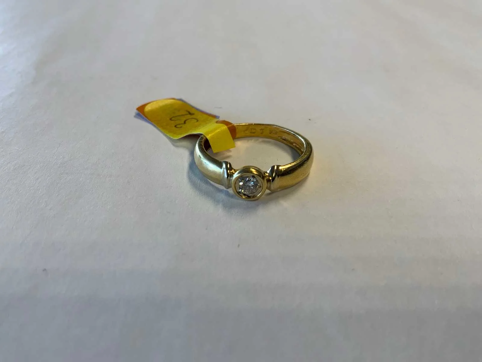 Een 18 karaats (750/000) geelgouden solitairring, bezet met een briljant geslepen diamant, ca. 0,12ct., kleur ca. H, zuiverheid ca. VSI. Gladomgezet. Bruto gewicht: 2,9 gram.