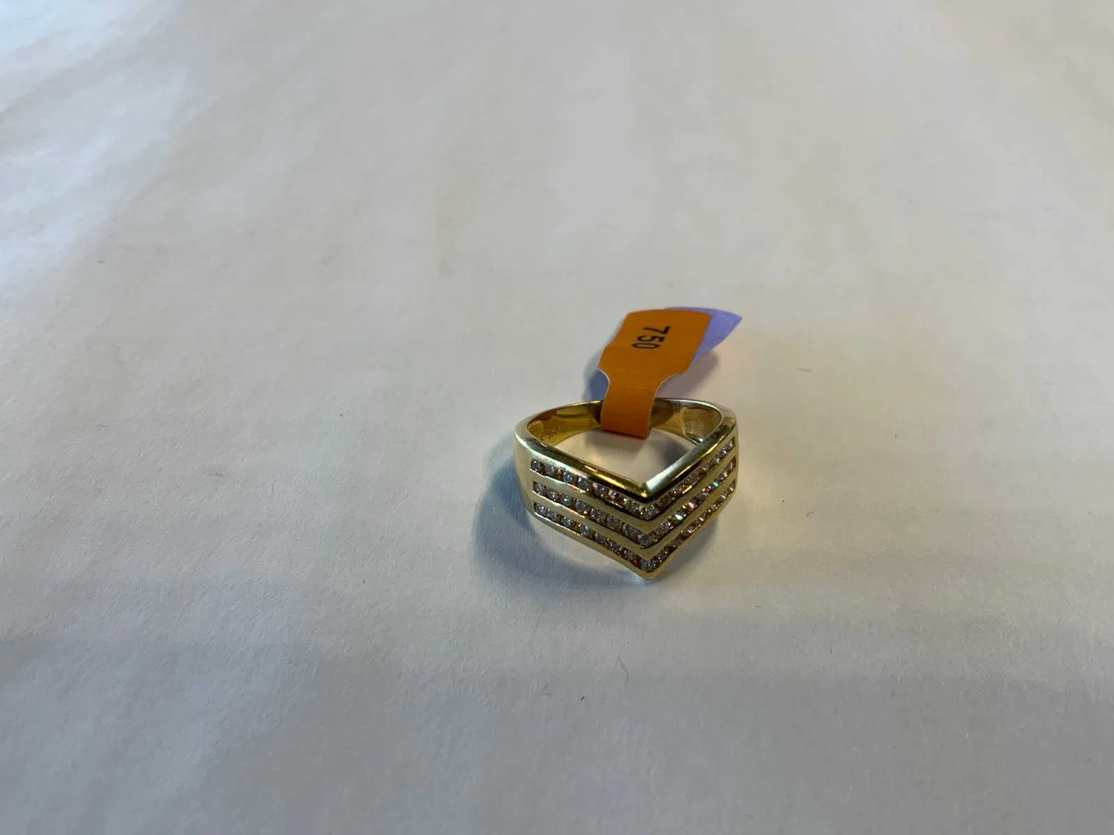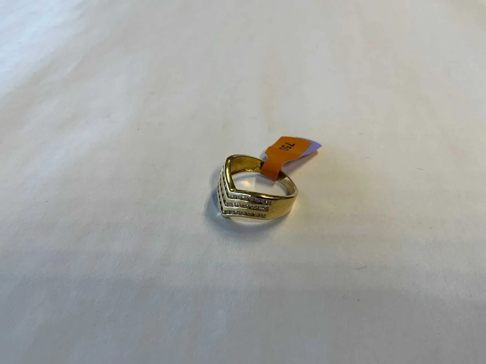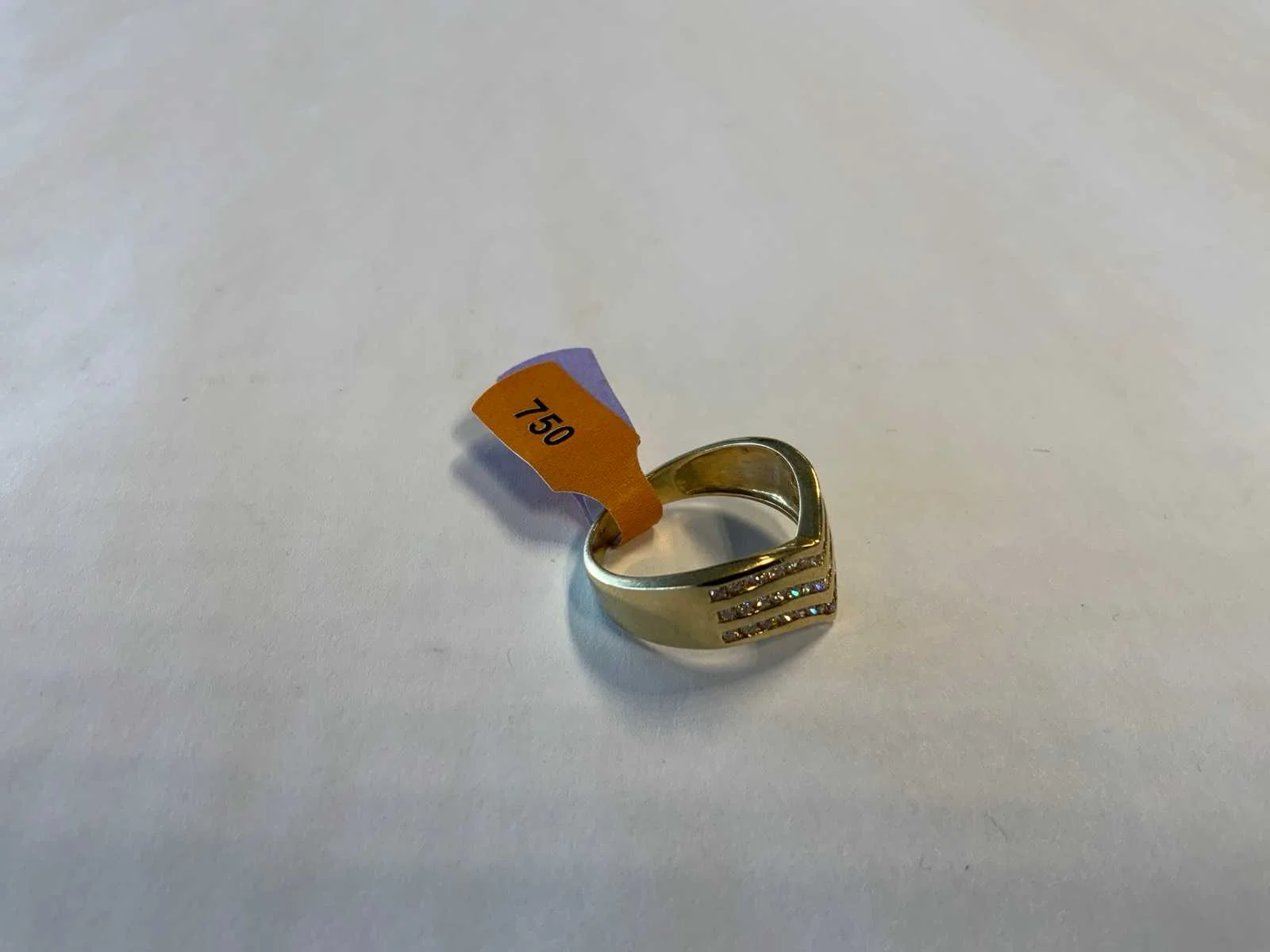 Een 18 karaats (750/000) geelgouden ring. Kop in een V-vorm en bezet met drie rijen kleine briljant geslepen diamanten. Bruto gewicht: 5,0 gram.