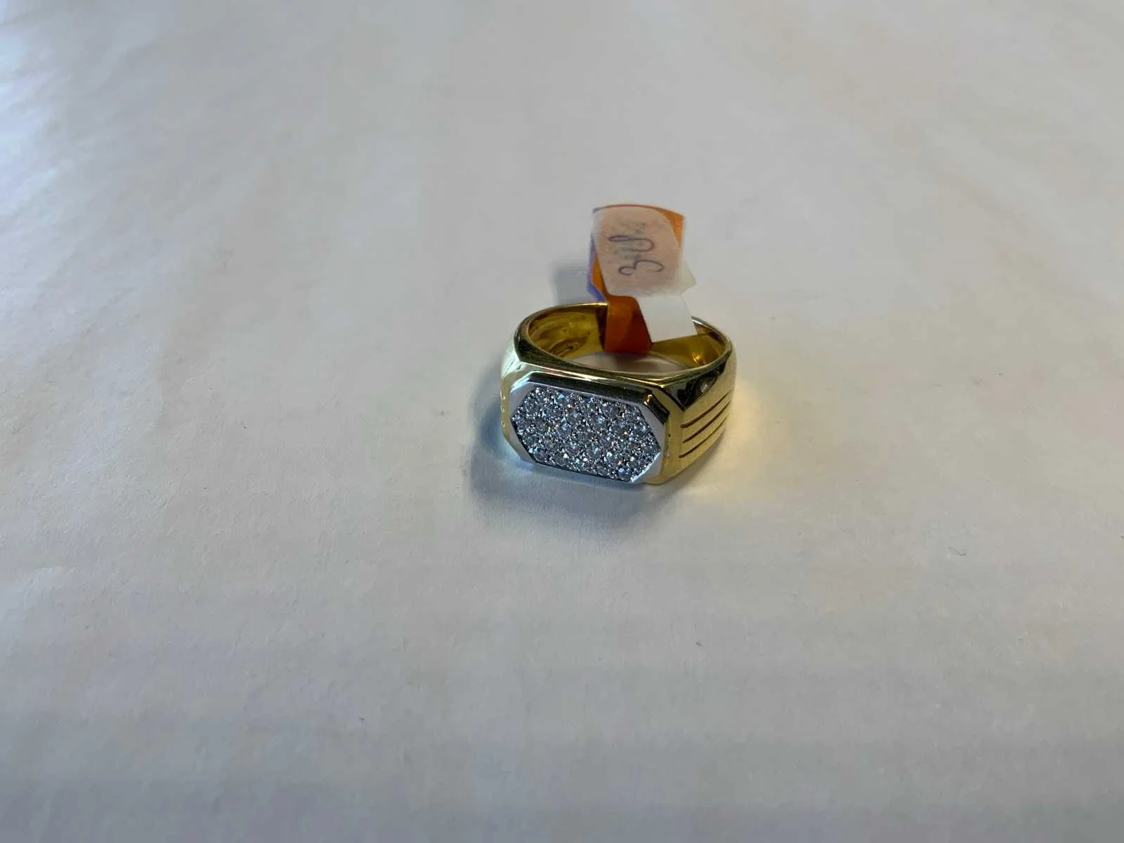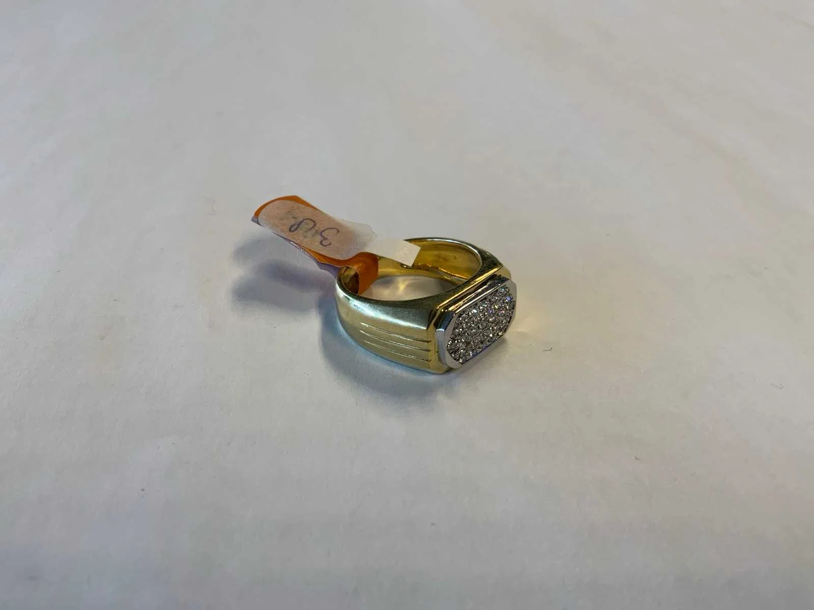 Een 18 karaats (750/000) wit- en geelgouden ring. Liggende rechthoekige kop, pavé bezet met briljant geslepen diamanten 0,60ct., kleur ca. H, zuiverheid ca. VSI. Bruto gewicht: 13,0 gram.