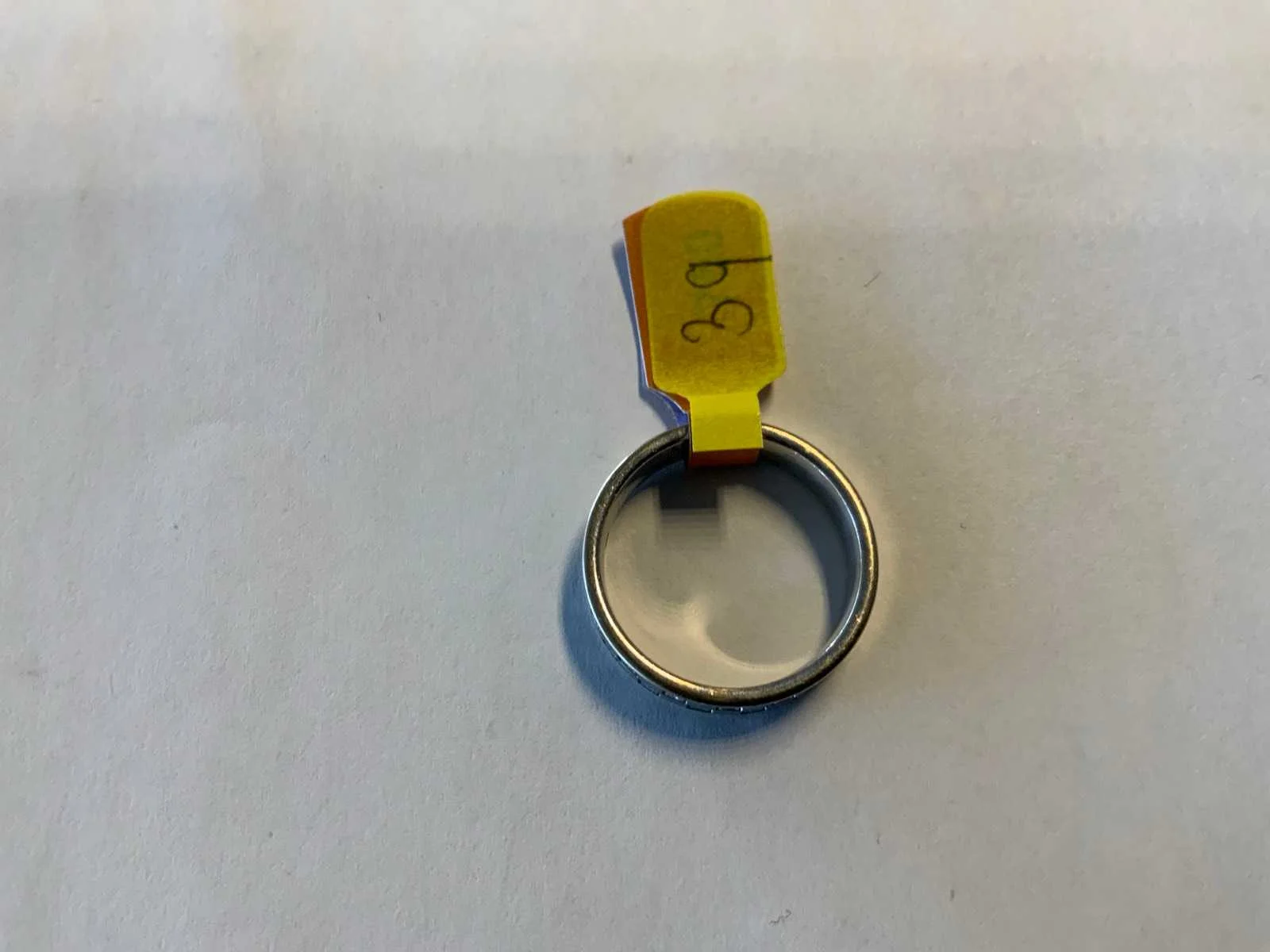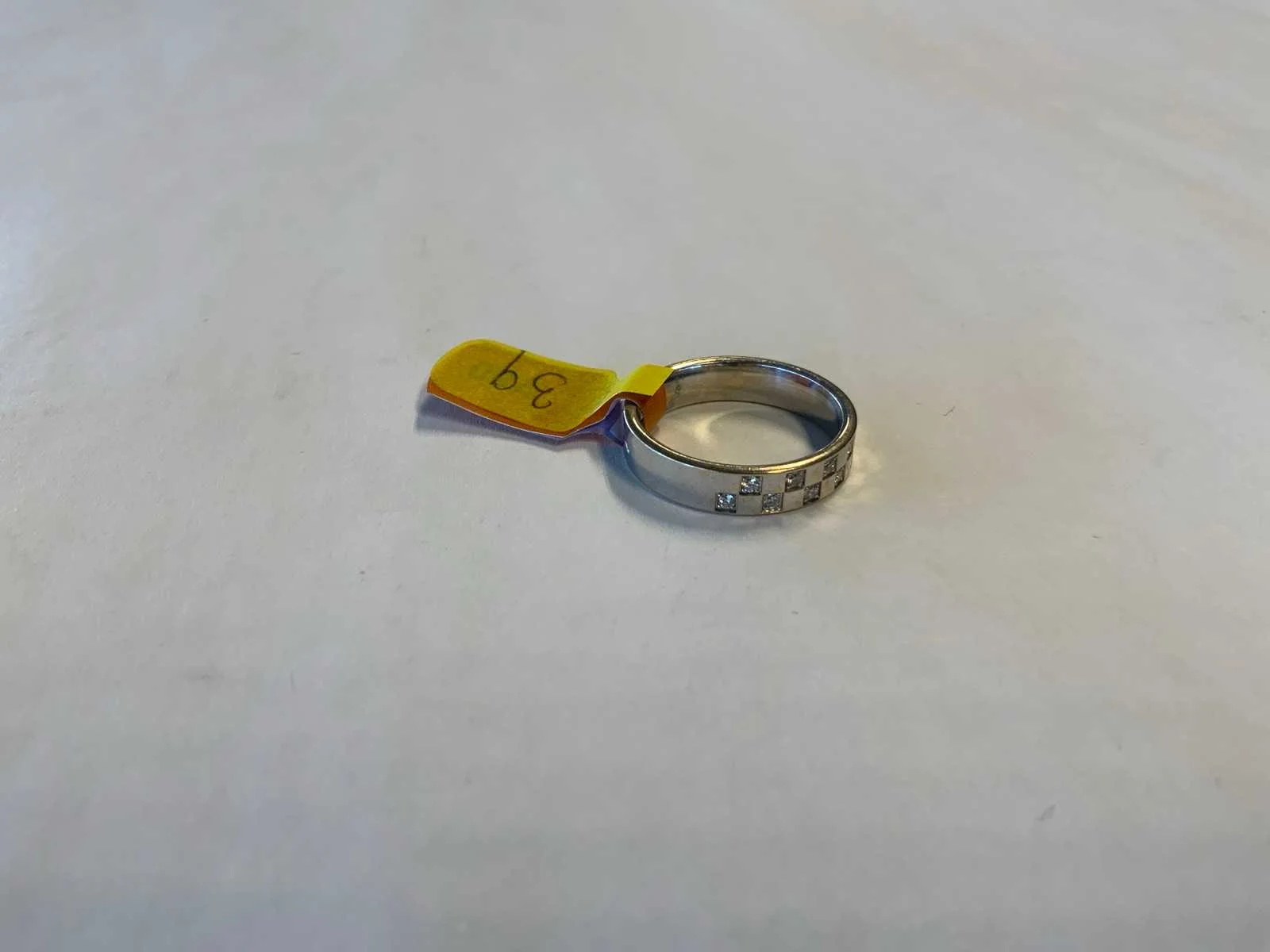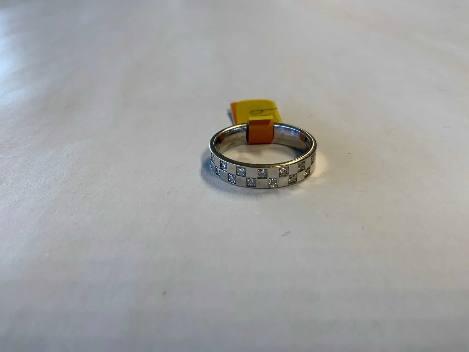 Een 18 karaats (750/000) witgouden ring. Bovenzijde met verspringende vierkanten, ieder bezet met een briljant geslepen diamant, totaal ca. 0,25ct. (gerodineerd, slijtage). Bruto gewicht: 5,0 gram.