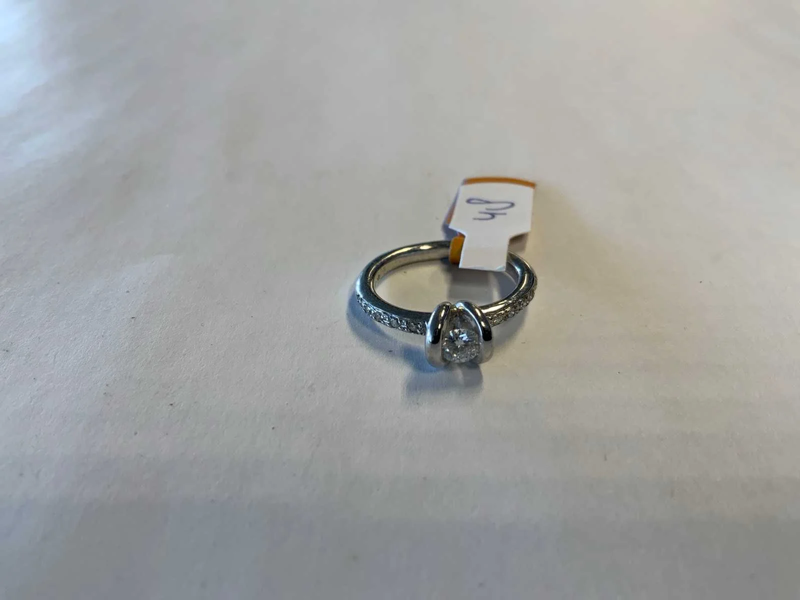 Een 18 karaats (750/000) witgouden solitairring. Bezet met een briljant geslepen diamant, ca. 0,22ct., kleur ca. H, zuiverheid ca. VSI. Gezet in hooggeplaatse fantasie chaton. Bovenzijde scheen bezet met kleine briljant geslepen diamanten. Bruto gewicht: 3,6 gram.