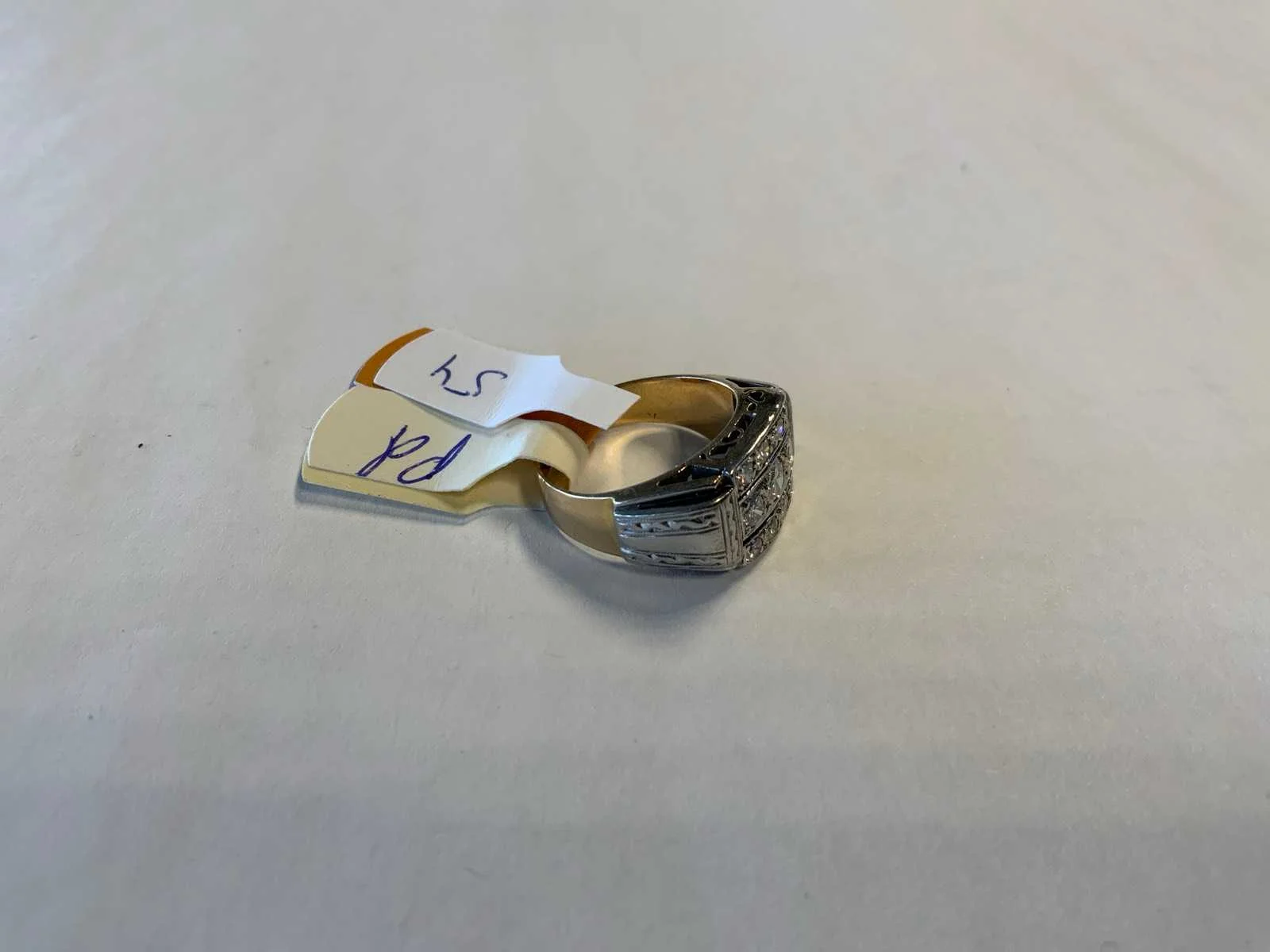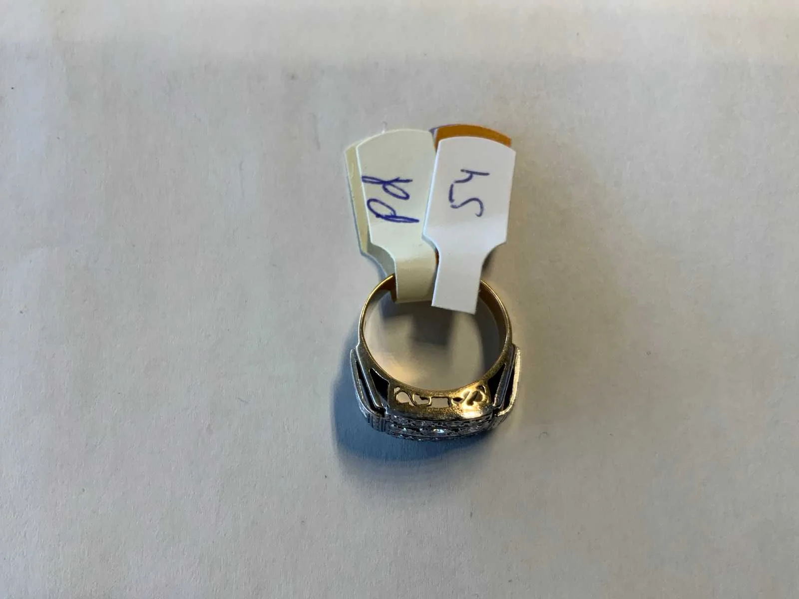 Een 18 karaats (750/000) geelgouden en palladium ring. Geometrische kop, bezet met briljant geslepen diamanten, totaal ca. 0,80ct., kleur ca. H-I, zuiverheid ca. VSI-SI. Bruto gewicht: 7,3 gram.
