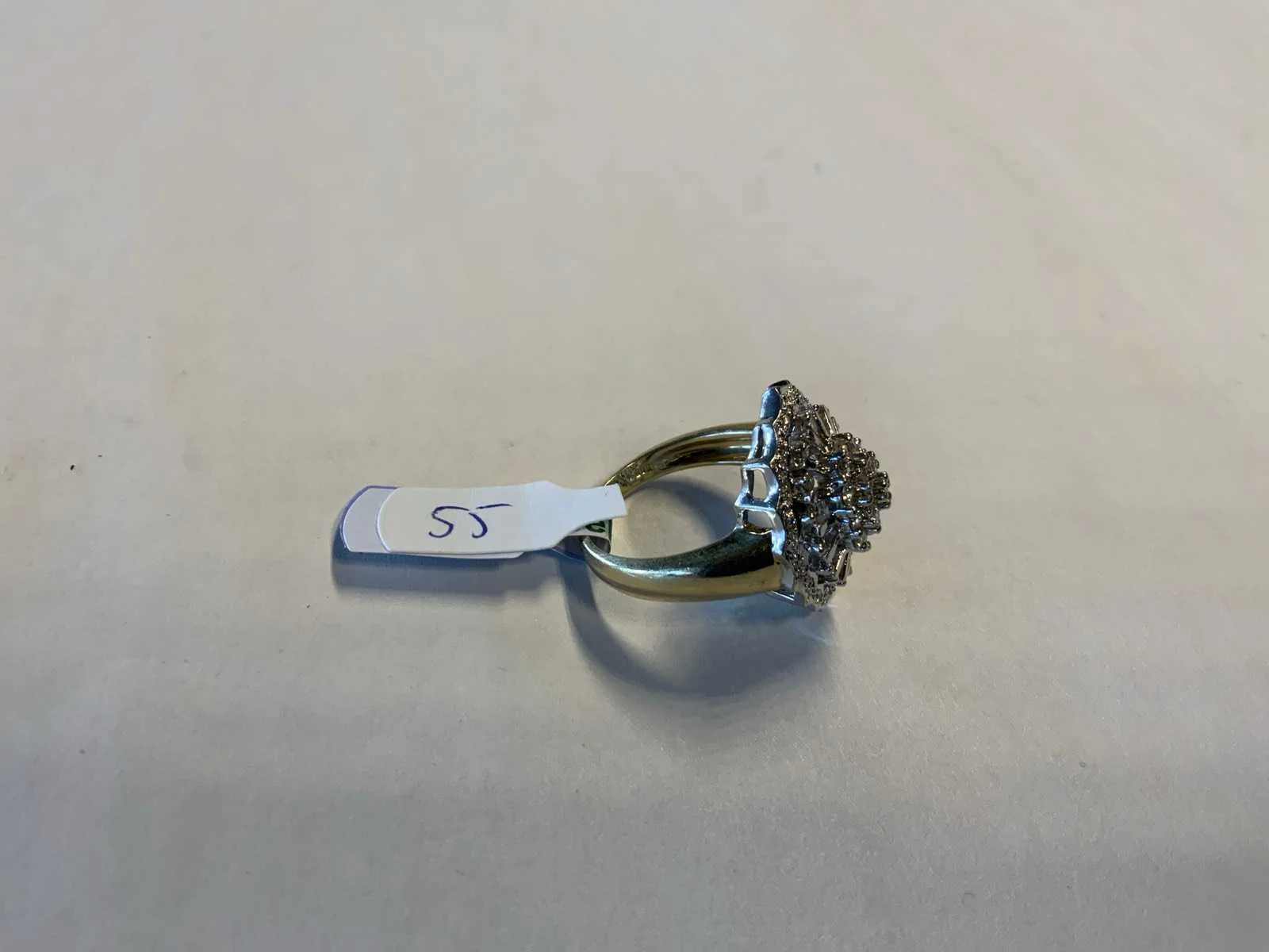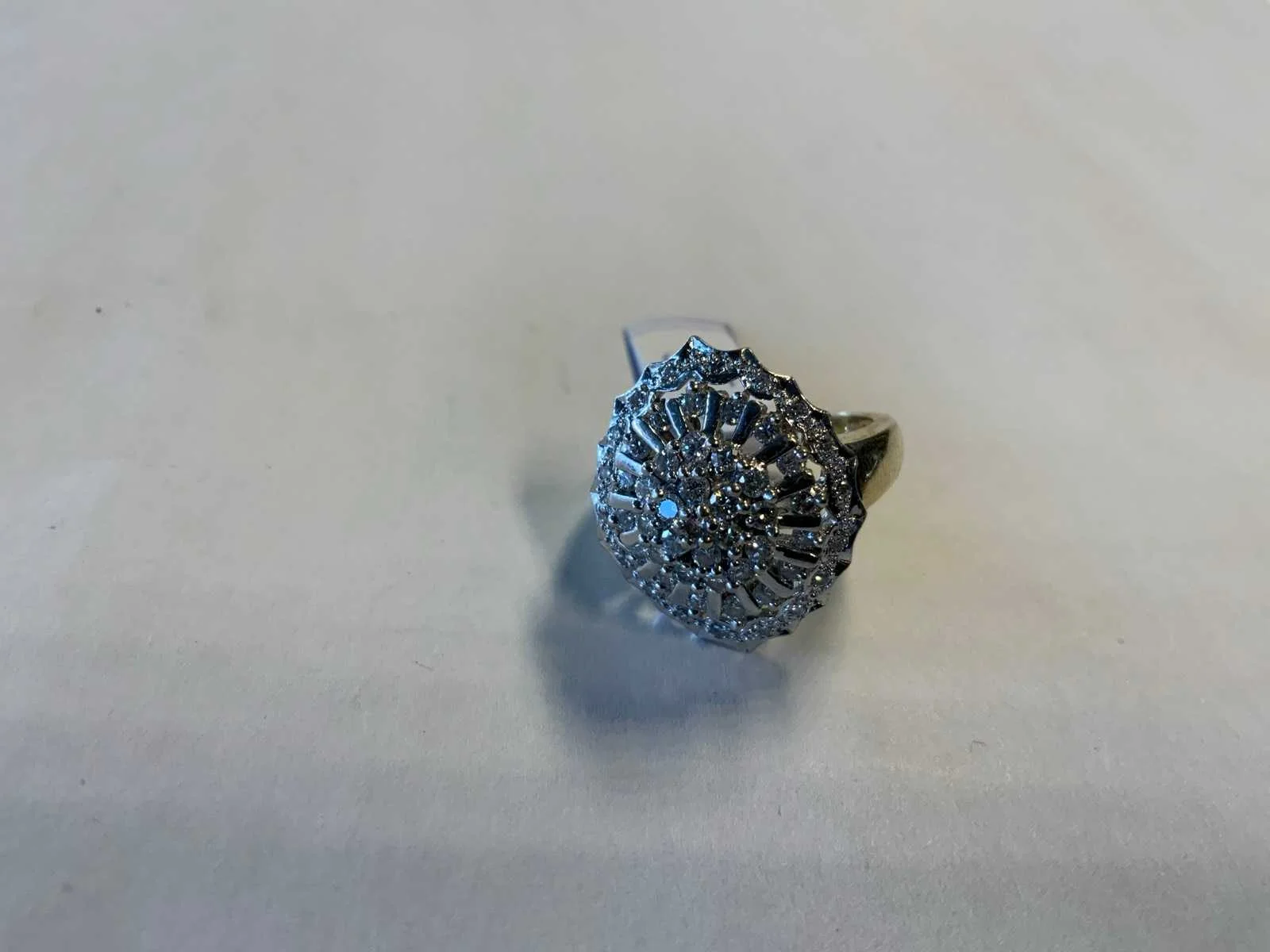 Een 14 karaats (585/000) wit- en geelgouden ring. Markiesvormige kop rijkelijk bezet met briljant geslepen diamanten. Bruto gewicht: 8,3 gram.