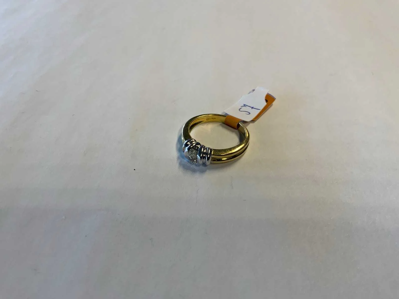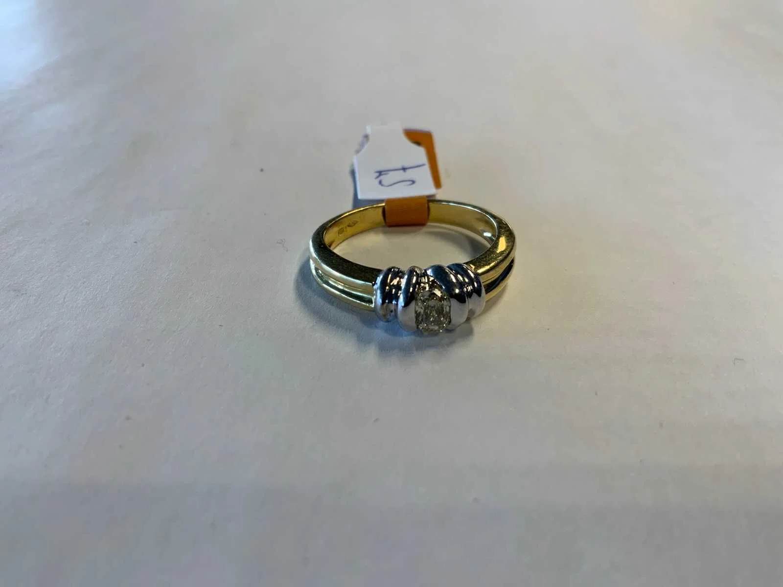 Een 18 karaats (750/000) wit- en geelgouden solitairring, bezet met een ovale gefacetteerde licht gele diamant, ca. 0,25ct., zuiverheid ca.VSI. (waarschijnlijk behandeld) In witgouden spangzetting met bolle schouders. Bruto gewicht: 6,1 gram.