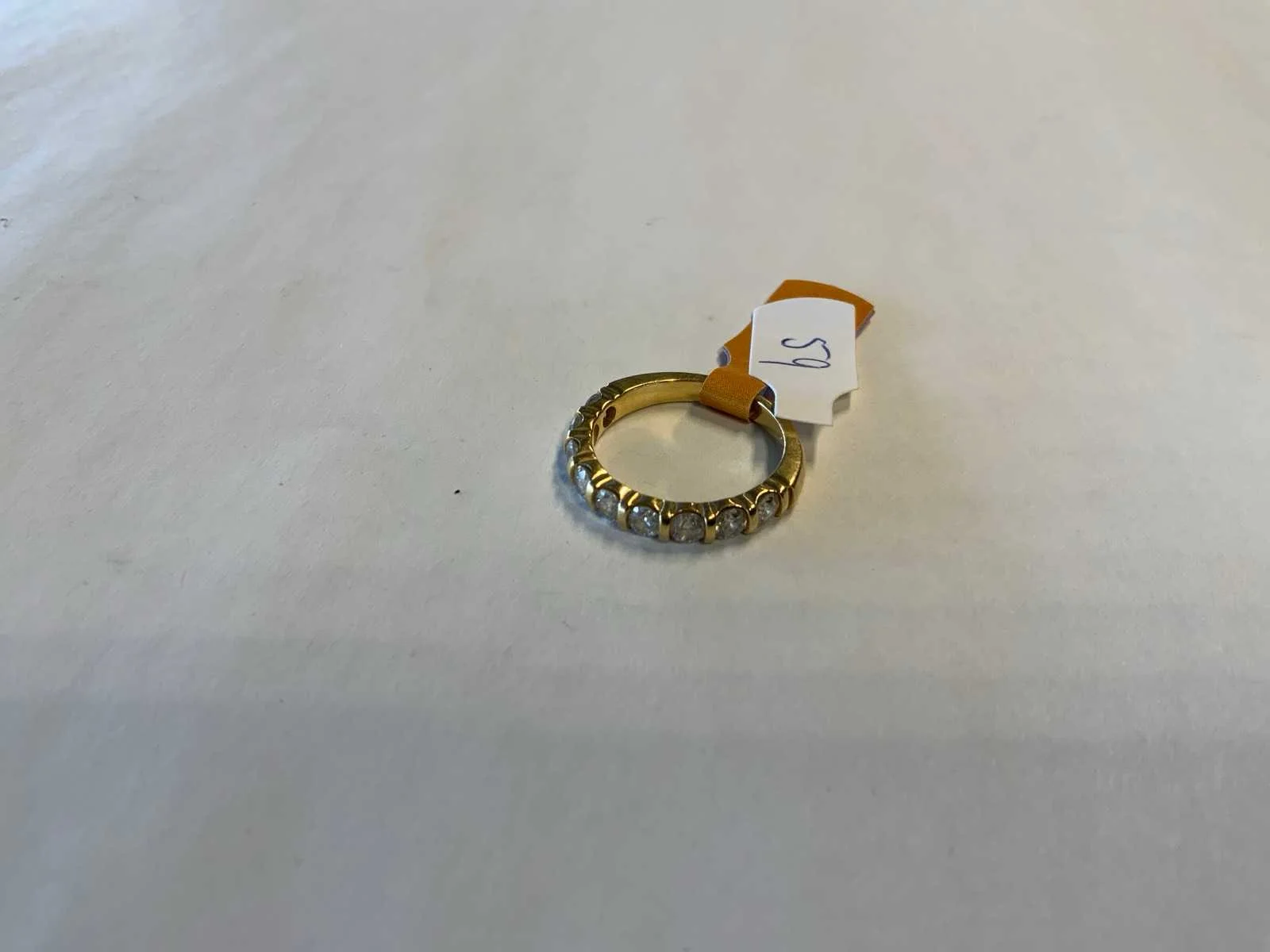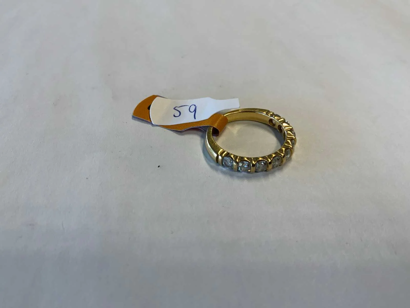 Een 18 karaats (750/000) geelgouden rijring, bezet met zeven briljant geslepen diamanten, totaal 0,60ct, kleur ca. H-I, zuiverheid ca. SI-Pique. Bruto gewicht: 3,4 gram.