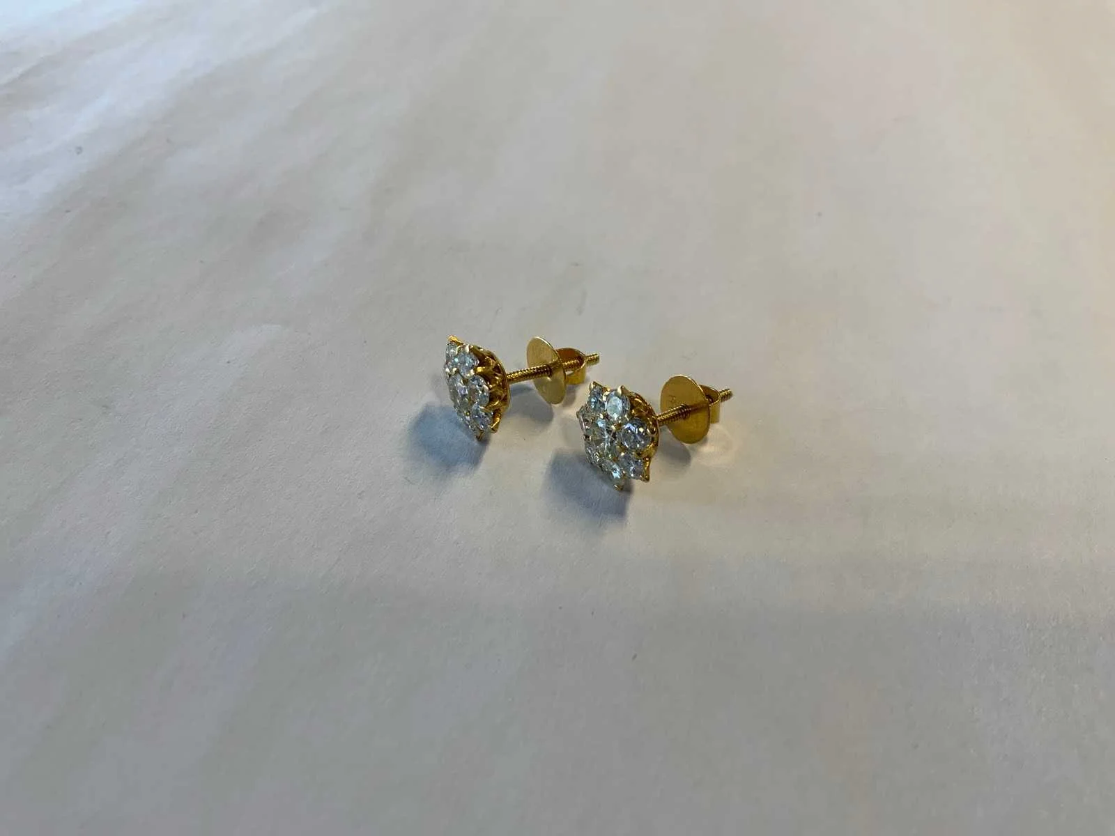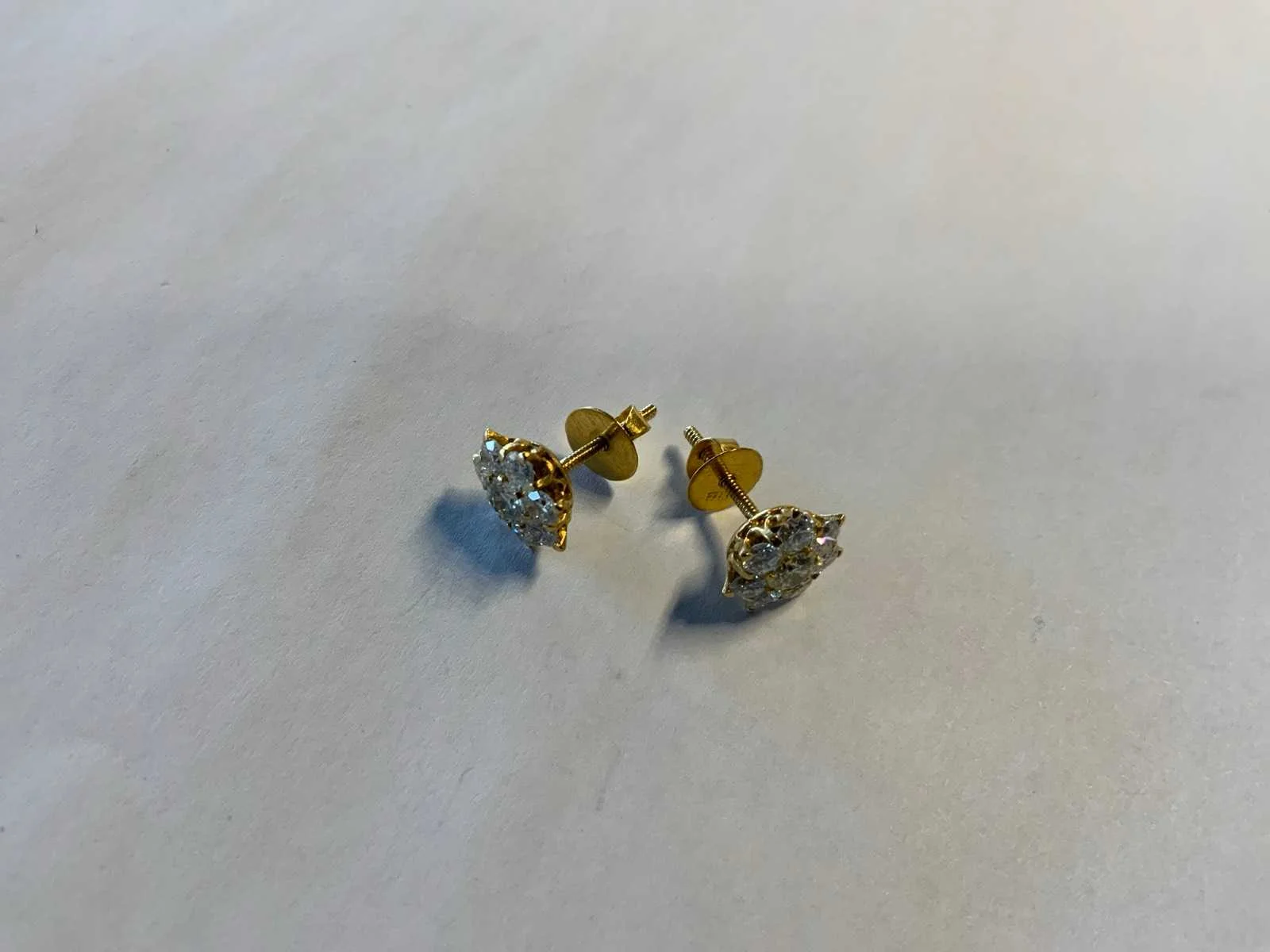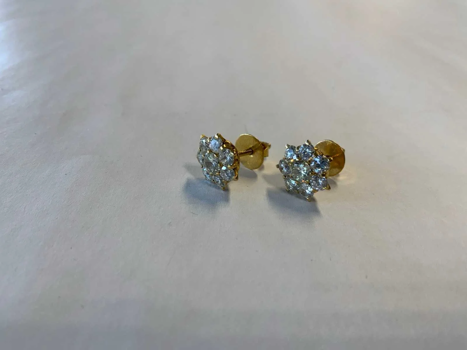 Een paar 20 karaats (833/000) geelgouden rozetoorknoppen. Ieder bezet met centraal een licht gele briljant geslepen diamant, in een entourage van zeven briljant geslepen diamanten, totaal aan diamant ca. 1,0ct. (per oorknop), kleur ca. H-J, zuiverheid ca. VSI-Pique. Bruto gewicht: 3,4 gram.