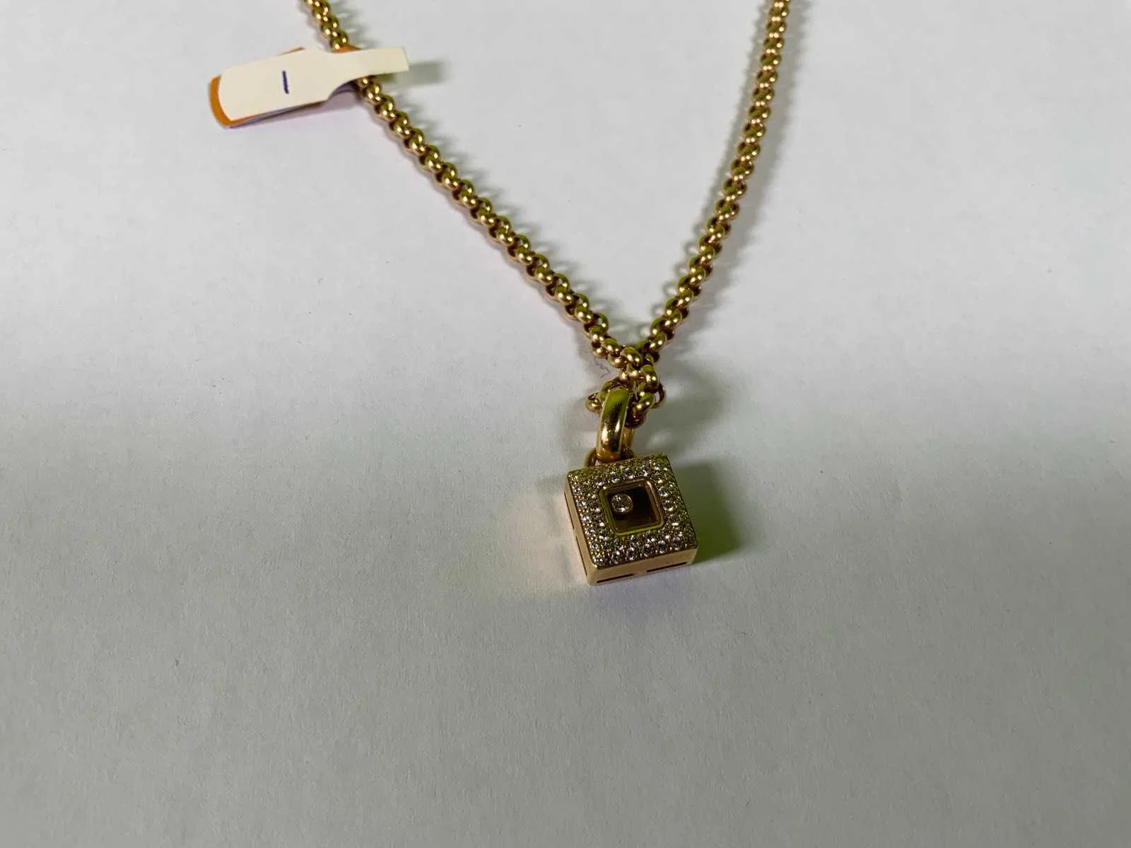Een 18 karaats (750/000) geelgouden jasseron collier waaraan een 18 karaats (750/000) geelgouden hanger, merk Chopard, model "happy diamonds", genummerd 2446191 79/2618-20. Hanger vierkant, pavé bezet met briljant geslepen diamanten, totaal ca. 0,45ct. Centraal een bewegende diamant, ca. 0,05ct. Bruto gewicht: 24,7 gram. Merk: Chopard Model: Happy diamonds Materiaal: geelgoud
