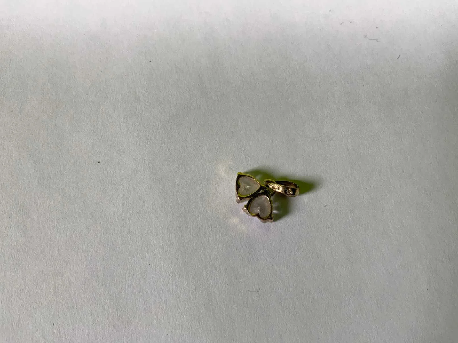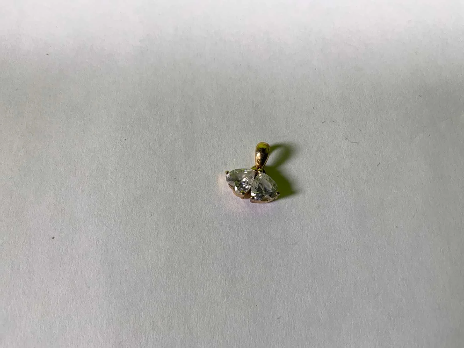 Een 14 karaats (585/000) geelgouden hanger bezet met twee hartgeslepen zirkonia's. Bruto gewicht: 0,8 gram.
