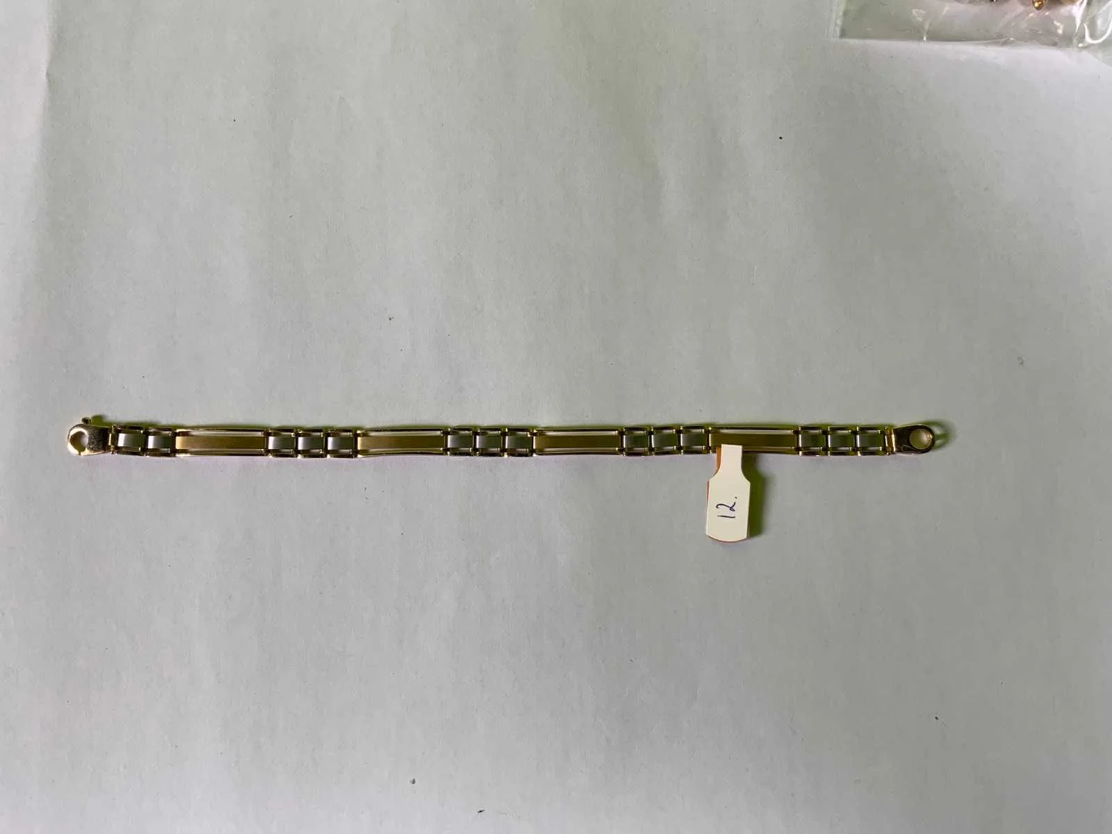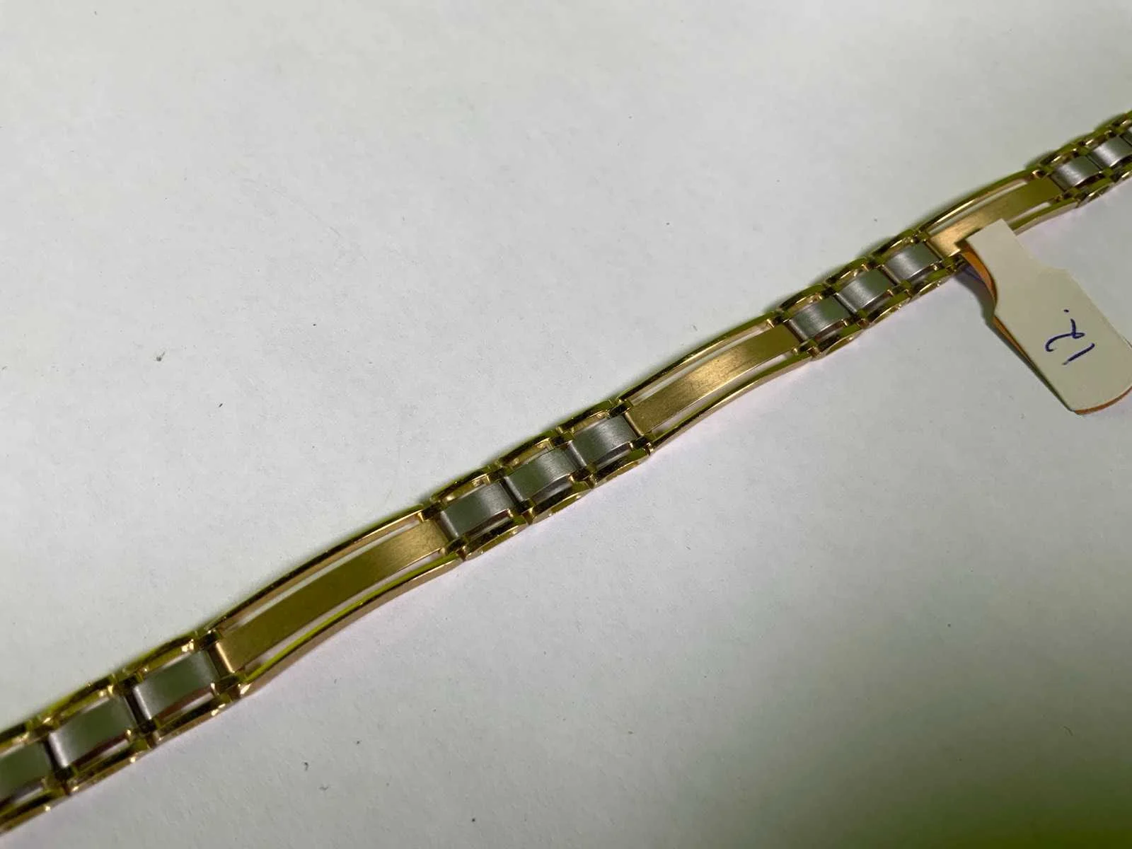 Een 18 karaats (750/000) wit- en geelgouden gematteerde armband. Bruto gewicht: 15,9 gram.