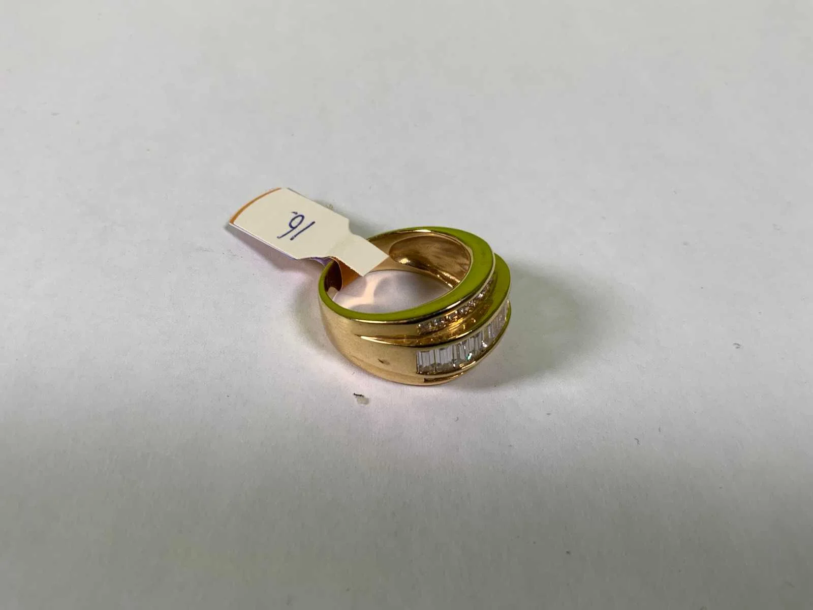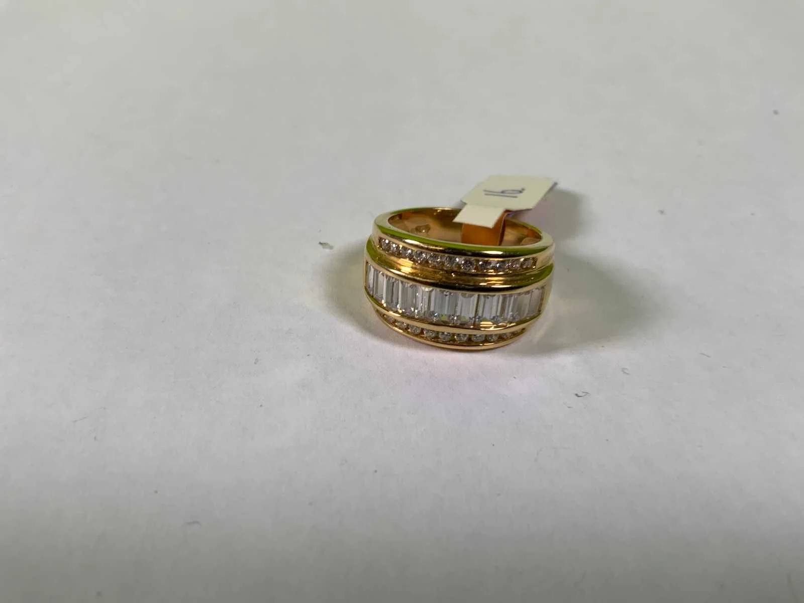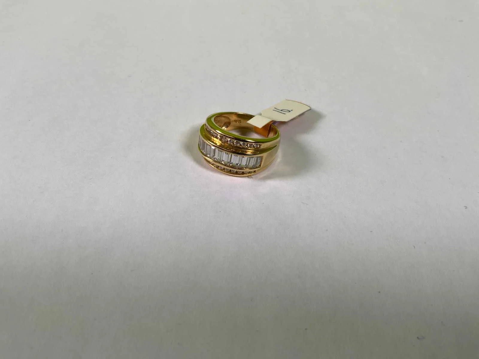 Een 18 karaats (750/000) geelgouden ring, bezet met drie rijen baguette en rond geslepen zirkonia's. Bruto gewicht: 9,8 gram.