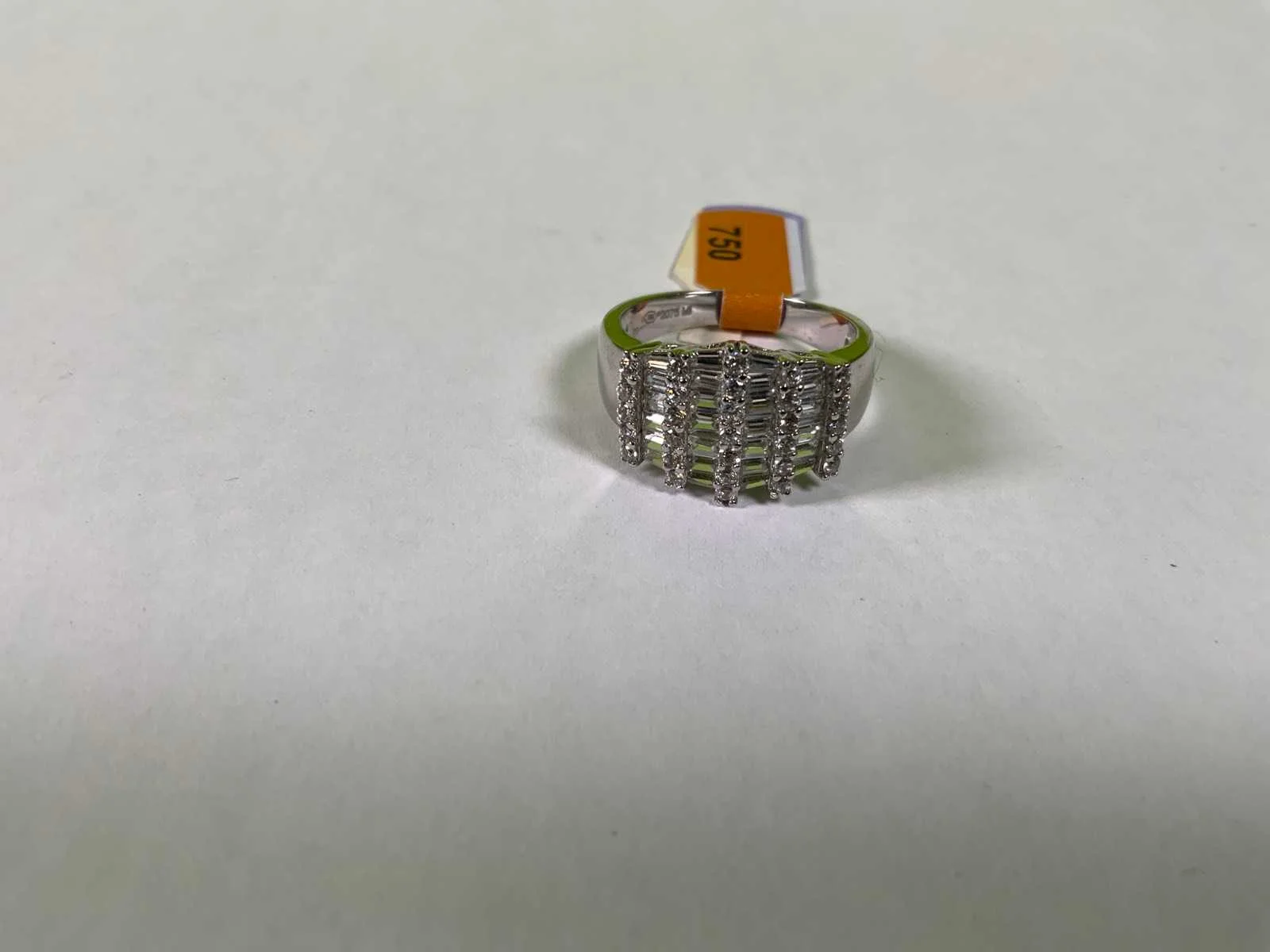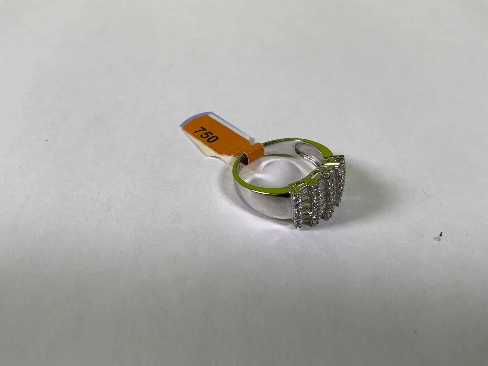 Een 18 karaats (750/000) witgouden ring, bezet met baguette en rond geslepen zirkonia's. Bruto gewicht: 5,6 gram.