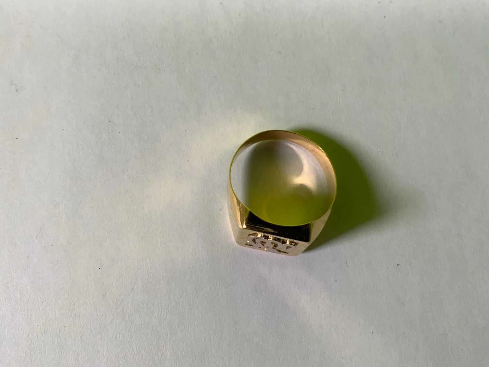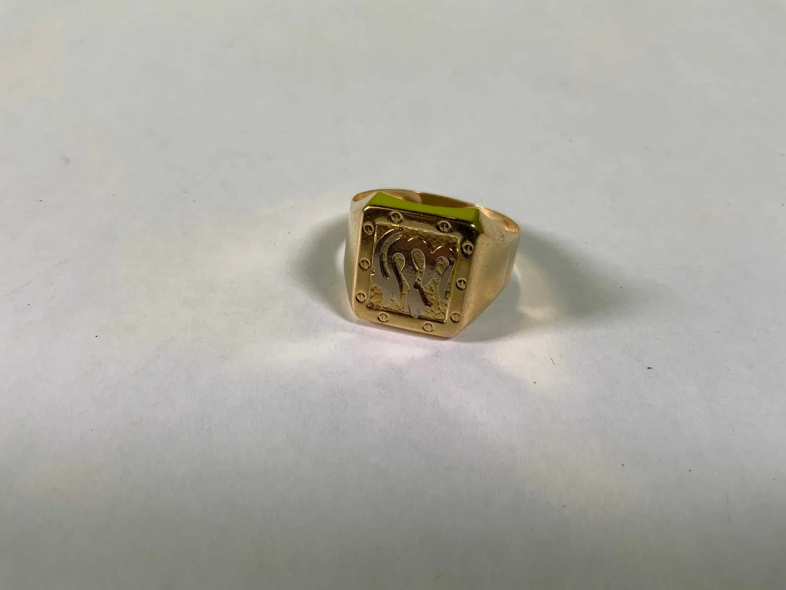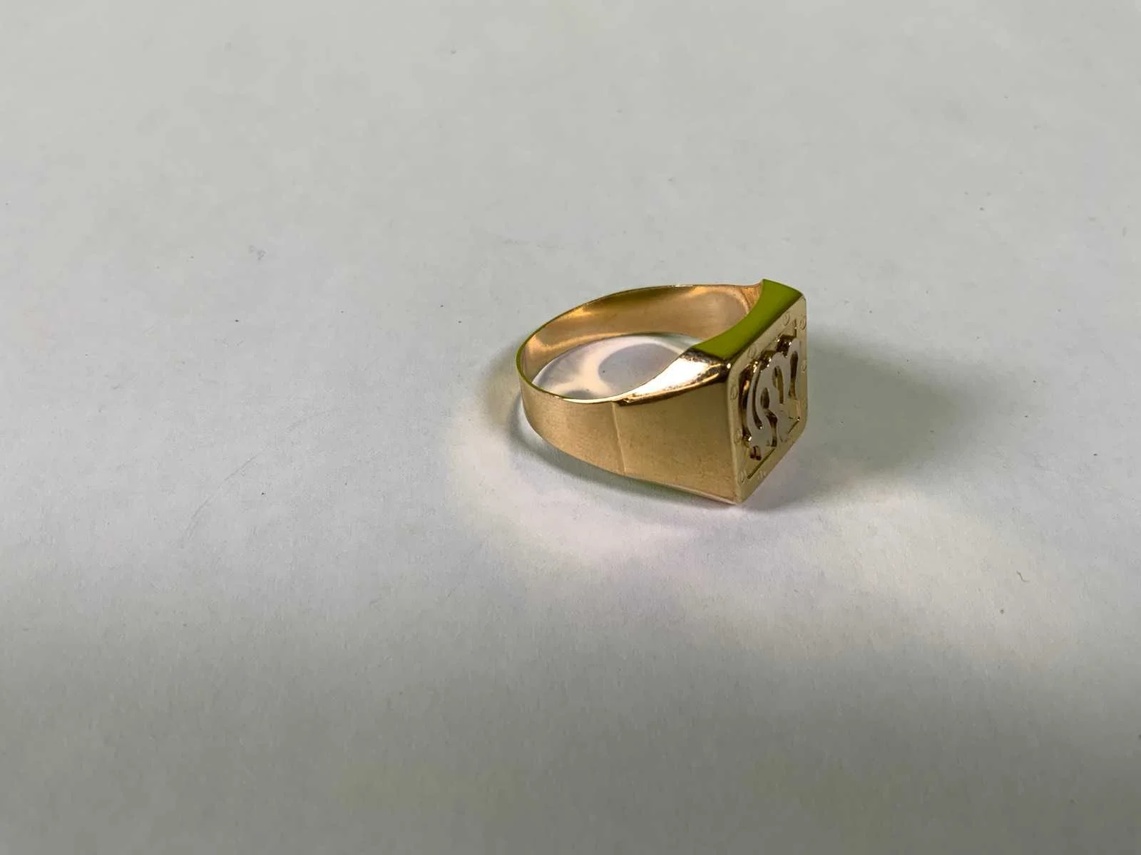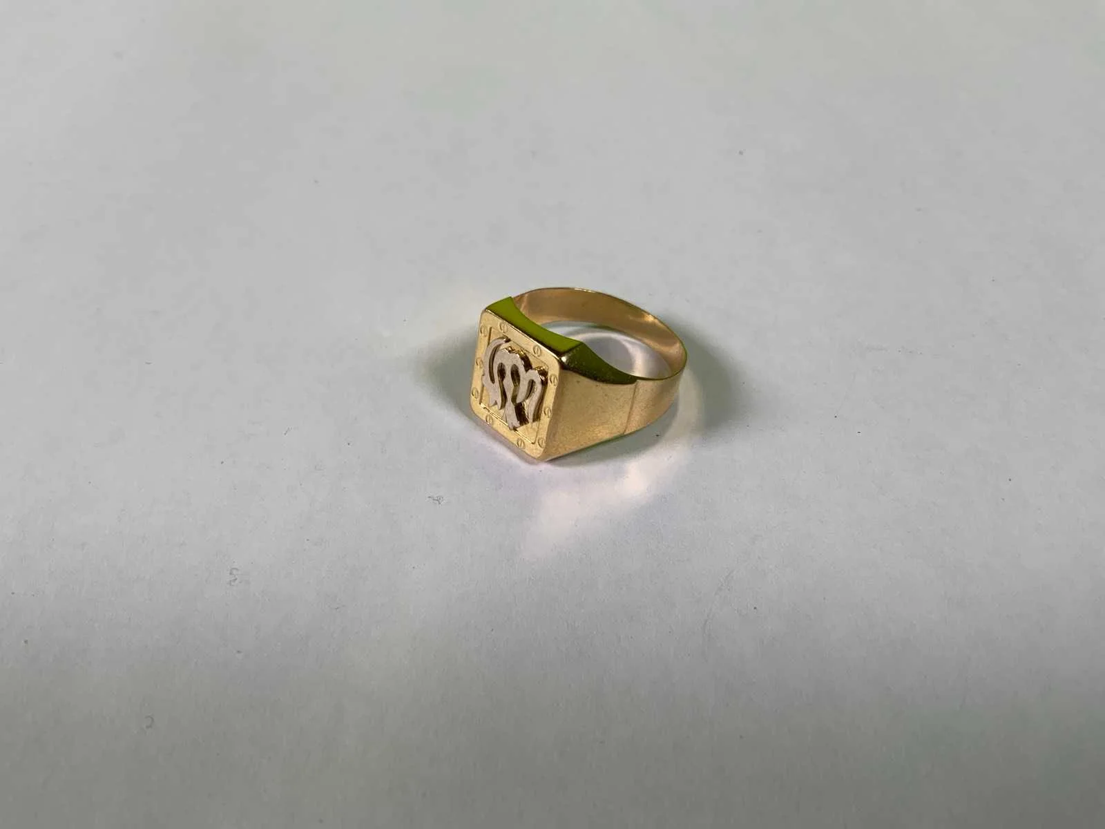 Een 18 karaats (750/000) geelgouden ring, rechthoekige kop met witgouden karakter. Bruto gewicht: 5,4 gram.