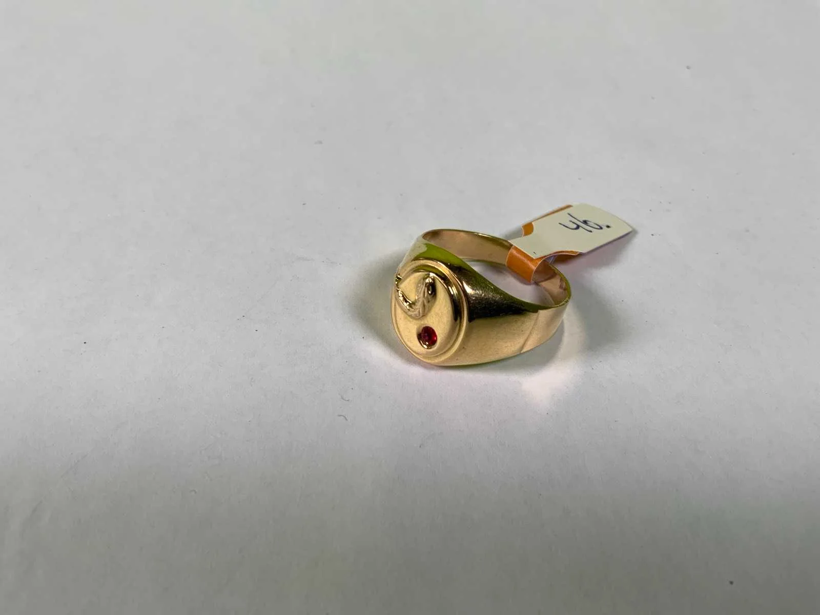 Een 18 karaats (750/000) geelgouden ring, bovenzijde met slang en rood glas. Bruto gewicht: 6,2 gram.
