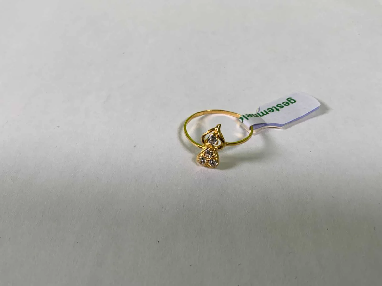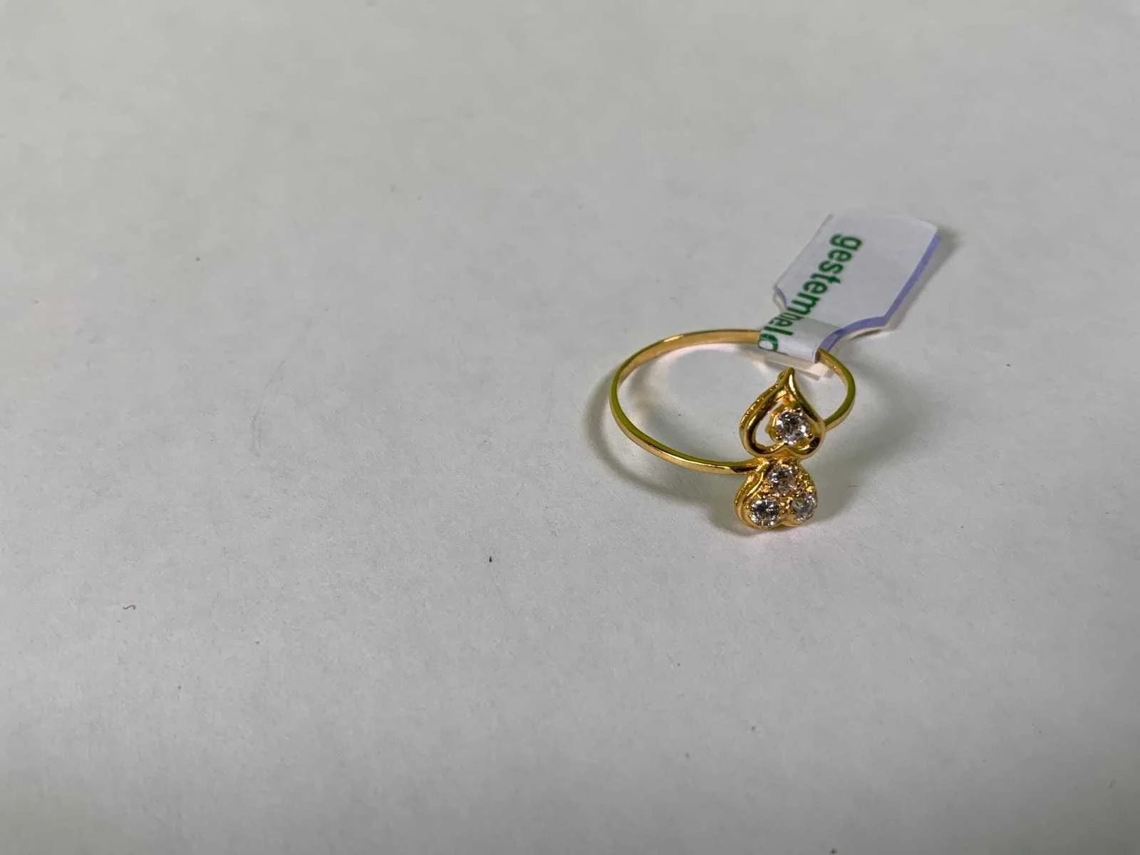 Een 20 karaats (833/000) geelgouden ring met twee hartjes, bezet met zirkonia's. Bruto gewicht: 1,0 gram.