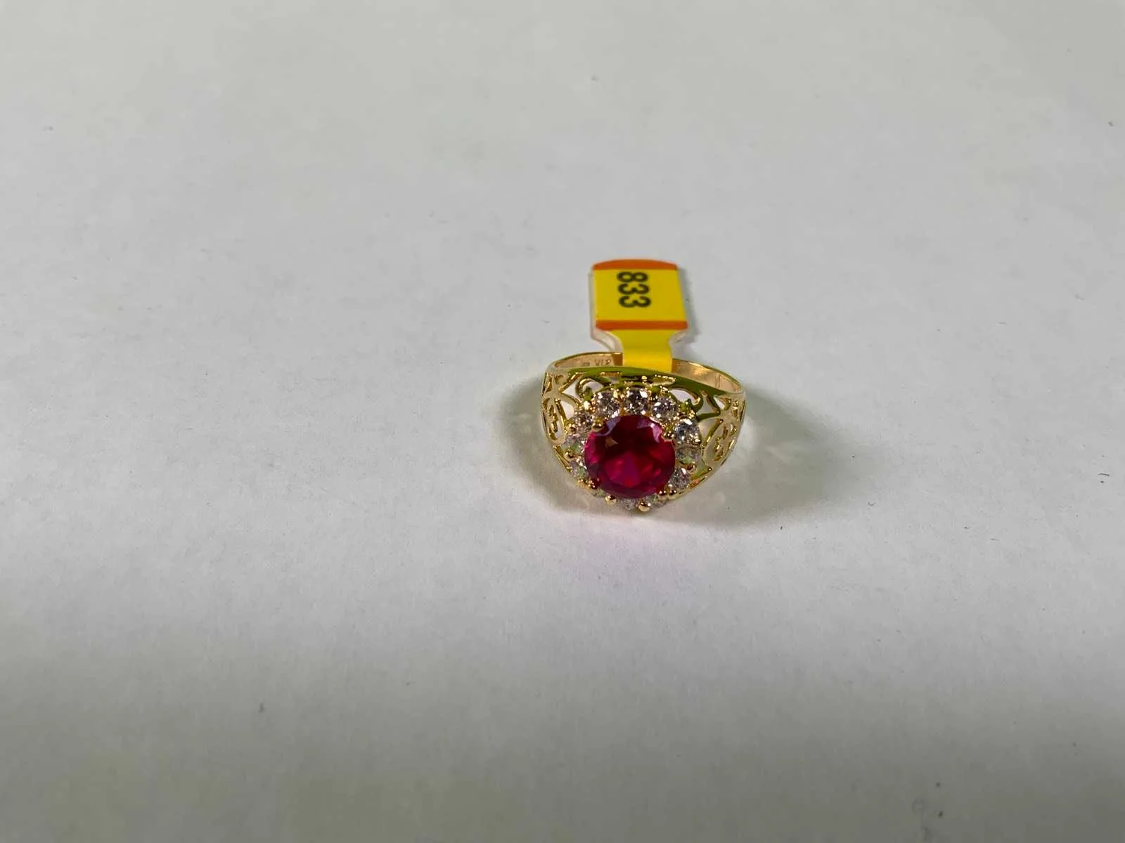 Een 20 karaats (833/000) geelgouden entouragering, bezet met een synthetische robijn in een entourage van zirkonia's. Bruto gewicht: 3,3 gram.