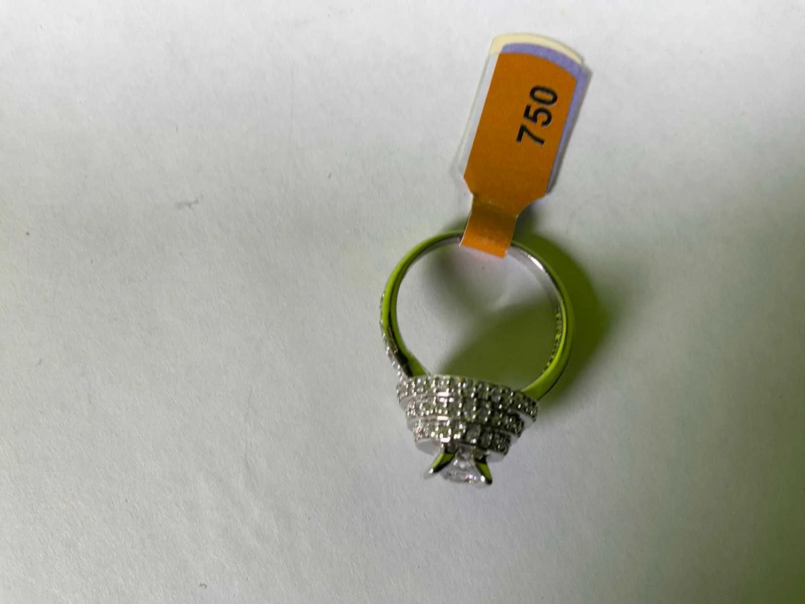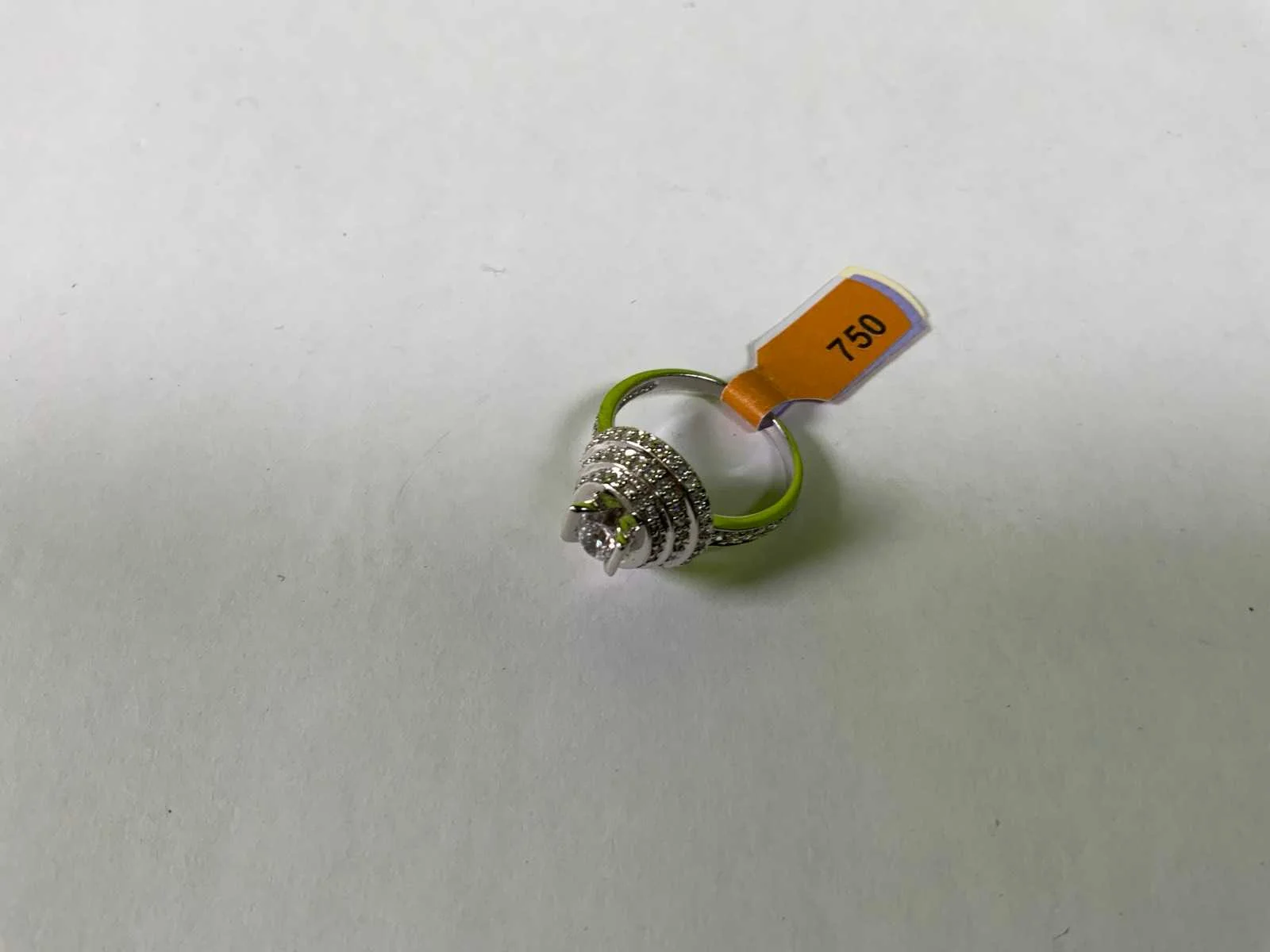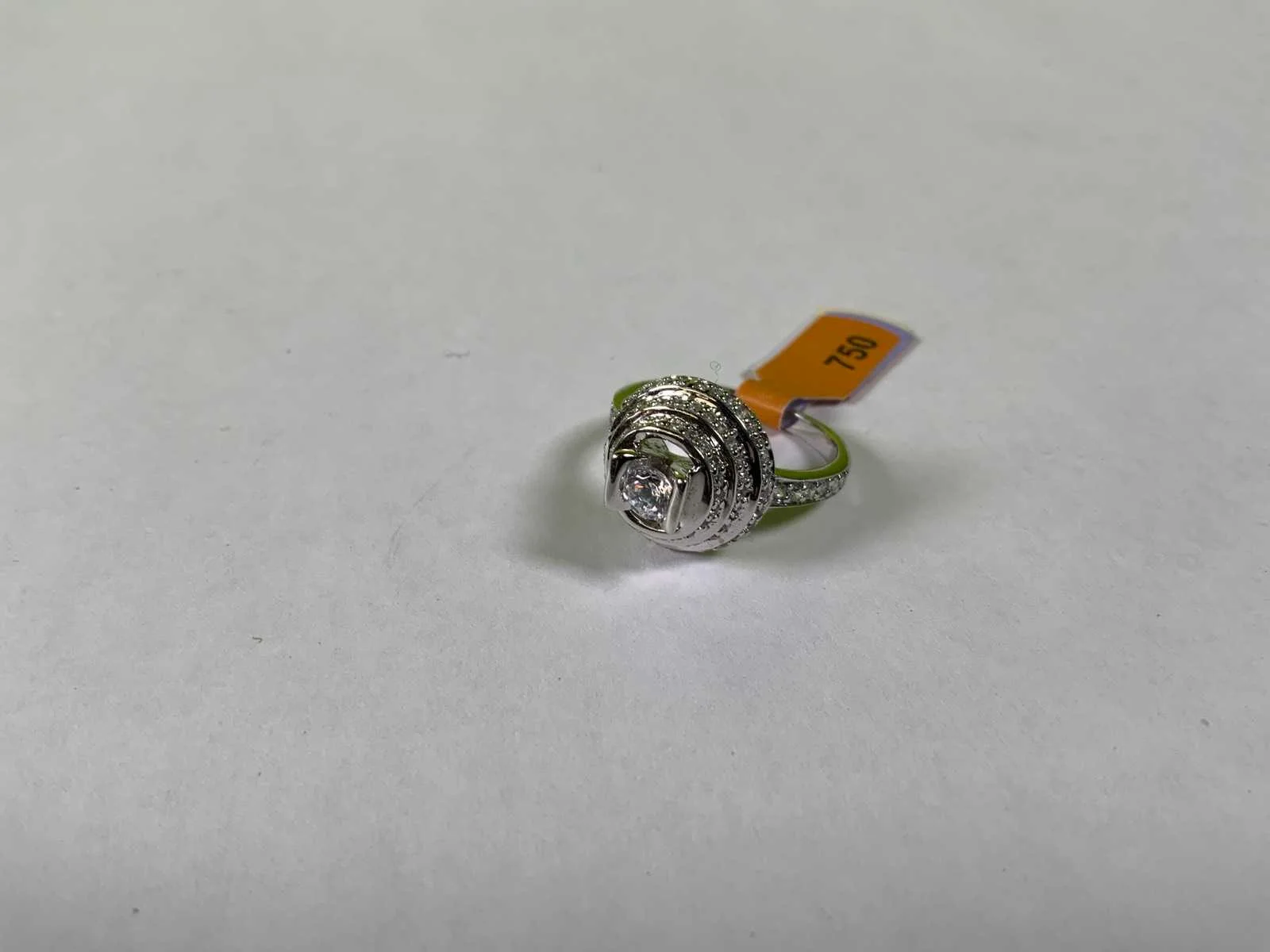 Een 18 karaats (750/000) witgouden ring, centraal bezet met een zirkonia, op ronde trapvorm, bezet met zirkonia's. Bruto gewicht: 5,6 gram