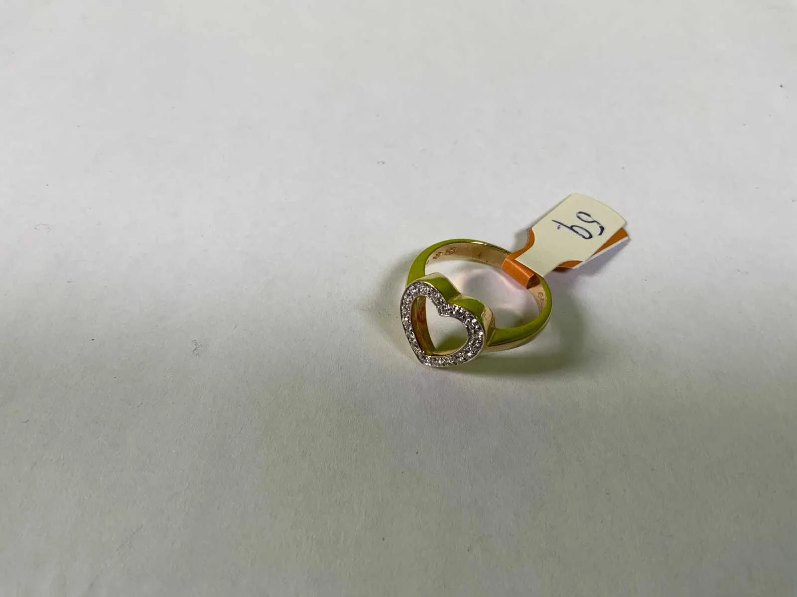 Een 18 karaats (750/000) geelgouden ring, centraal een open hartvorm bezet met zirkonia's. Bruto gewicht: 5,3 gram.