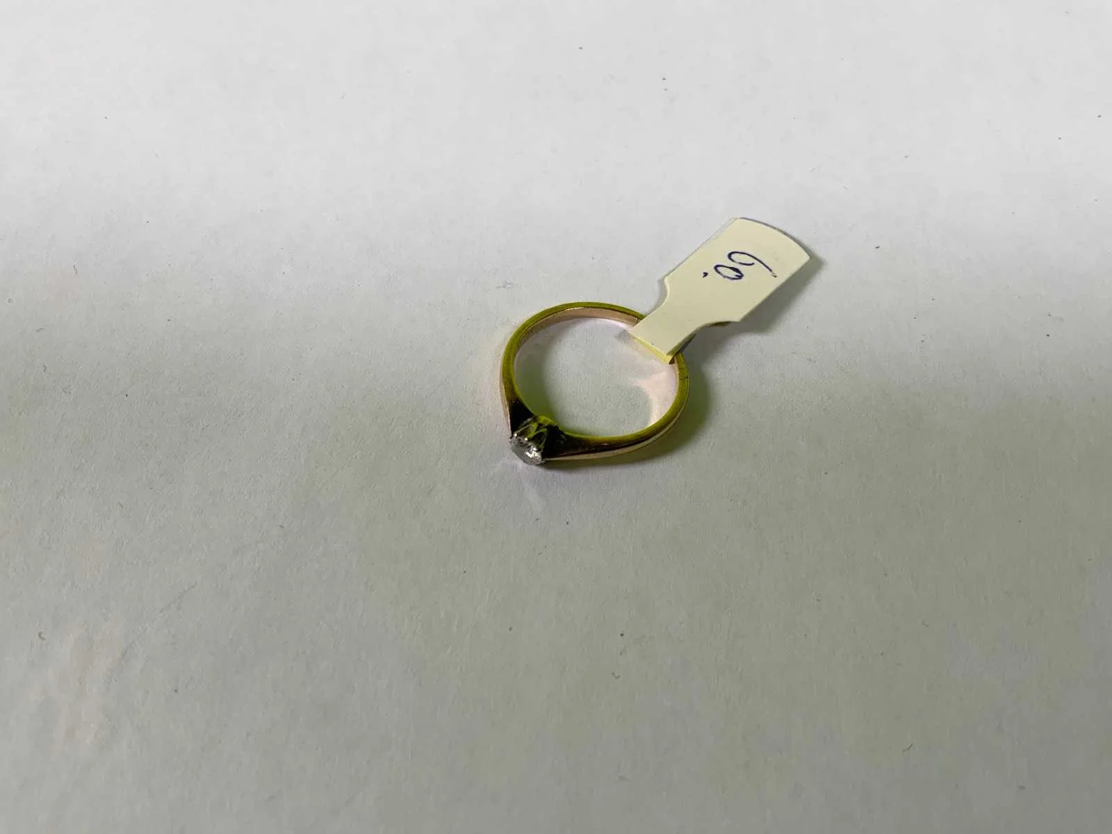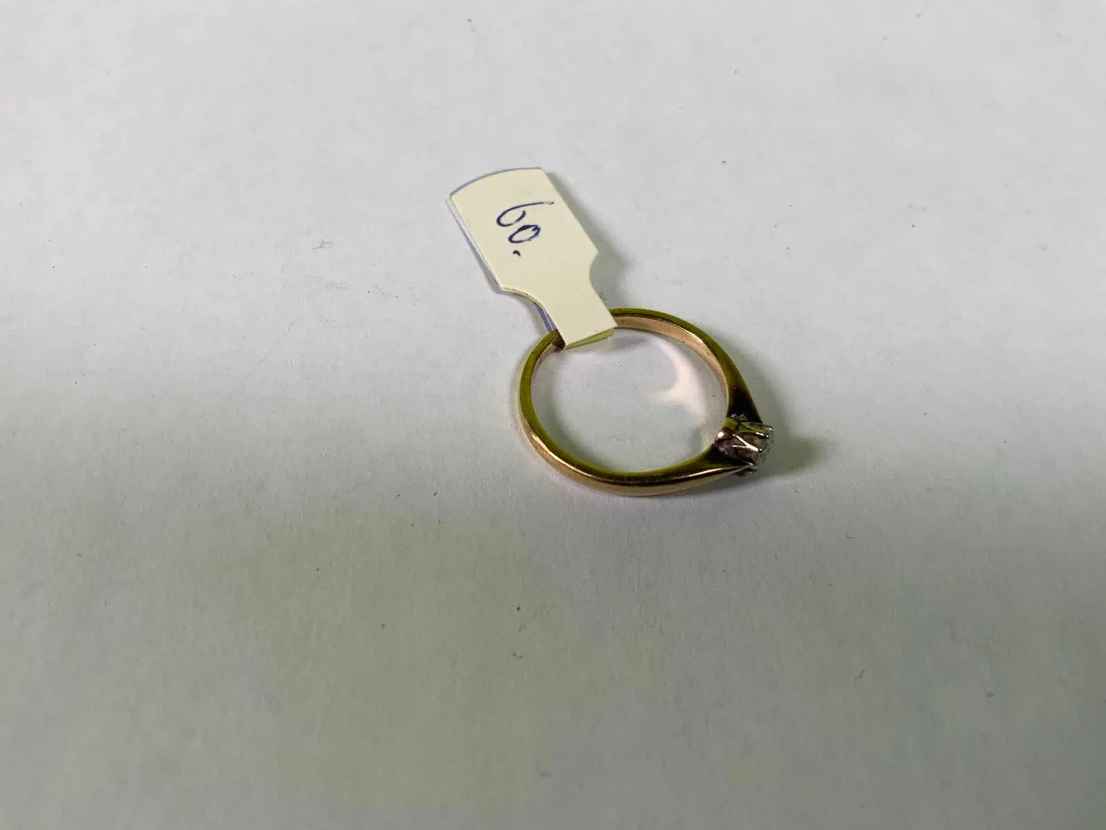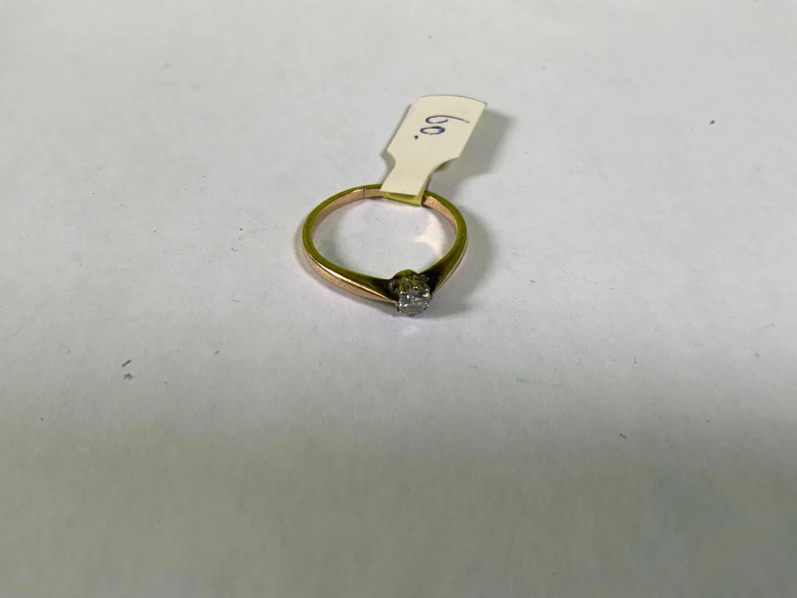 Een 14 karaats (585/000) geelgouden solitairring, bezet met een briljant geslepen diamant, ca. 0,20ct., kleur ca. H, zuiverheid ca. VSI. Gezet in een witgouden zespootchaton. Bruto gewicht: 1,8 gram.