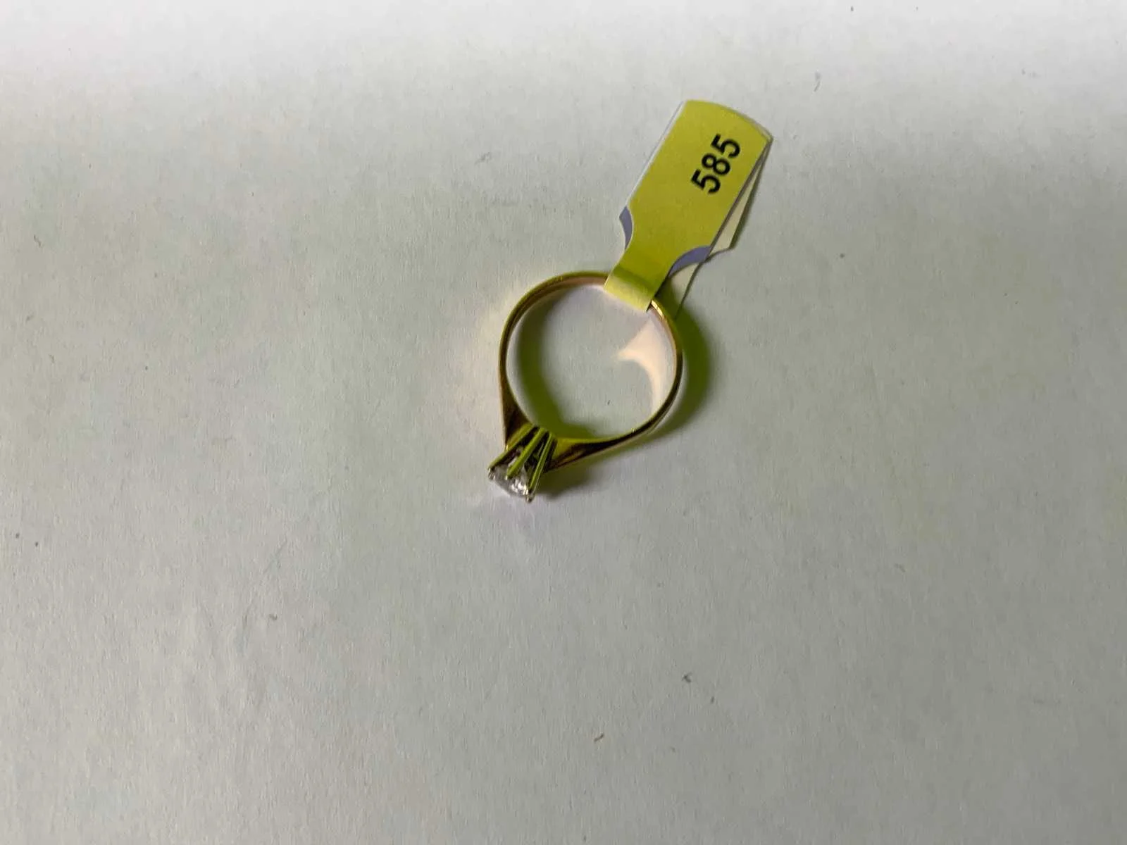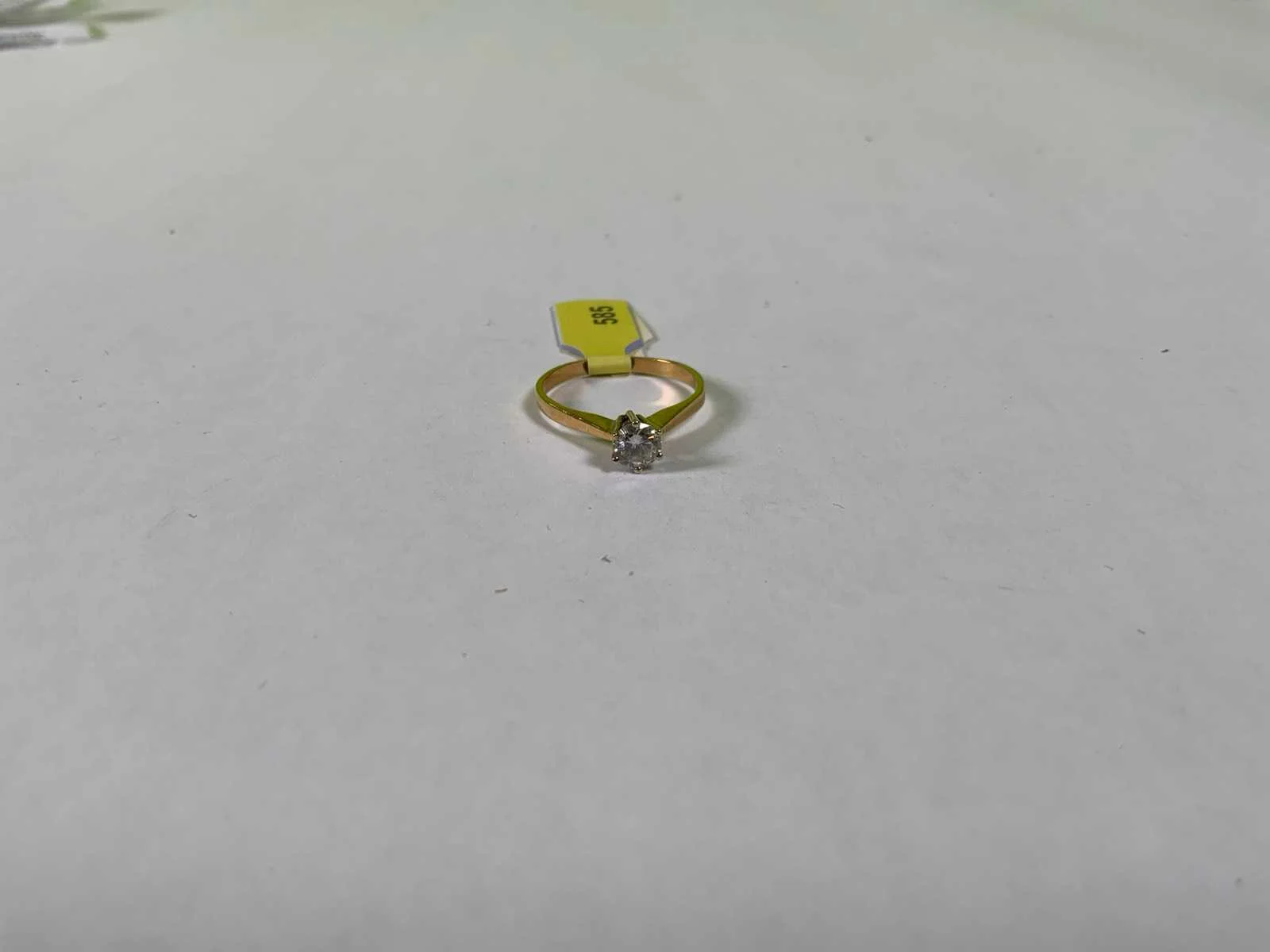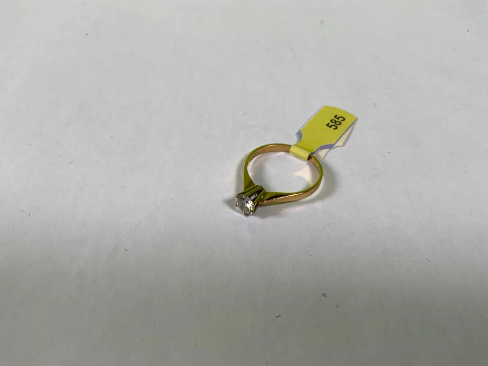 Een 14 karaats (585/000) geelgouden solitairring, bezet met een briljant geslepen diamant, ca. 0,45ct., kleur ca. J, zuiverheid ca. Pique. Gezet in een witgouden zespootchaton. Bruto gewicht: 1,8 gram.