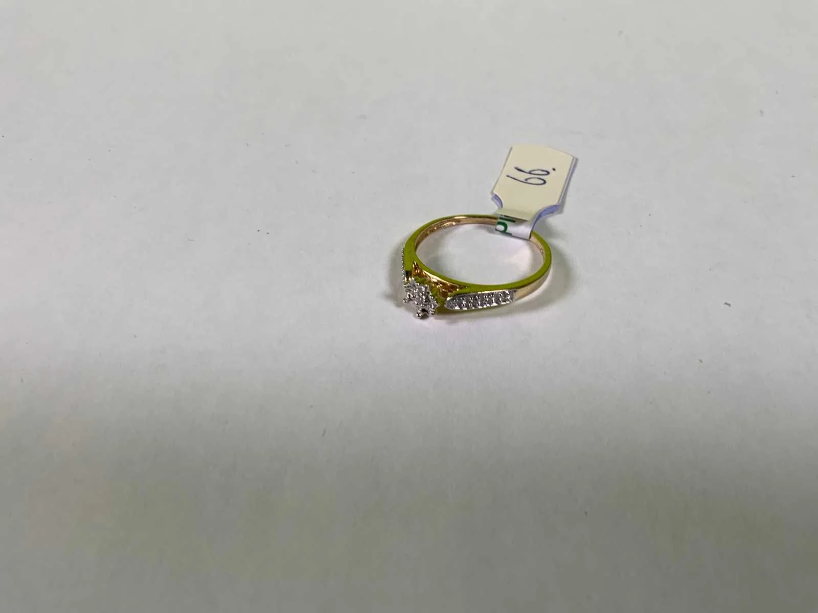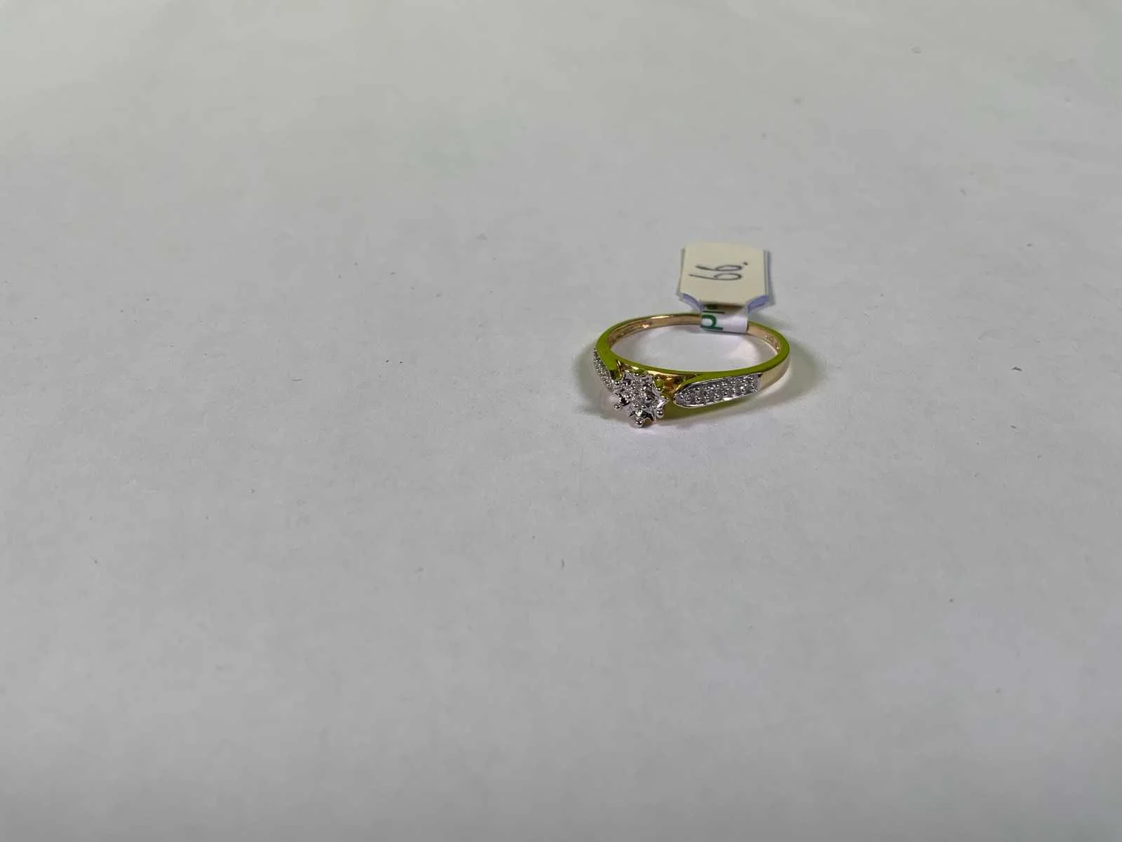Een 14 karaats (585/000) wit- en geelgouden solitairring, bezet met briljant geslepen diamant, in witgouden spiegelchaton. Op de schouders kleine diamanten. Bruto gewicht: 1,9 gram.