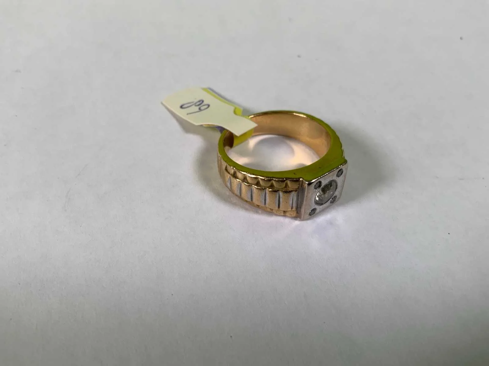 Een 14 karaats (585/000) wit- en geelgouden ring, bezet met een briljant geslepen diamant, ca. 0,50ct., kleur ca. L, zuiverheid ca. Pique. en vier kleinere diamanten. Schouders met Rolexschakel decoratie. Bruto gewicht: 12,9 gram.