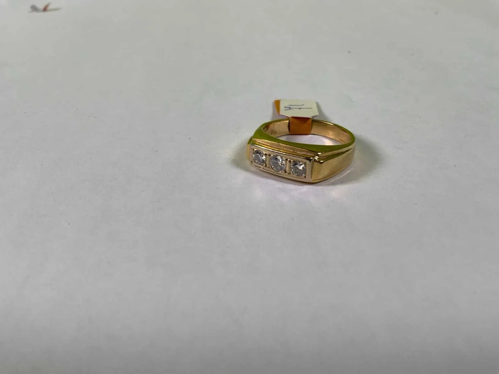Een 18 karaats (750/000) geelgouden rijring, bezet met drie briljant geslepen diamanten, totaal ca. 0,40ct., kleur ca. H, zuiverheid ca. VSI/SI. Bruto gewicht: 7,6 gram.