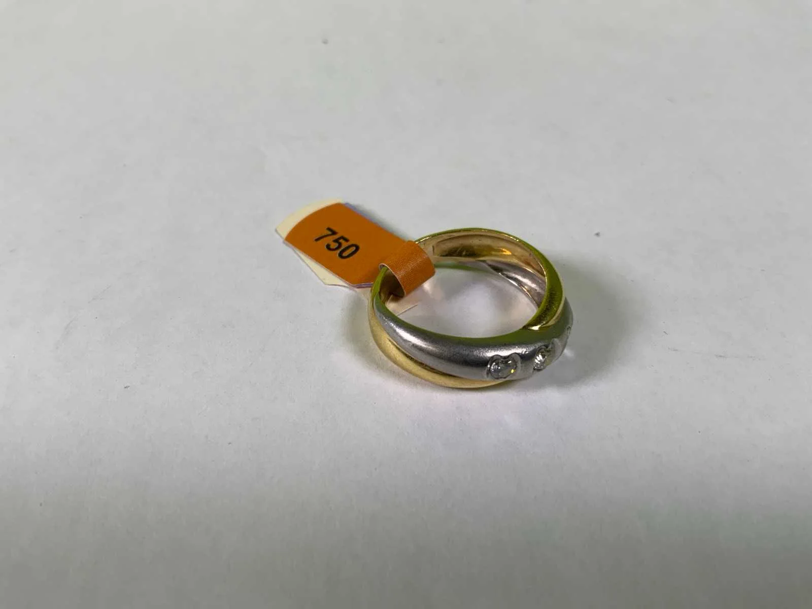 Een 18 karaats (750/000) wit- en geelgouden ring, bestaande uit een geelgouden ring, waarover kruisend een gematteerde witgouden ring, bezet met drie briljant geslepen diamanten, totaal ca. 0,25ct., kleur ca. H, zuiverheid ca. VSI. Bruto gewicht: 6,5 gram