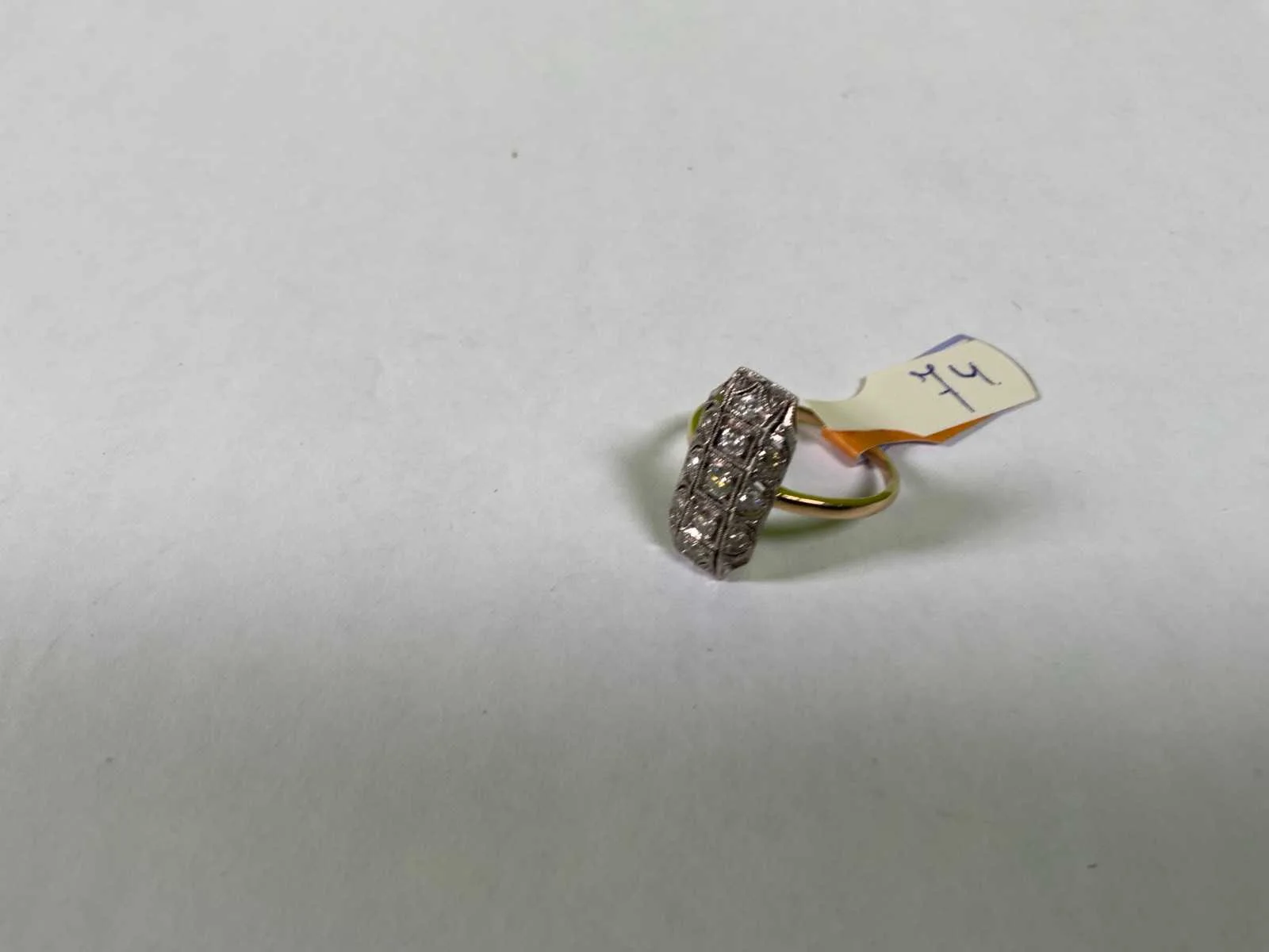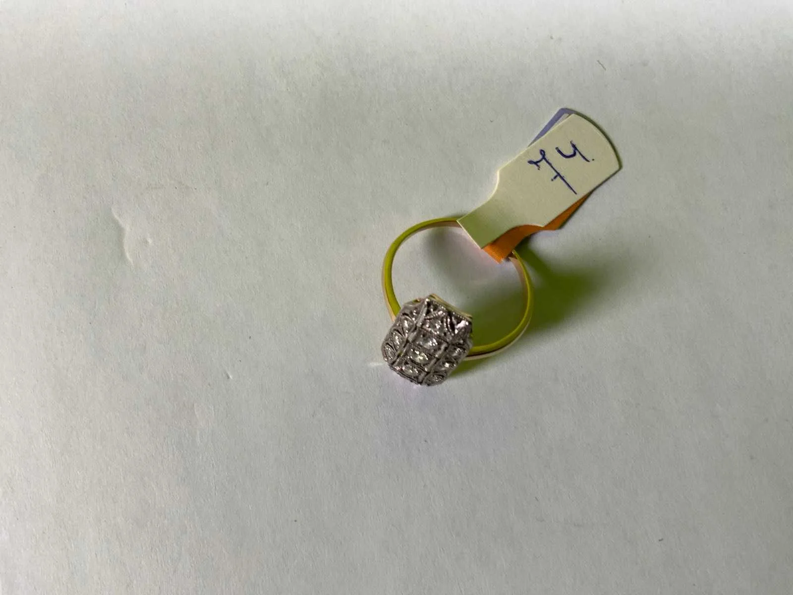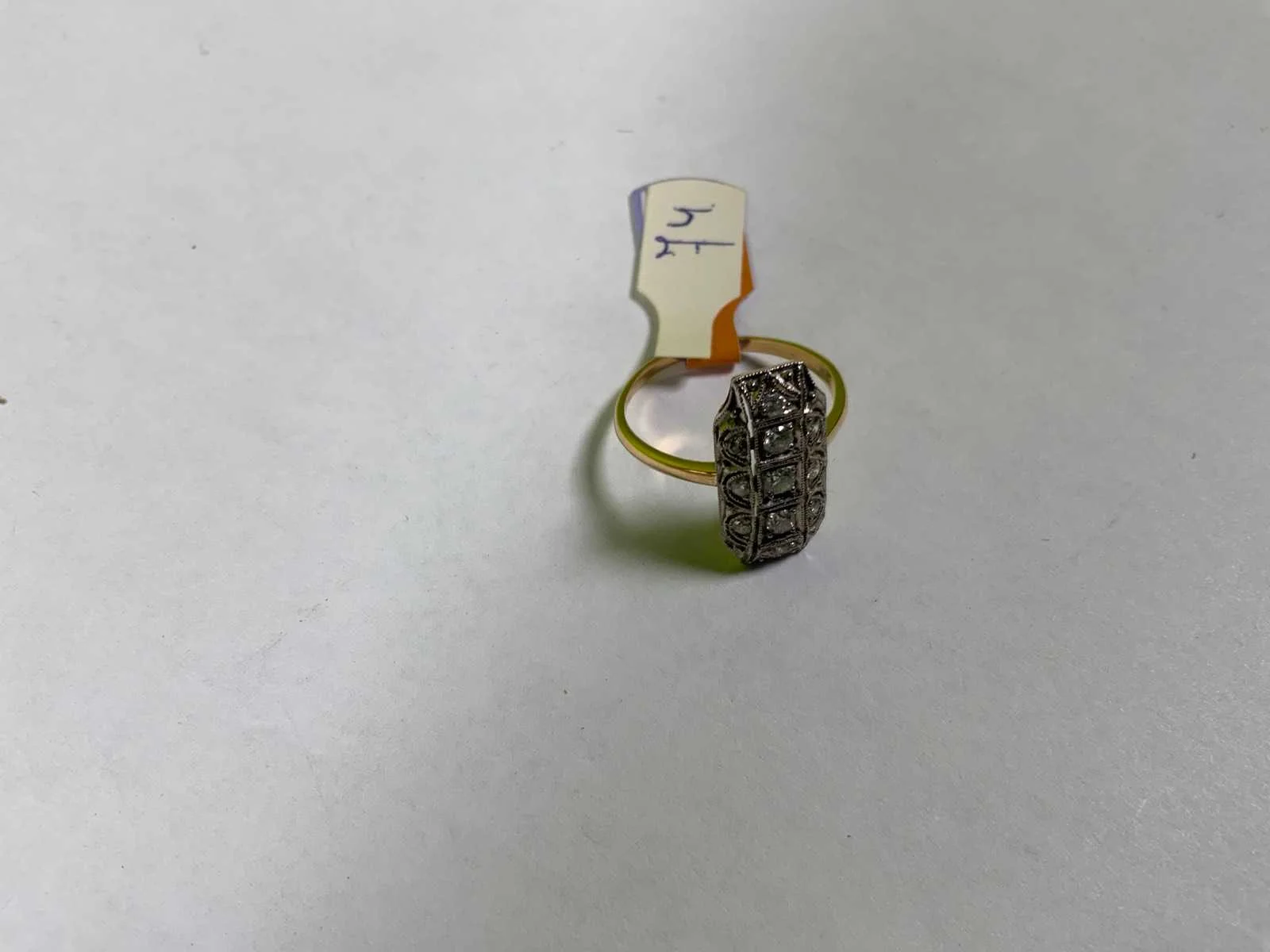 Een 18 karaats (750/000) wit- en geelgouden ring, Art-Deco stijl. Rechthoekige kop met geometrische vormen en bezet met briljant geslepen diamanten, 0,25ct., kleur ca. J, zuiverheid ca. SI/Pique. Bruto gewicht: 3,2 gram.