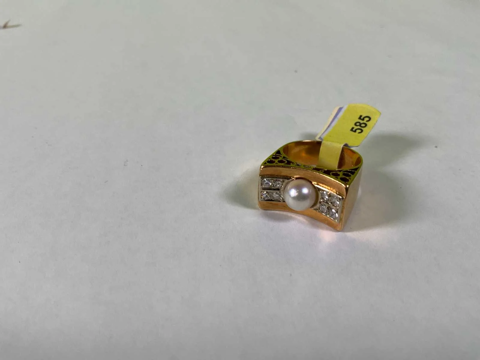 Een 14 karaats (585/000) geelgouden ring, bezet met een cultivé parel en vier achtkant geslepen diamanten. Bruto gewicht: 9,1 gram.