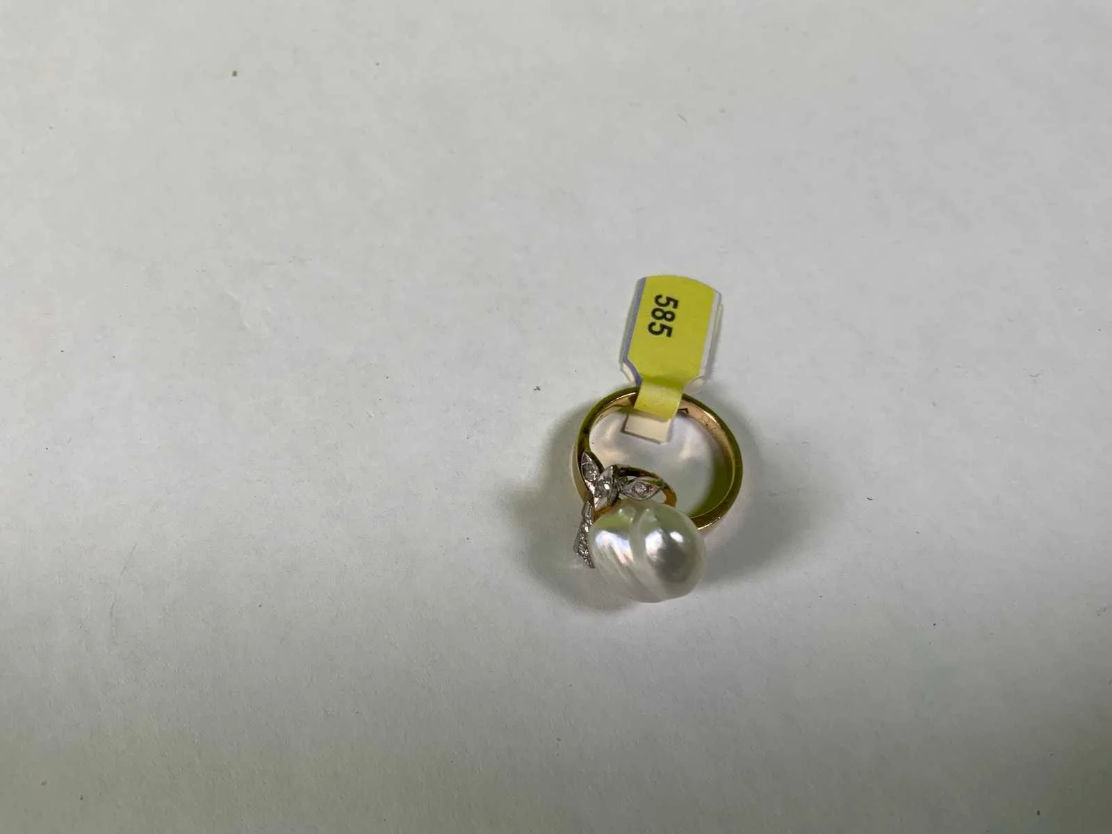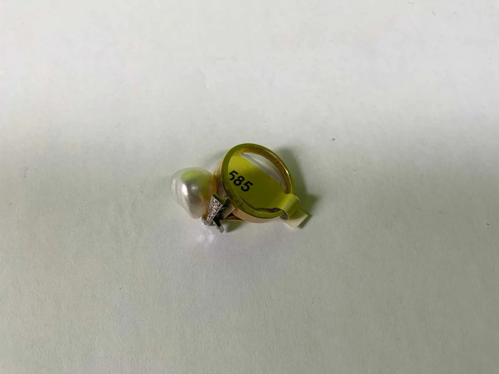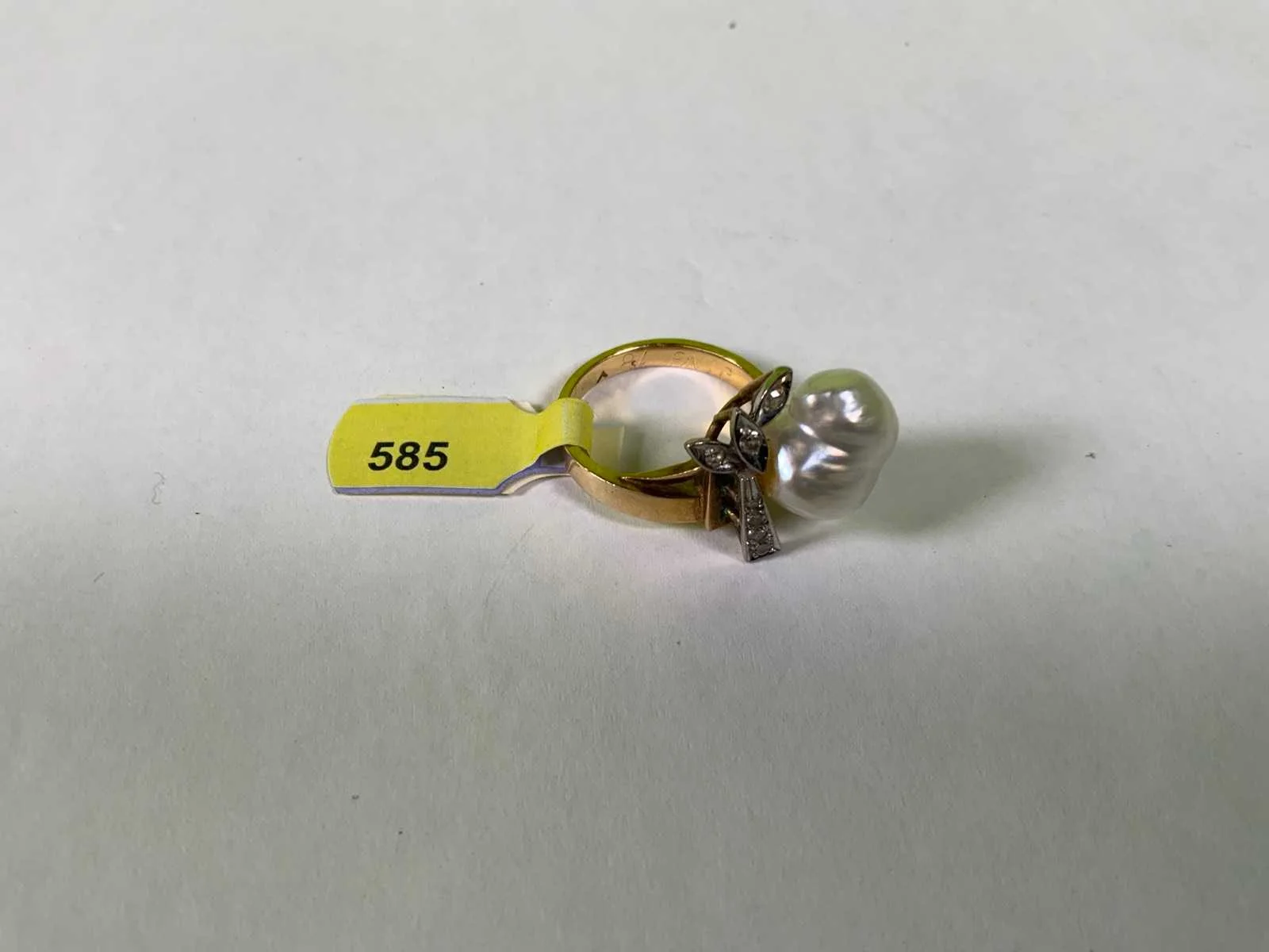 Een 14 karaats (585/000) wit- en geelgouden ring, bezet met een barok cultivé parel en diamanten. Bruto gewicht: 6,7 gram.