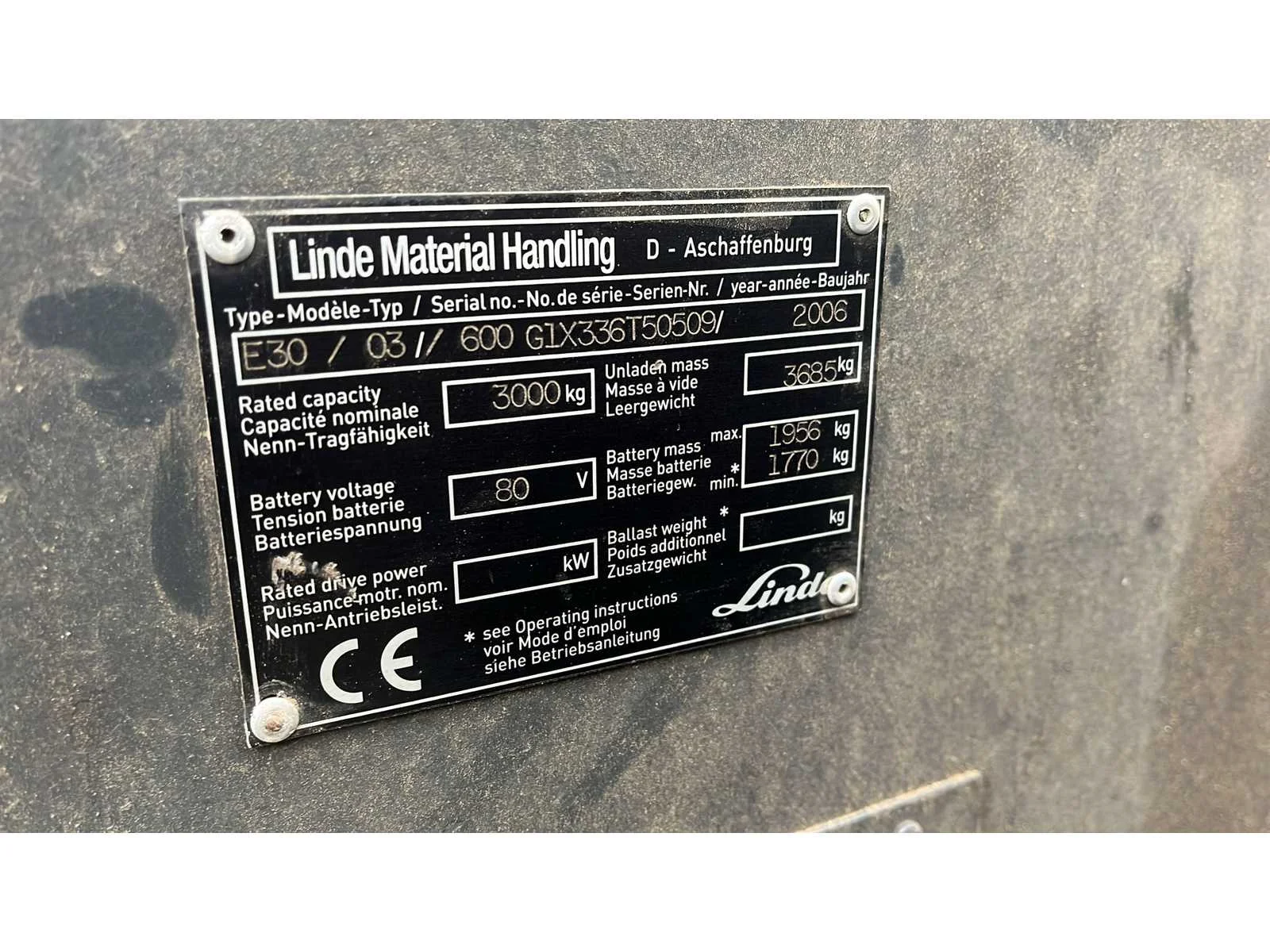 Merk: Linde Type: E30-03 Bouwjaar: 2006 Serienummer: 600G336T50509 Brandstof: Elektrisch Mast: Triple Soort band: Volrubber banden Aantal wielen: 4 Afgelezen urenstand: 20343 Free-lift: true Side-shift: true Triple mast: true Eigen gewicht: 3685kg Hefvermogen: 3000kg Lepellengte: 1200mm Min. hefhoogte: 4650mm Vol rubber banden: true