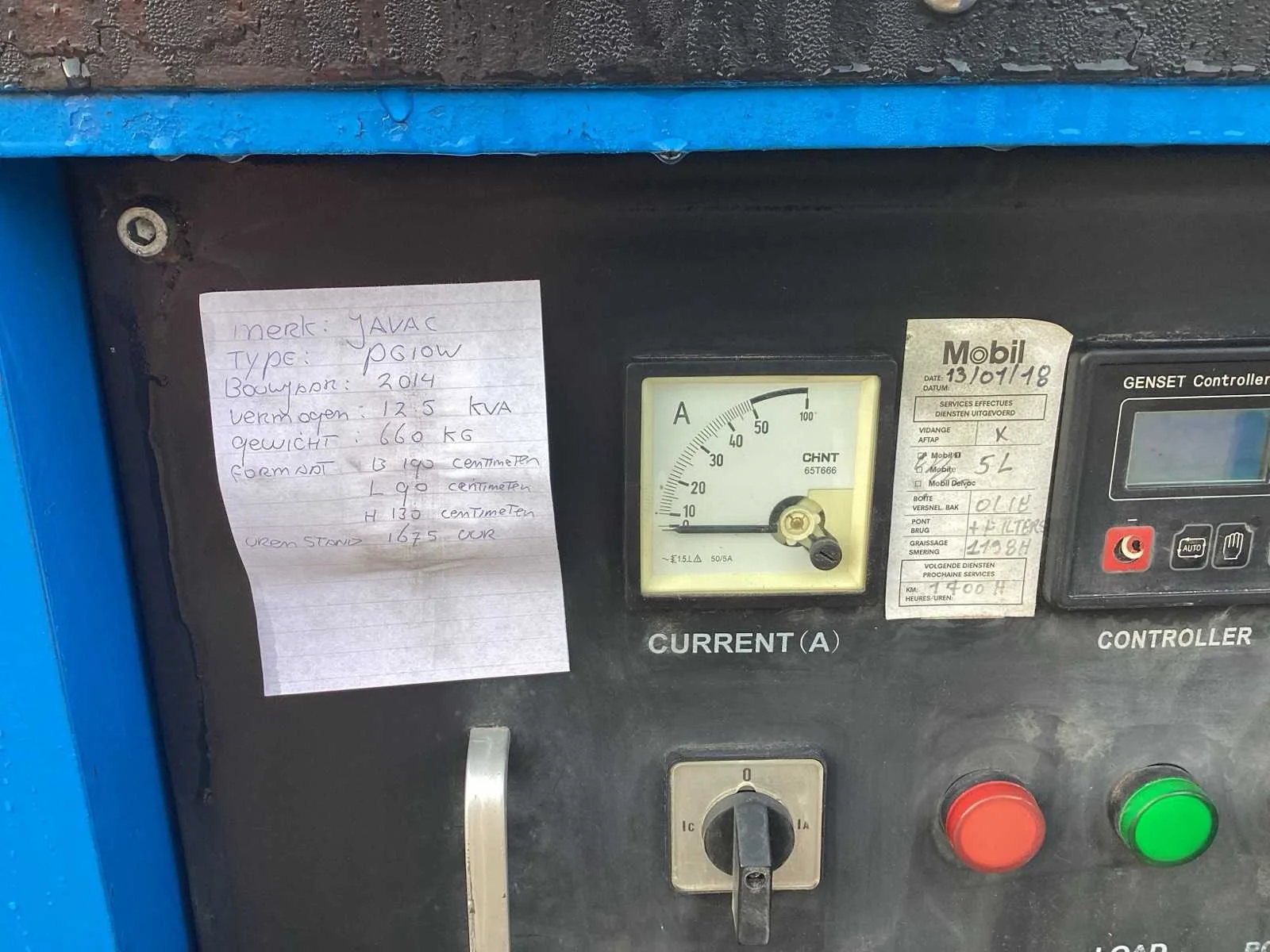 Merk: Javac Type: PG10W Bouwjaar: 2014 Capaciteit.: 125kVA Afgelezen urenstand: 1675 Machinegewicht: 660kg Totale afmeting L: 1900mm Totale afmeting Breedte: 900mm Totale afmeting Hoogte: 1300mm