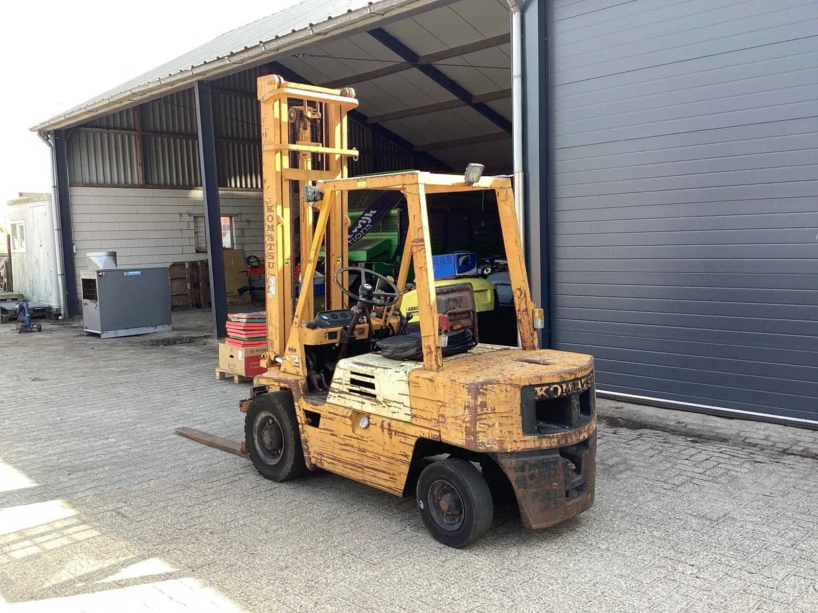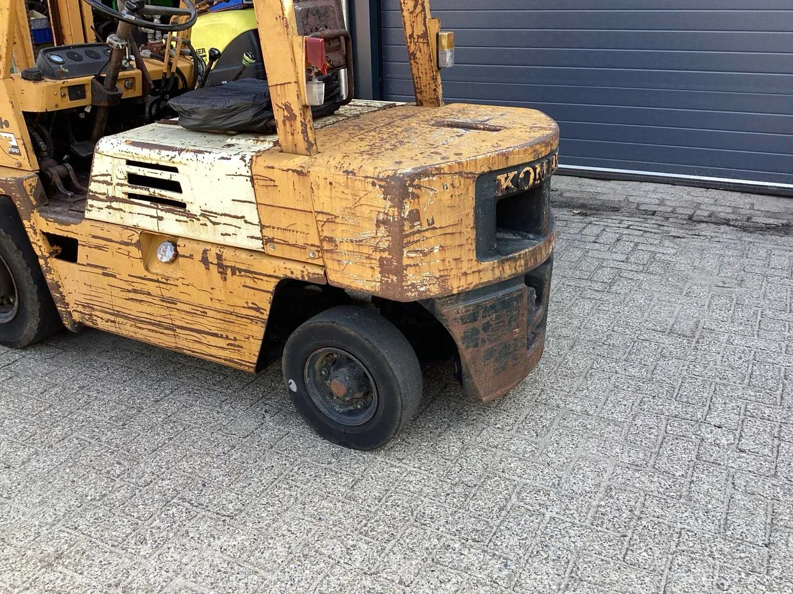 Voorzien van. Extra hydraulisch ventiel; werkverlichting; Merk: Komatsu Type: FD 25-7 Serienummer: 102109 Brandstof: Diesel Soort band: Volrubber banden Aantal wielen: 4 Eigen gewicht: 3750kg Hefvermogen: 2500kg Lepellengte: 1200mm Hefhoogte: 4600mm Vol rubber banden: true Minimale doorrijhoogte: 2800mm Totale afmeting Breedte: 1170mm Totale afmeting Hoogte: 2800mm Diesel: true