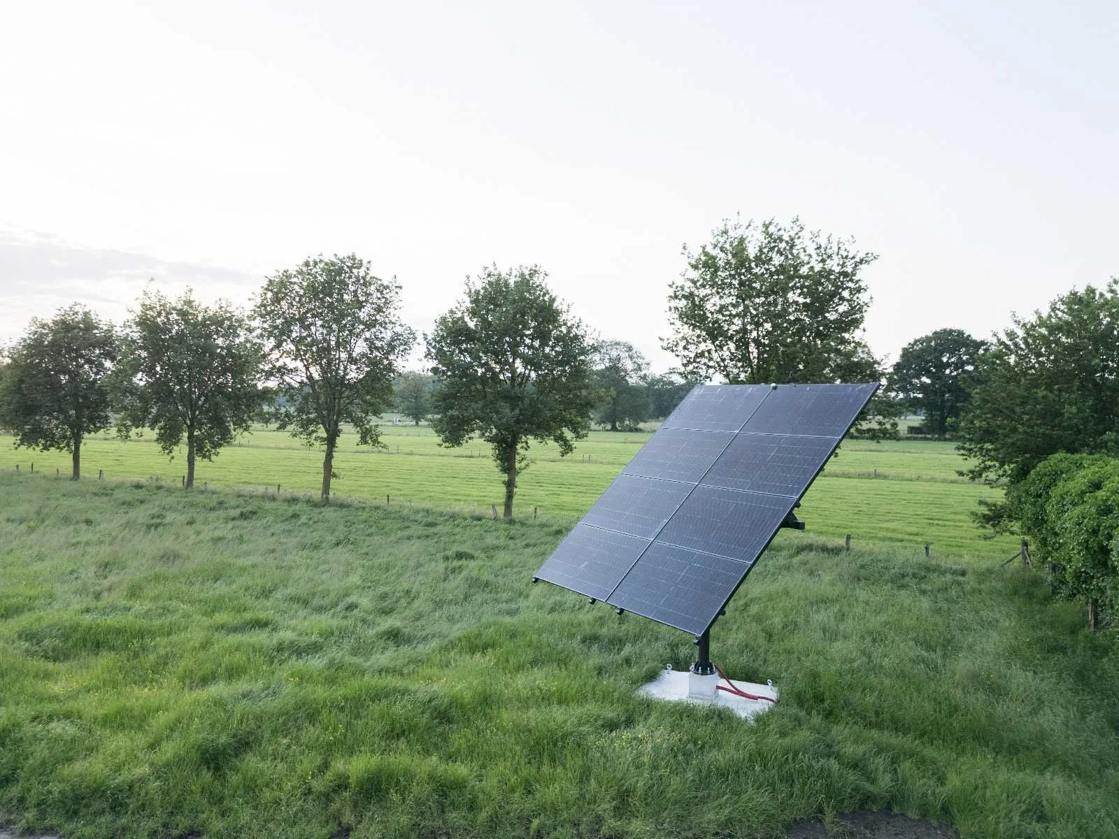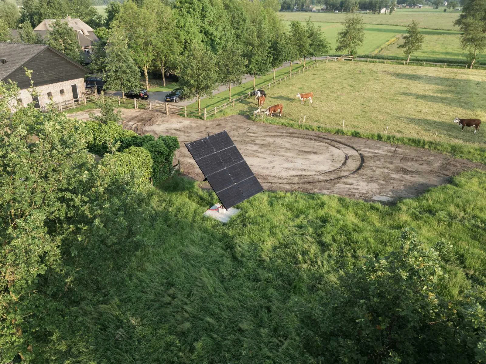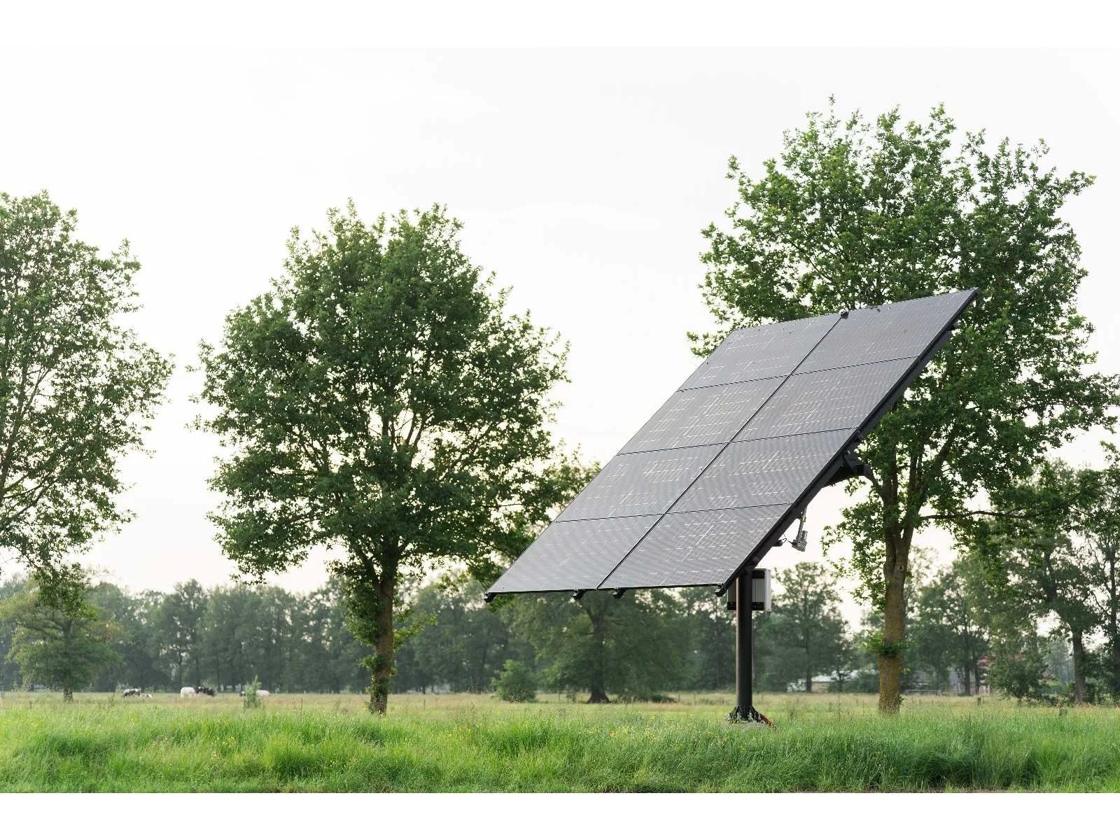 2-assige PV Tracker met 8 glas-glas zonnepanelen (425Wp per stuk) Deze 2-assige PV tracker volgt automatisch de zon – zowel draaiend als kantelend – waardoor je vanaf de vroege ochtend tot in de avonduren optimaal rendement behaalt. Leeftijd: slechts 1 jaar oud, zo goed als nieuw Afmetingen frame: 3,5m x 3,5m Afmetingen PV-opstelling: 4,2m x 4,2m Hoogte frame: 3,5m Panelen: 8 stuks glas-glas panelen van 425Wp (totaal 3.400Wp) Constructie: gegalvaniseerd staal met zwarte coating Werking: automatisch en handmatig instelbaar Waterdichtheid: IP65 Bewegingsbereik: 190° op de X-as (horizontaal) en 0–65° op de Y-as (verticaal) Levensduur frame: ca. 20 jaar Extra’s: Wordt geleverd inclusief alle materialen zoals afgebeeld. De tracker wordt technisch gedemonteerd. De betonvoet kan desgewenst worden meegeleverd (niet verplicht).