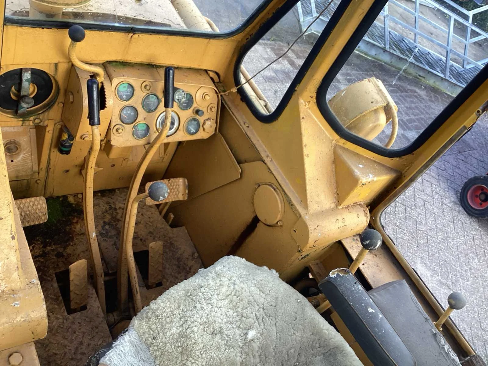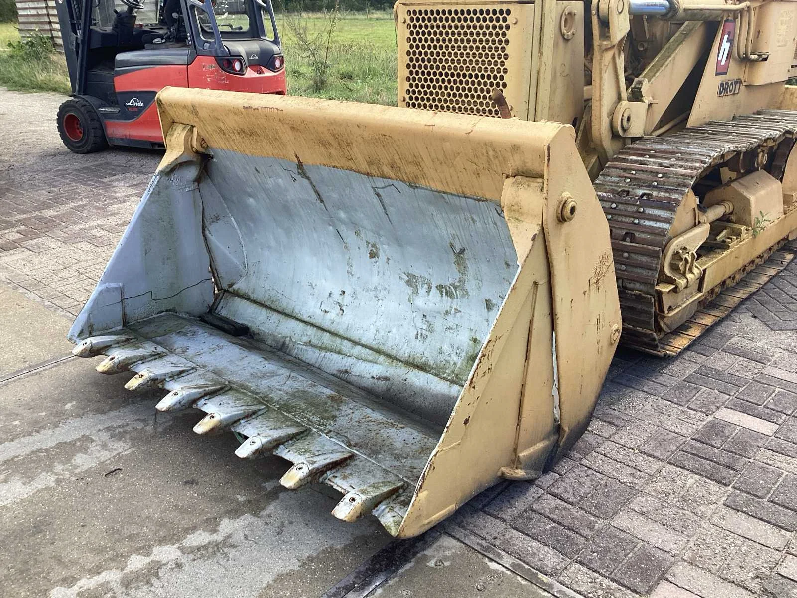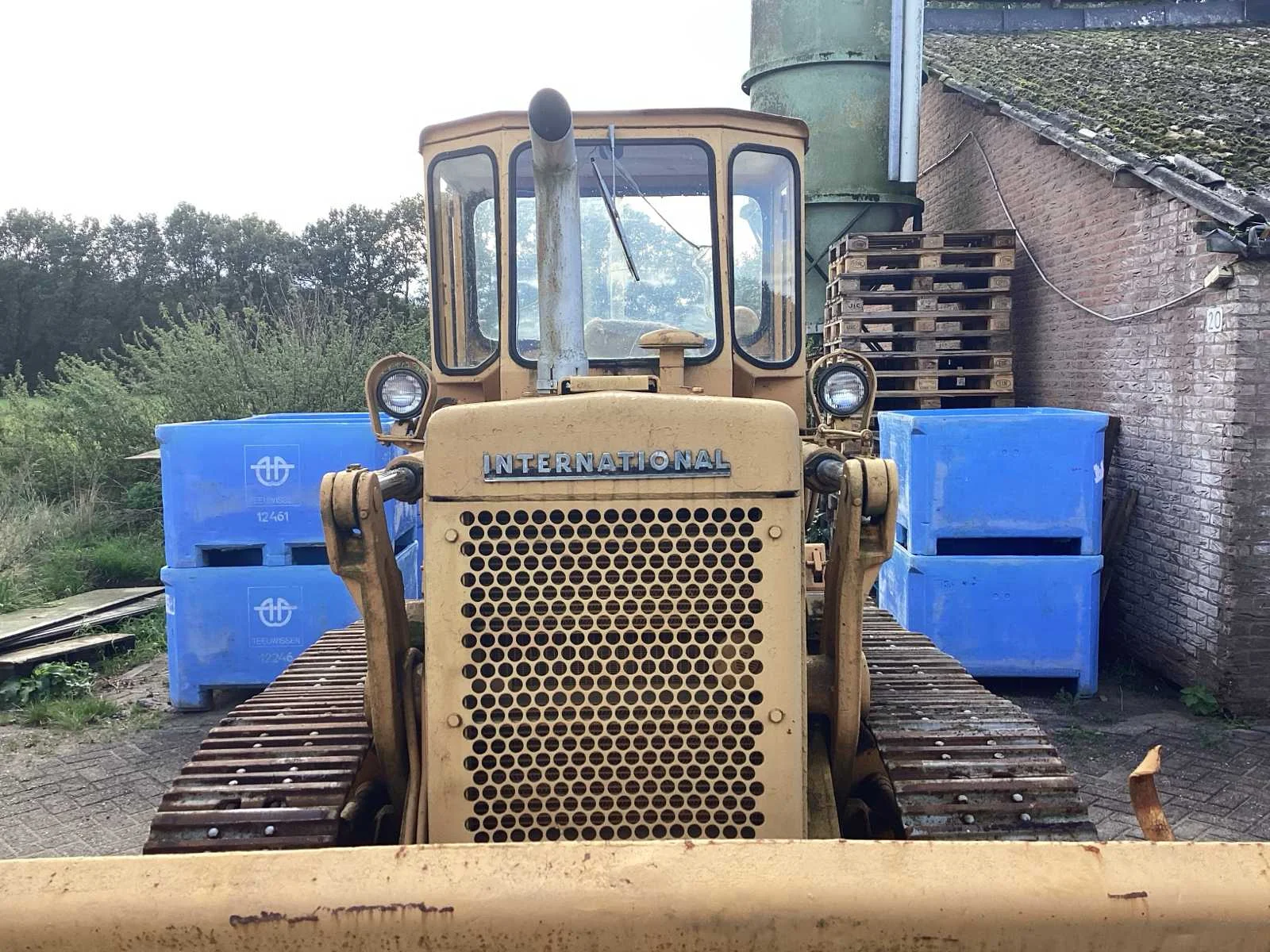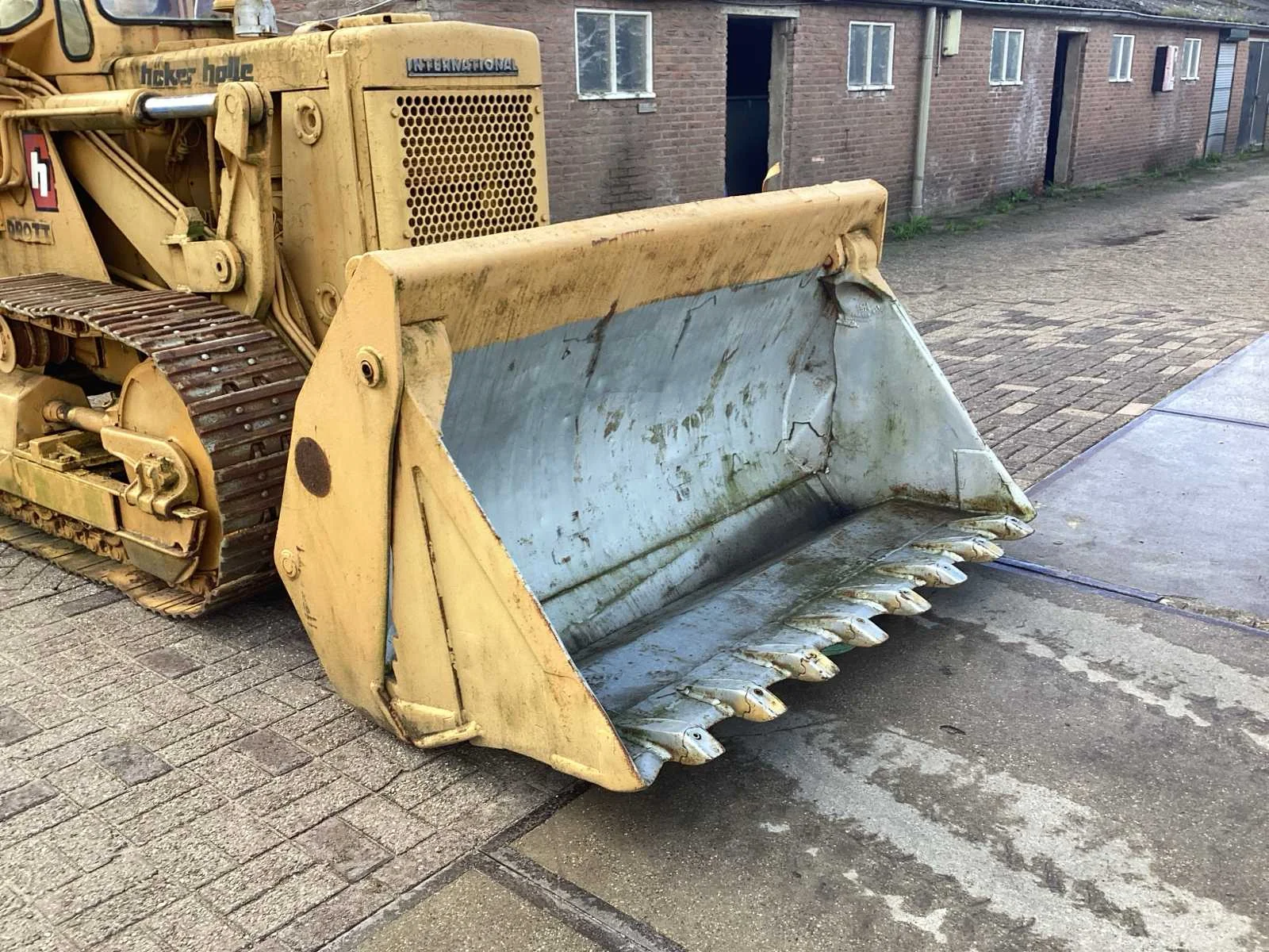 V.v. woeler; 3 standen bak; motor loopt; machine rij niet voor of achteruit Merk: International Type: 150 loader Aantal cilinders: 6 Totale afmeting L: 5200mm Totale afmeting Breedte: 2000mm Graafbak afm. b: 2000mm Totale afmeting Hoogte: 2650mm Eigen gewicht: 9000kg Cabine: true Bandenmaat: Rupsen Brandstof: Diesel